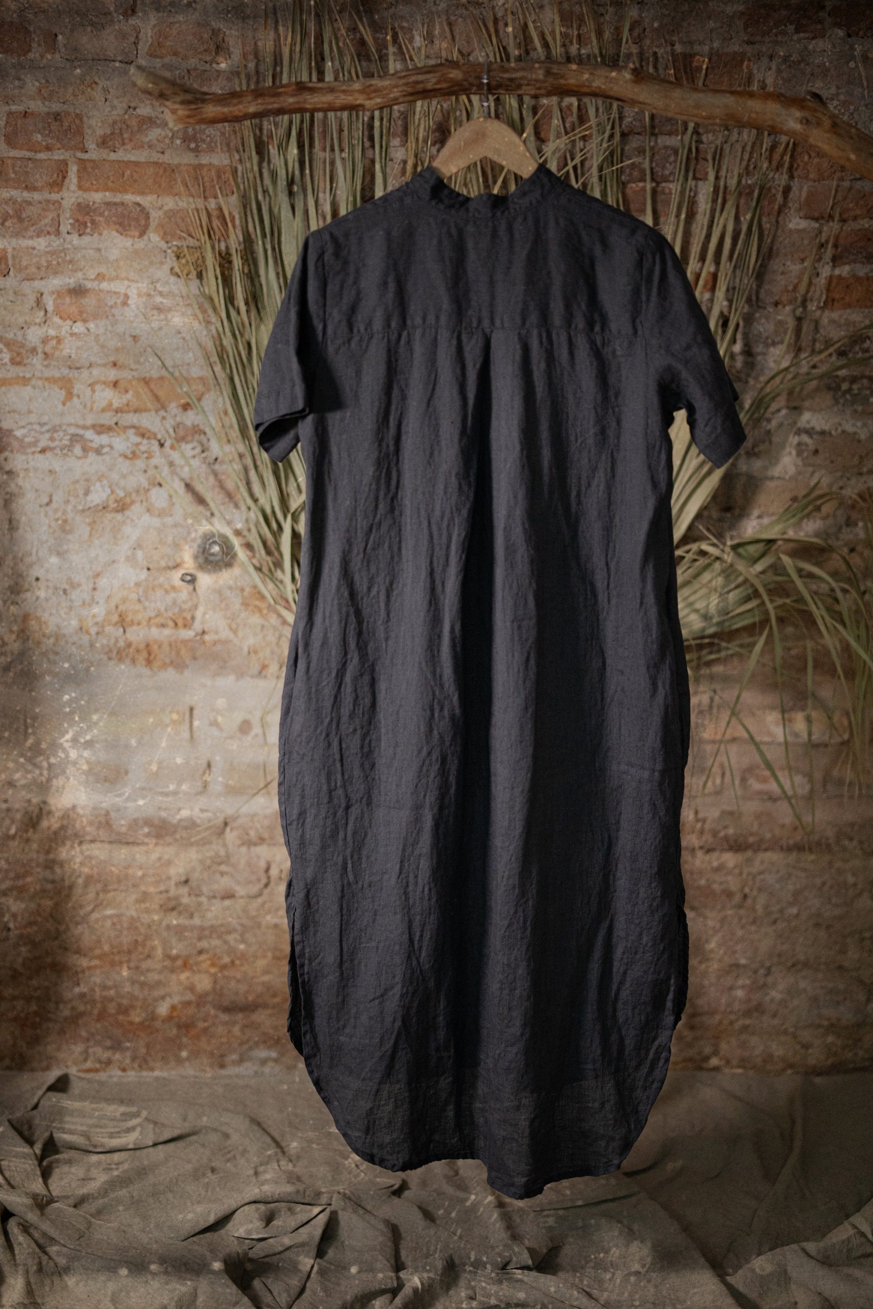 The loose linen button-up Lighthouse dress is made from 100% linen fabric. It features short sleeves, practical side seam pockets, side slits, and a slightly longer back. Versatile in design, it can be worn as a dress, duster, light coat, or jacket.