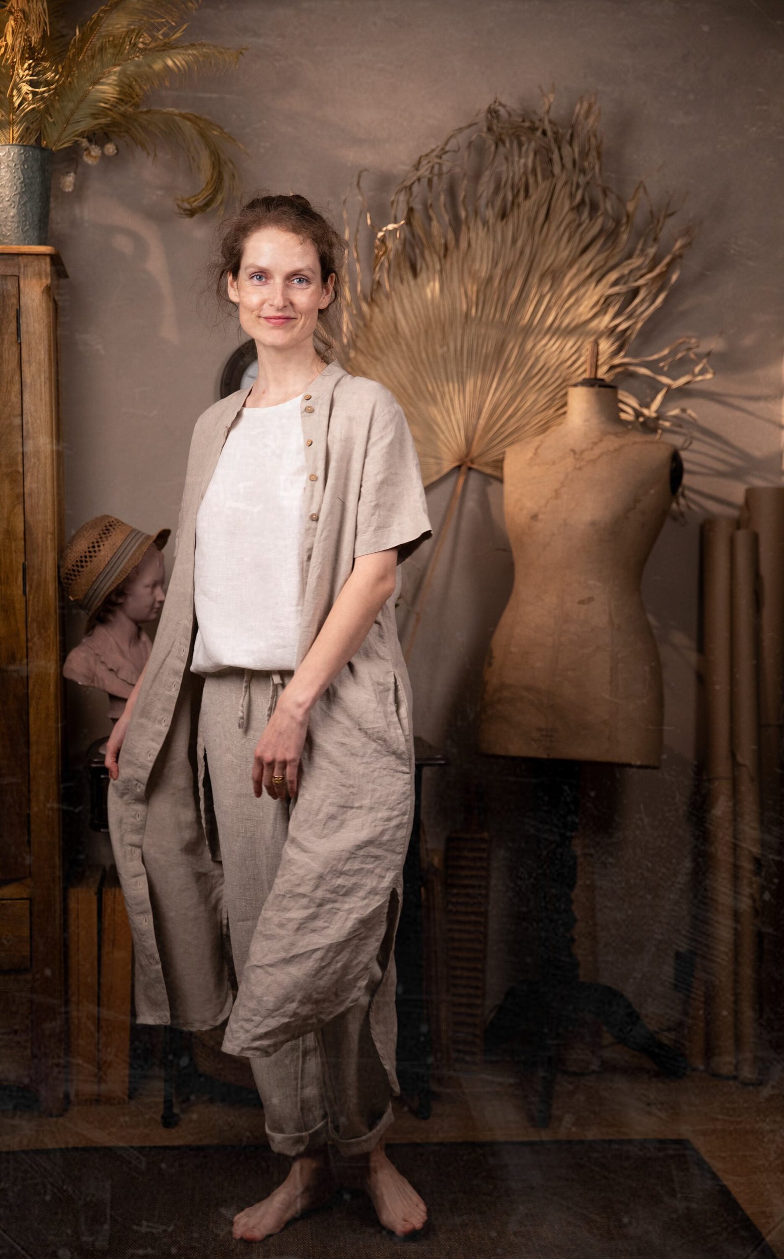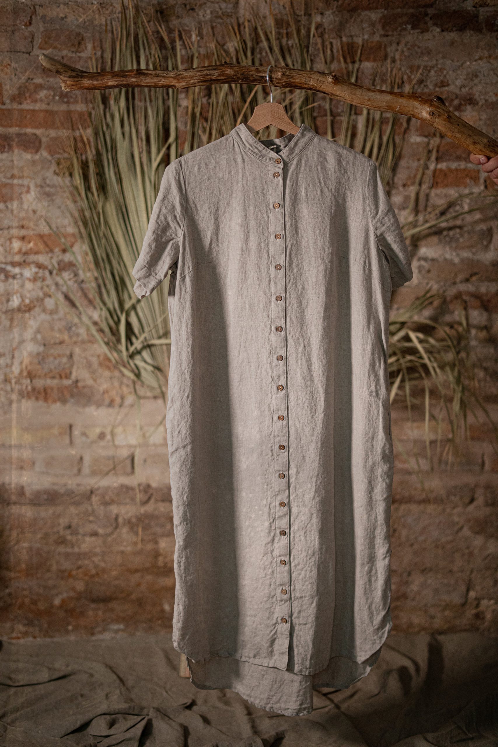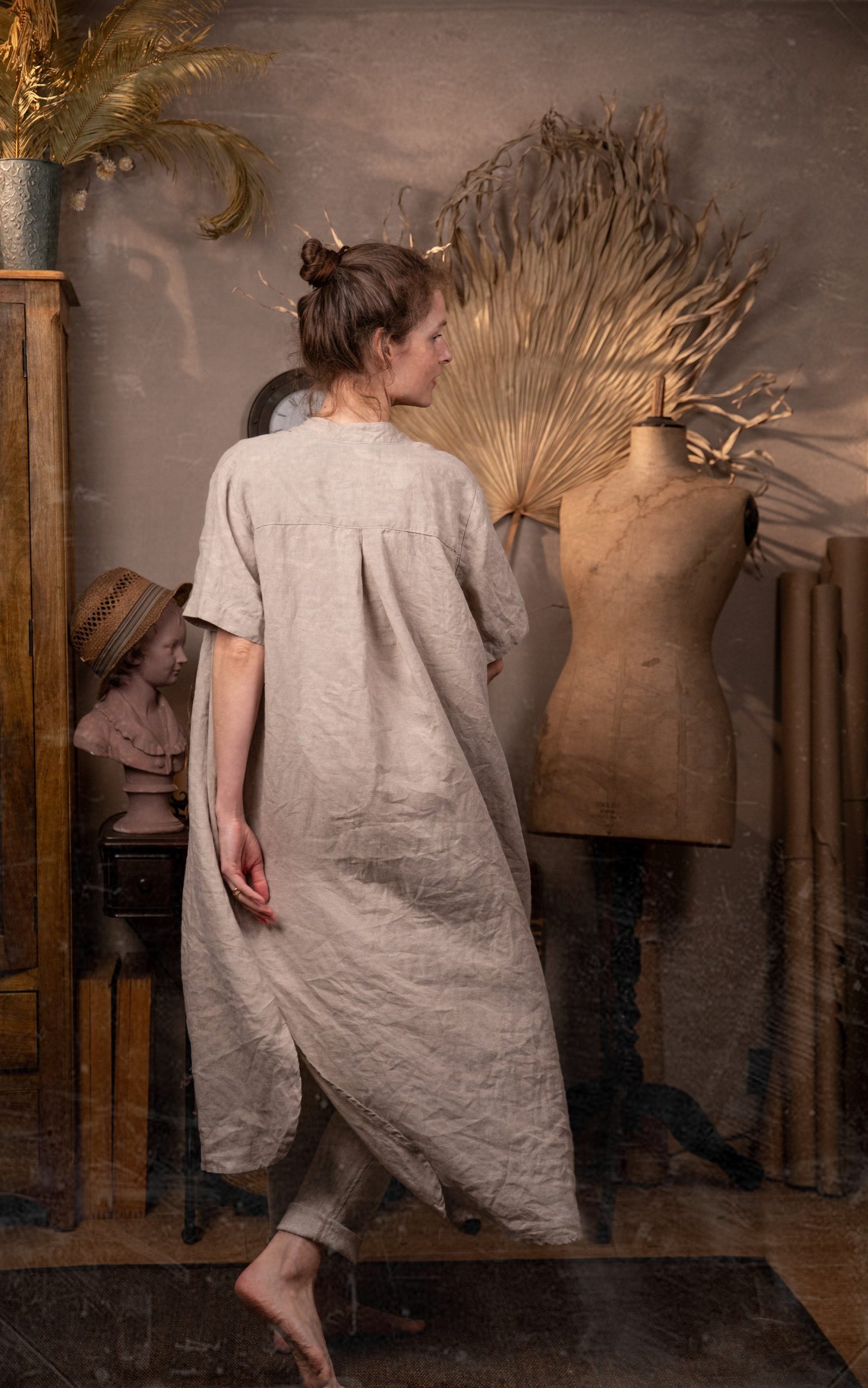 Button down linen dress Lighthouse is made of high-quality linen fabric. It has a buttoned front, short sleeves, side seam pockets for comfort. The dress has a longer backside. It goes well with simple dresses or pants, as it can be worn as a duster, light coat, or jacket.