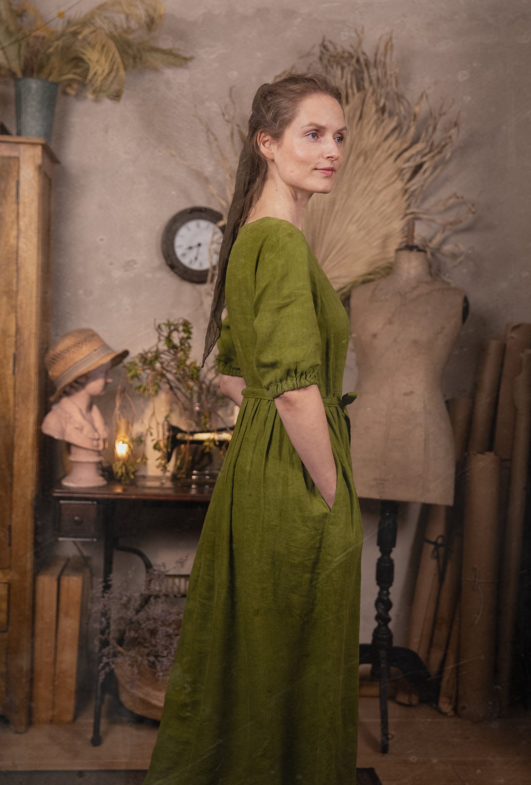 The dress features a fitted bodice with functional buttons all the way down, a V-neck, half-length sleeves with an elastic hem, side seam pockets for comfort, a gathered skirt, and a belt to cinch the waist that gives the dress a vintage flair. A beautiful design and effortless elegance…