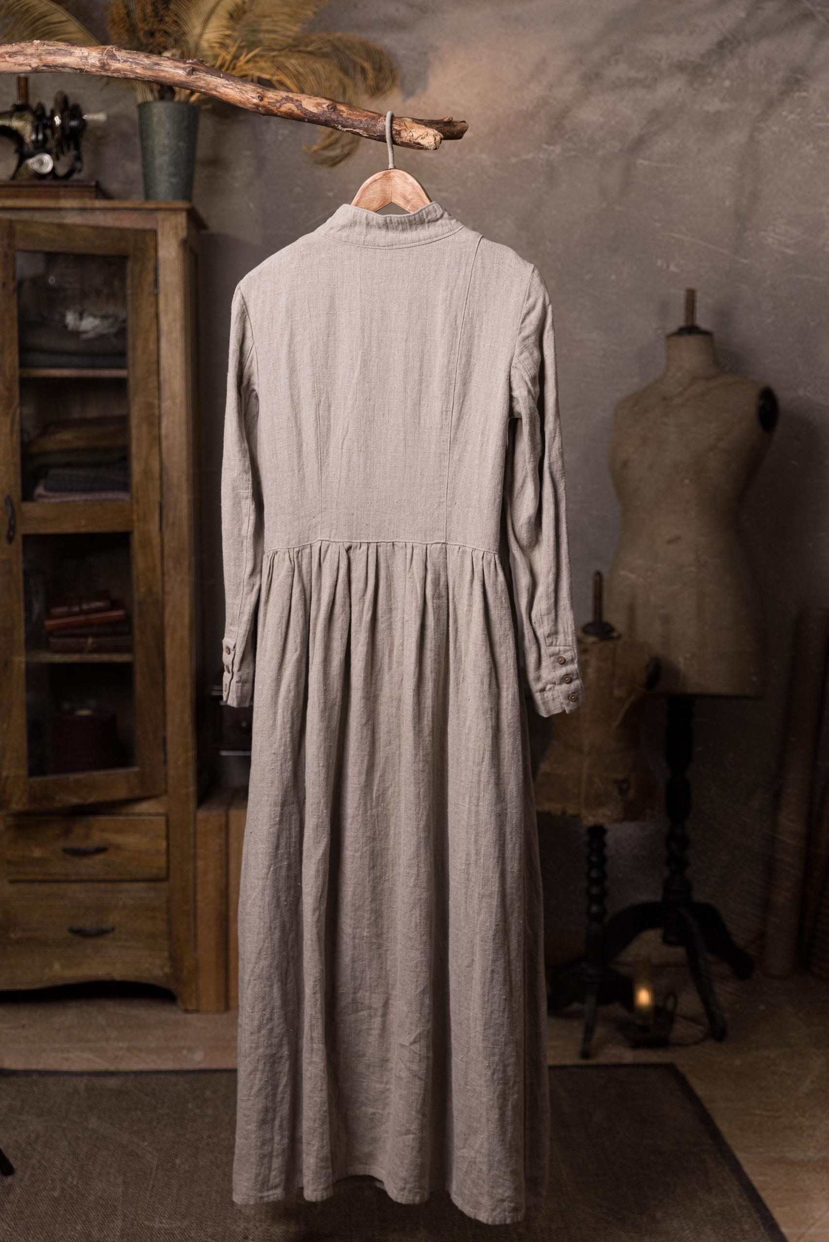 The Victoria linen dress features a fitted bodice with a button-front, a mandarin-style collar, long sleeves with buttoned cuffs, side-seam pockets for comfort, and a gathered maxi skirt.