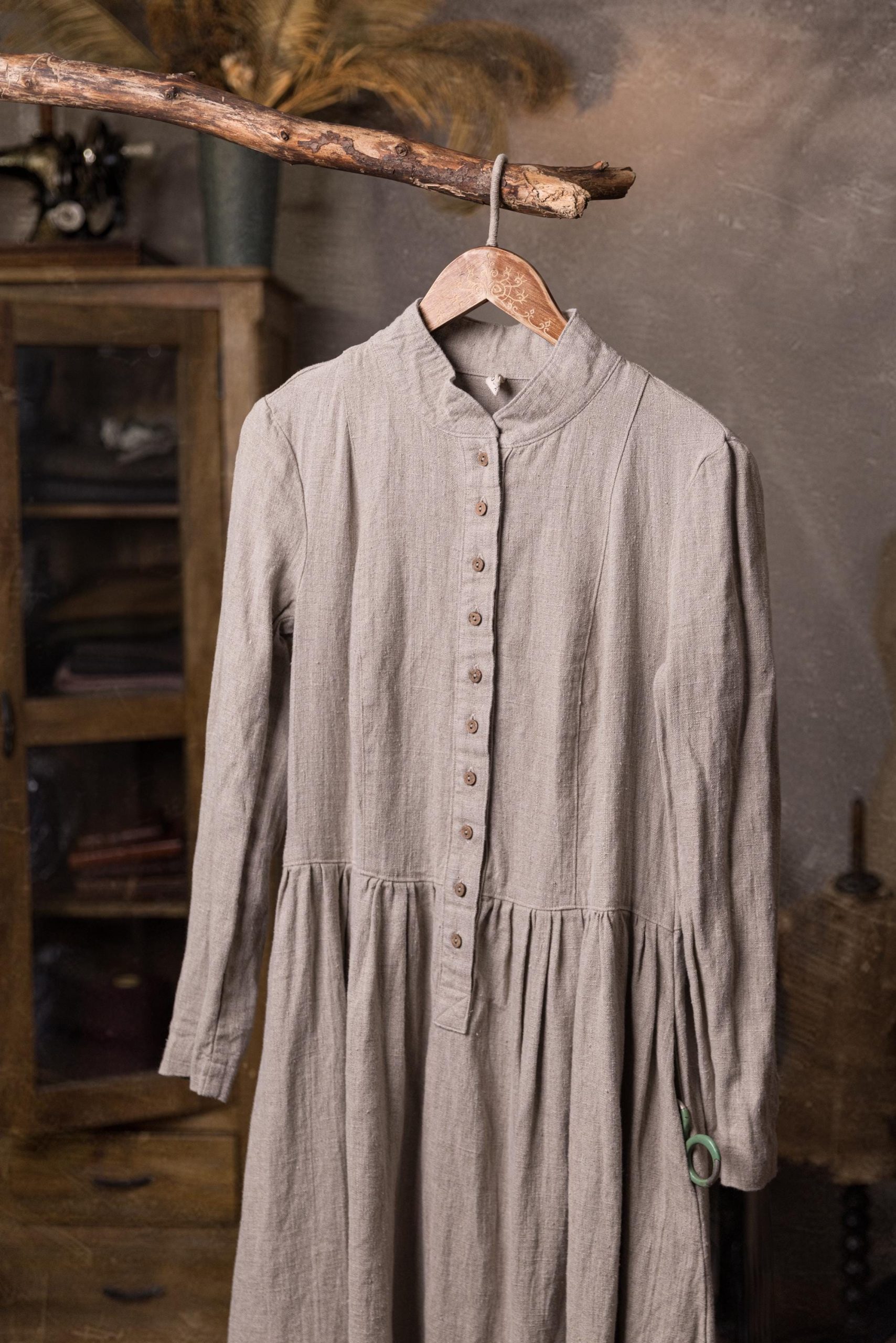 It looks like an antique linen dress, like a piece of treasure from a historical museum. You can order the dress in heavyweight linen for winter or in medium and lightweight for warm weather.