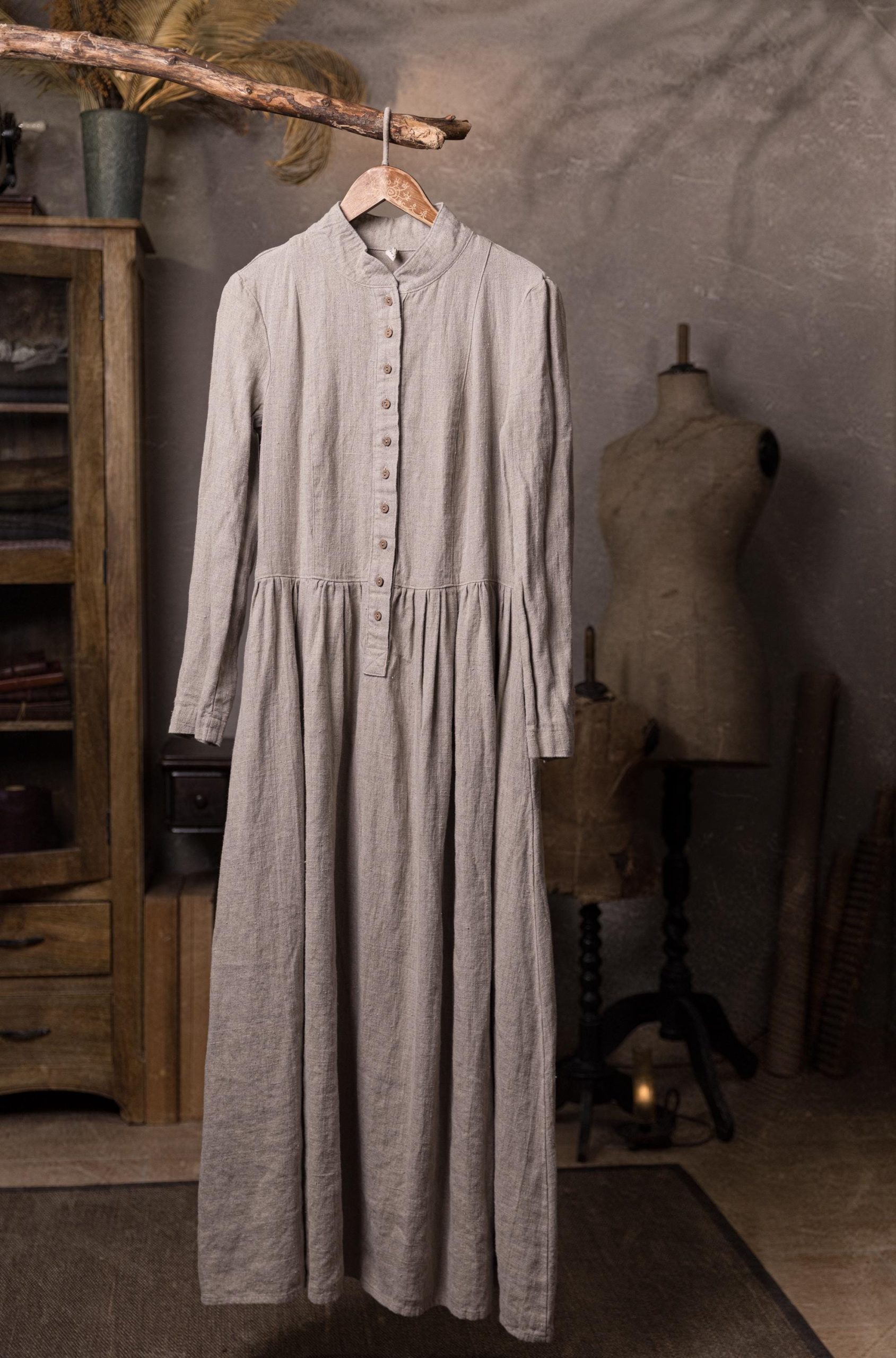 The Victoria linen dress features a fitted bodice with a button-front, a mandarin-style collar, long sleeves with buttoned cuffs, side-seam pockets for comfort, and a gathered maxi skirt.