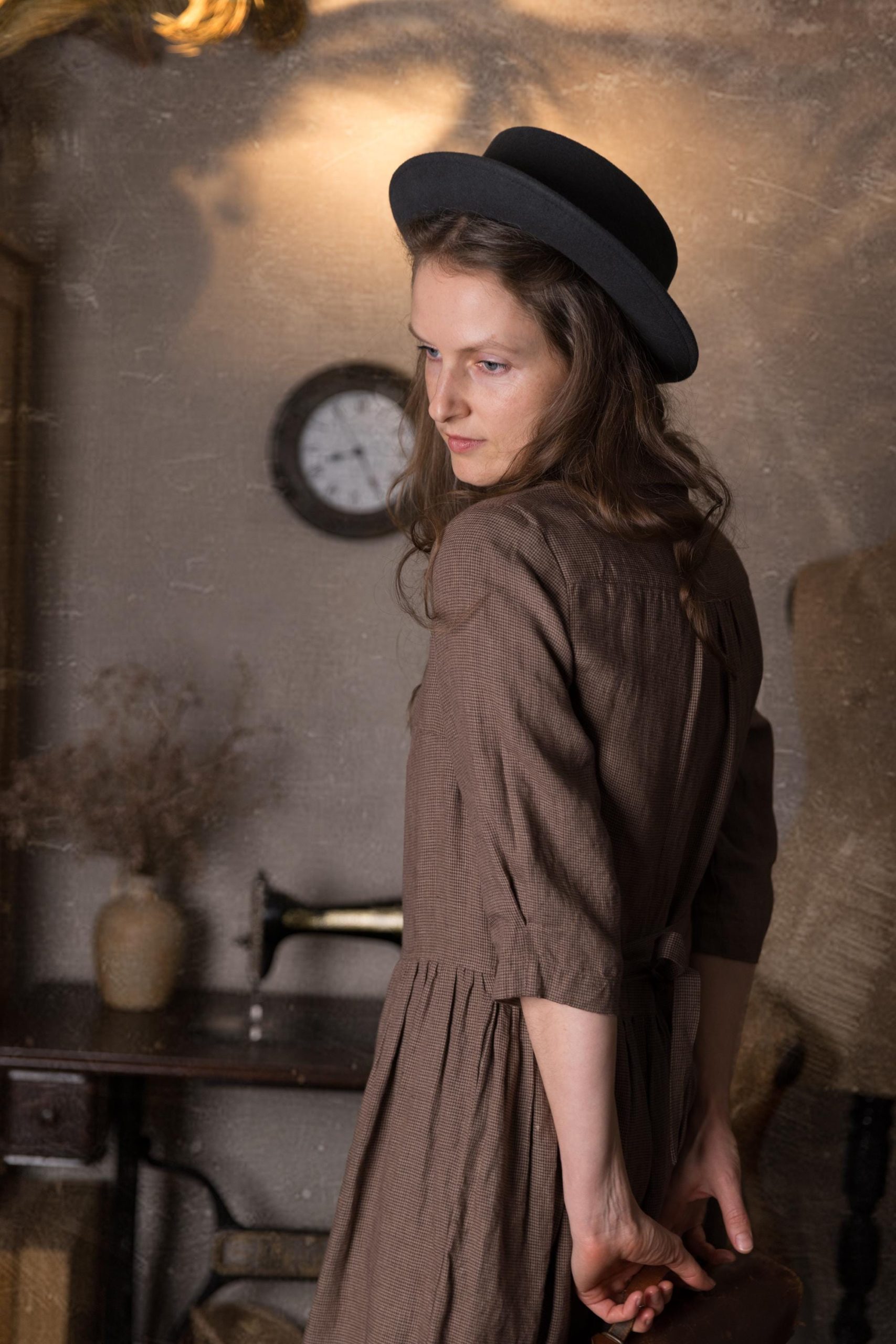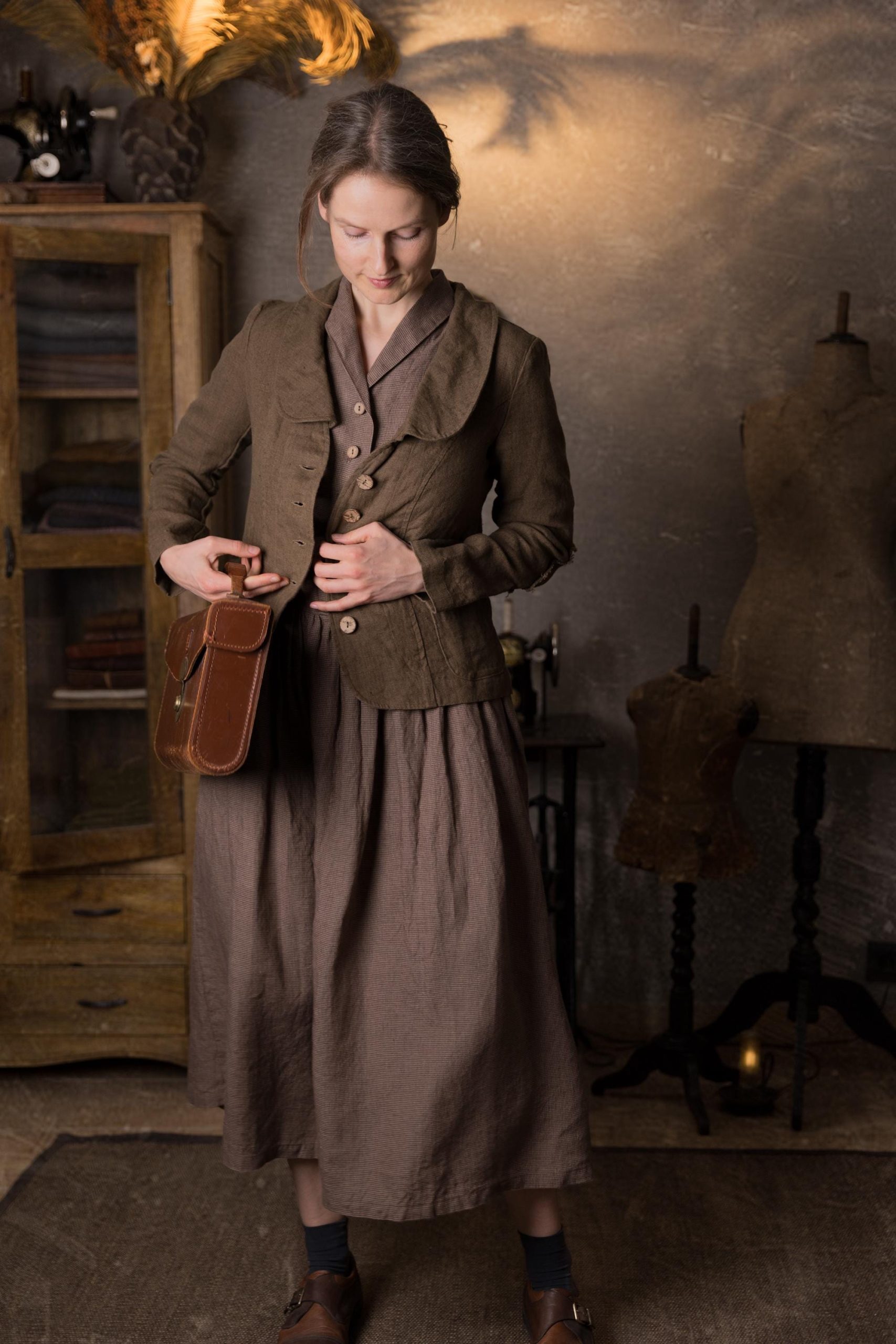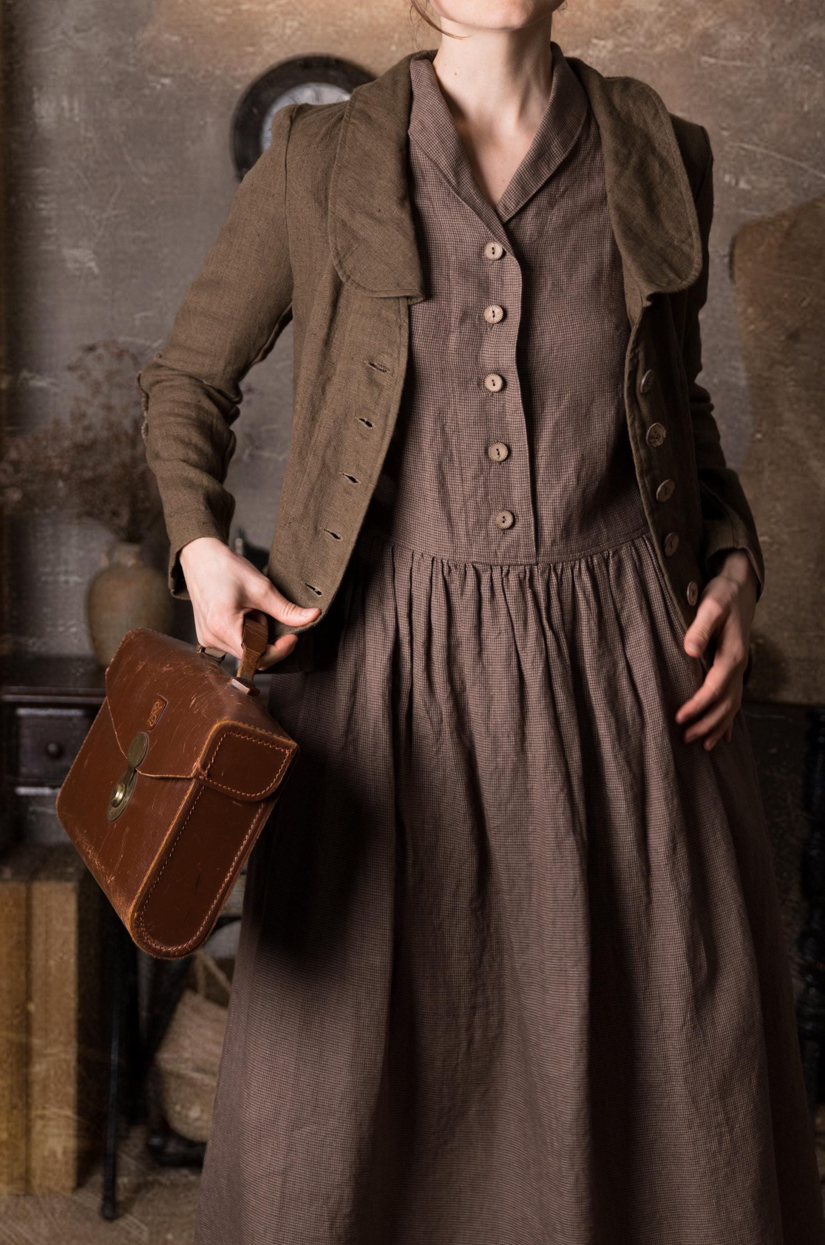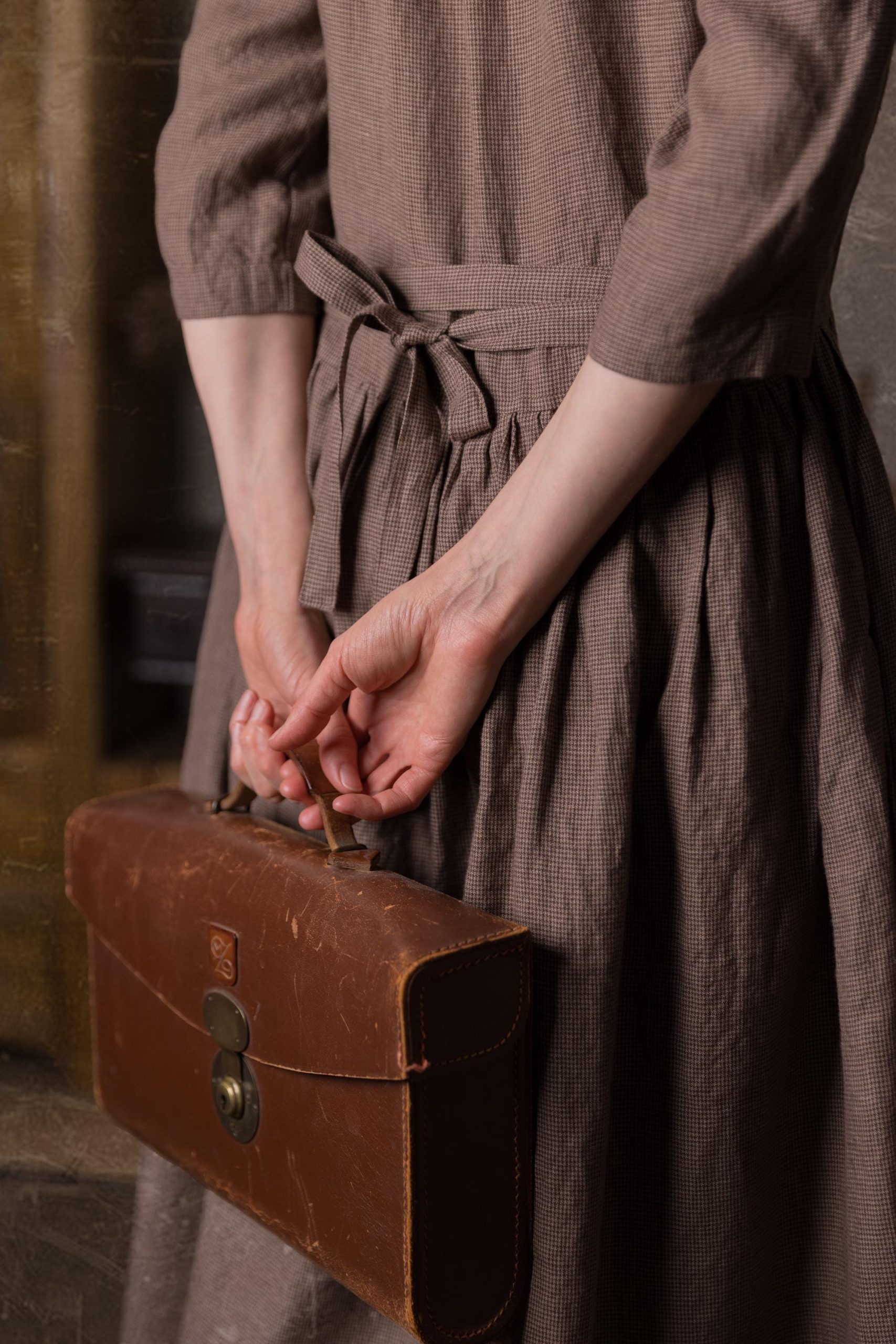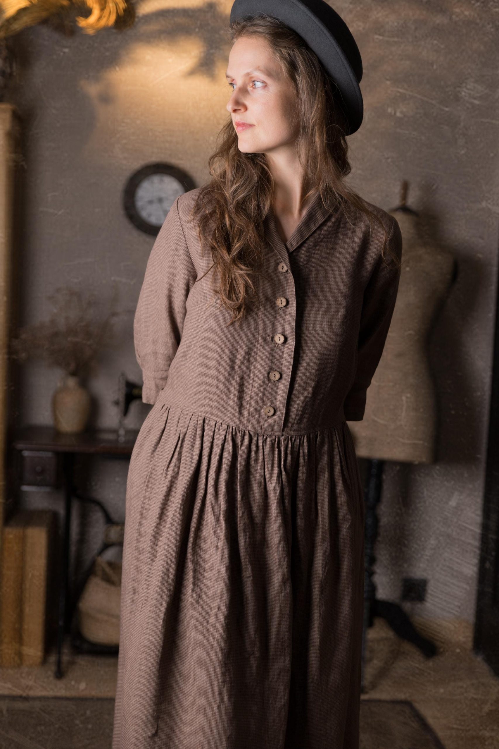 The retro linen dress Voyage is a timeless, iconic piece inspired by the 1930s–1940s. This classic design features a romantic and flattering silhouette, a buttoned bodice, a V-neckline with a shawl collar, 3/4-length sleeves, a softly gathered skirt, comfortable side-seam pockets, a tie belt, and a mid-calf length. It can also be made in a custom length upon request.