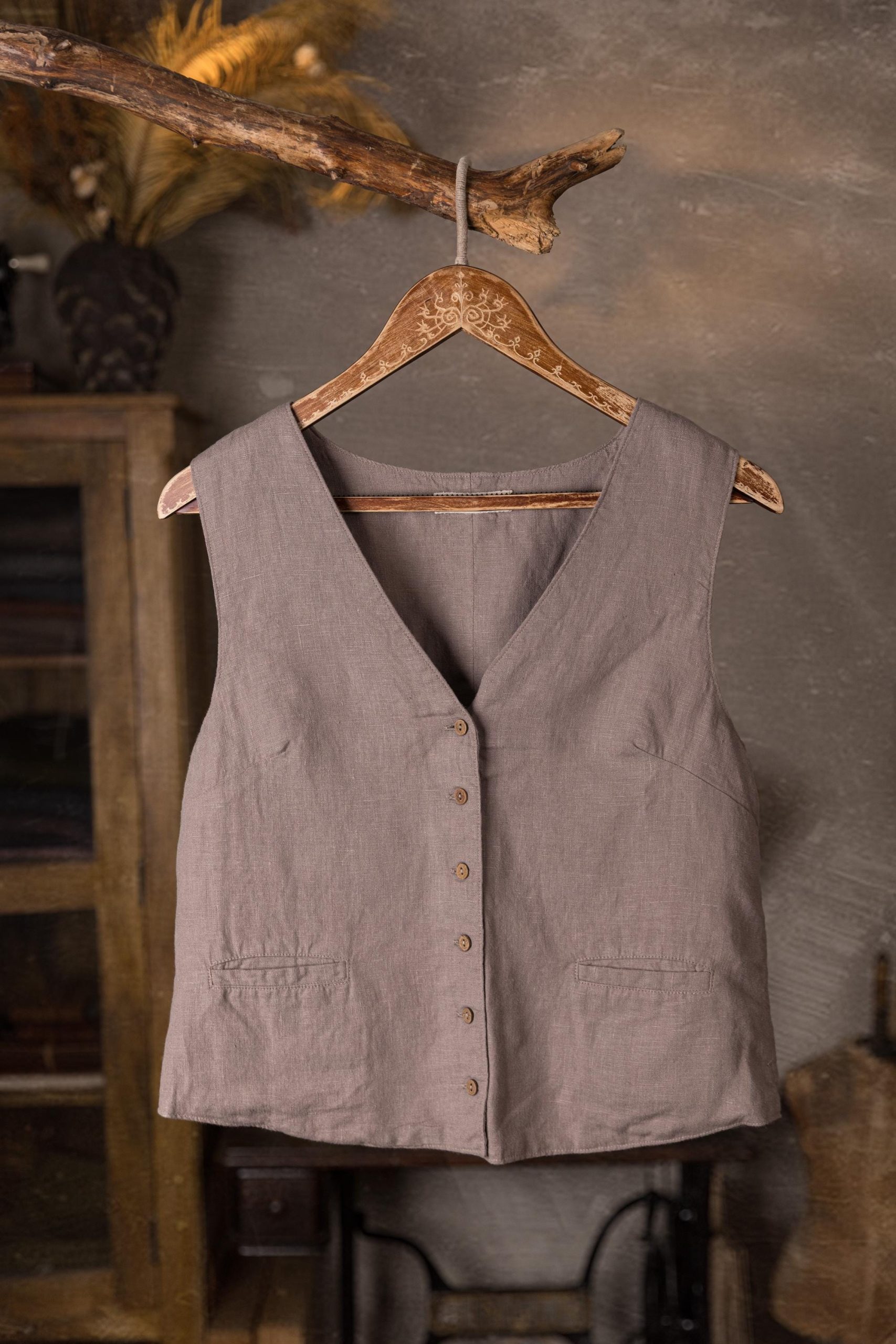 Buttoned linen waistcoat with a boxy fit, two welt pockets and a simple slit at the back.