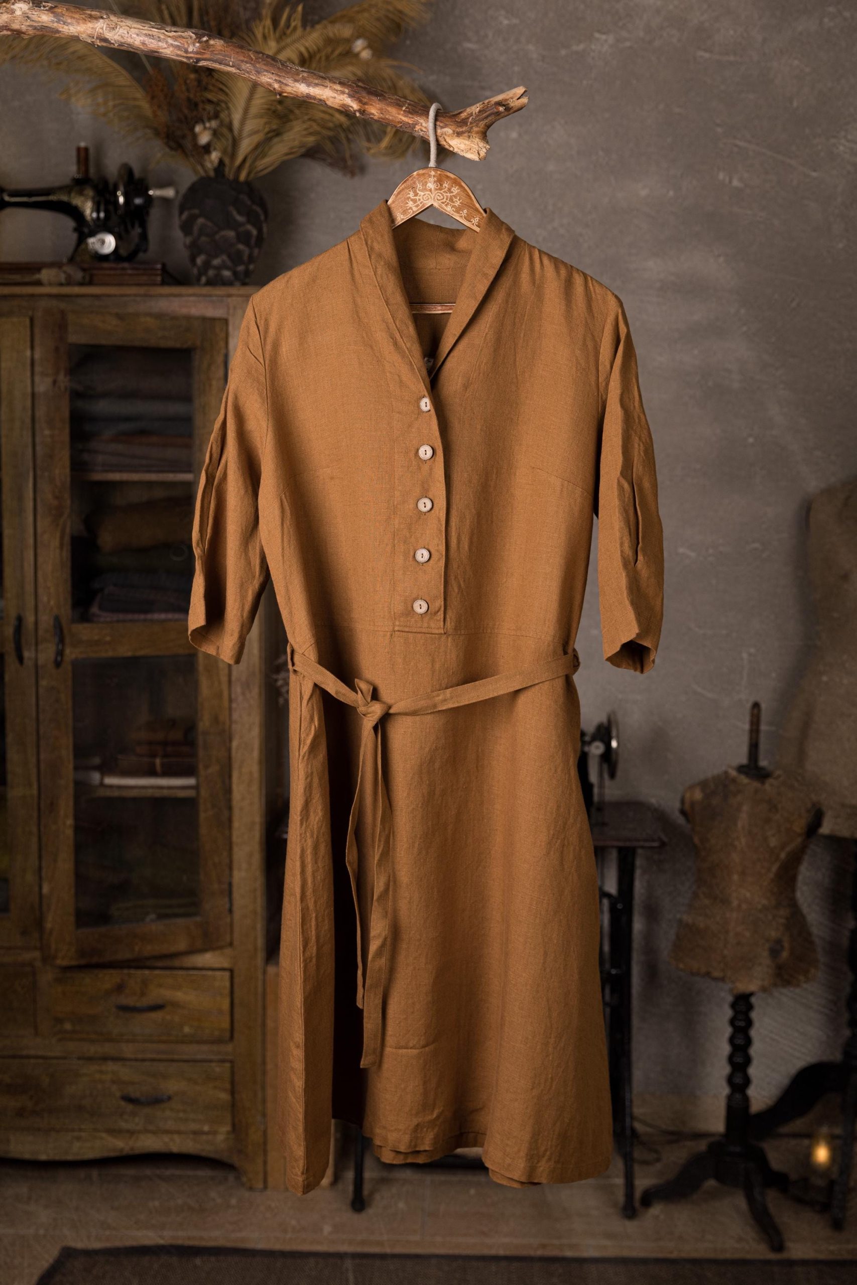 The retro linen dress Studio is a timeless and iconic piece from the 1930s-1940s. This classic dress has a simple yet flattering shape and features a buttoned bodice, V-neck with a shawl collar, 3/4-length sleeves, side seam pockets for comfort, a tie belt, and a below-the-knee length, but it can also be made in a custom length.