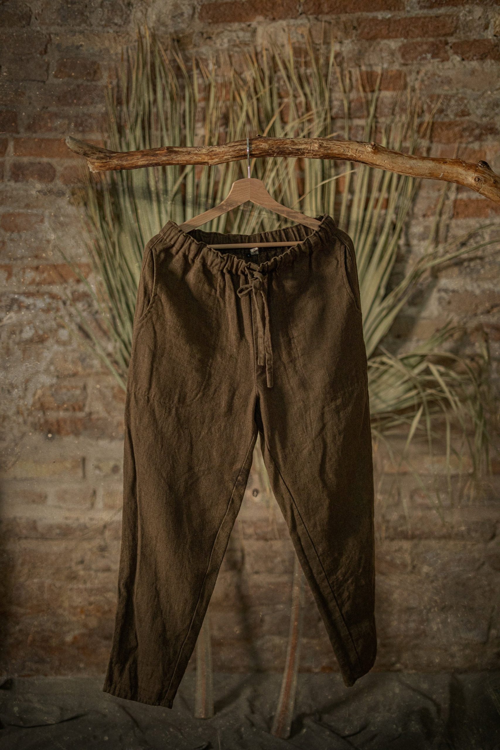 The perfect loose pants are made of high-quality linen fabric, designed with two side pockets and one at the back. It is loose at the hips and tapered at the ankles. It is easy to wear as it has an elastic drawstring waist.