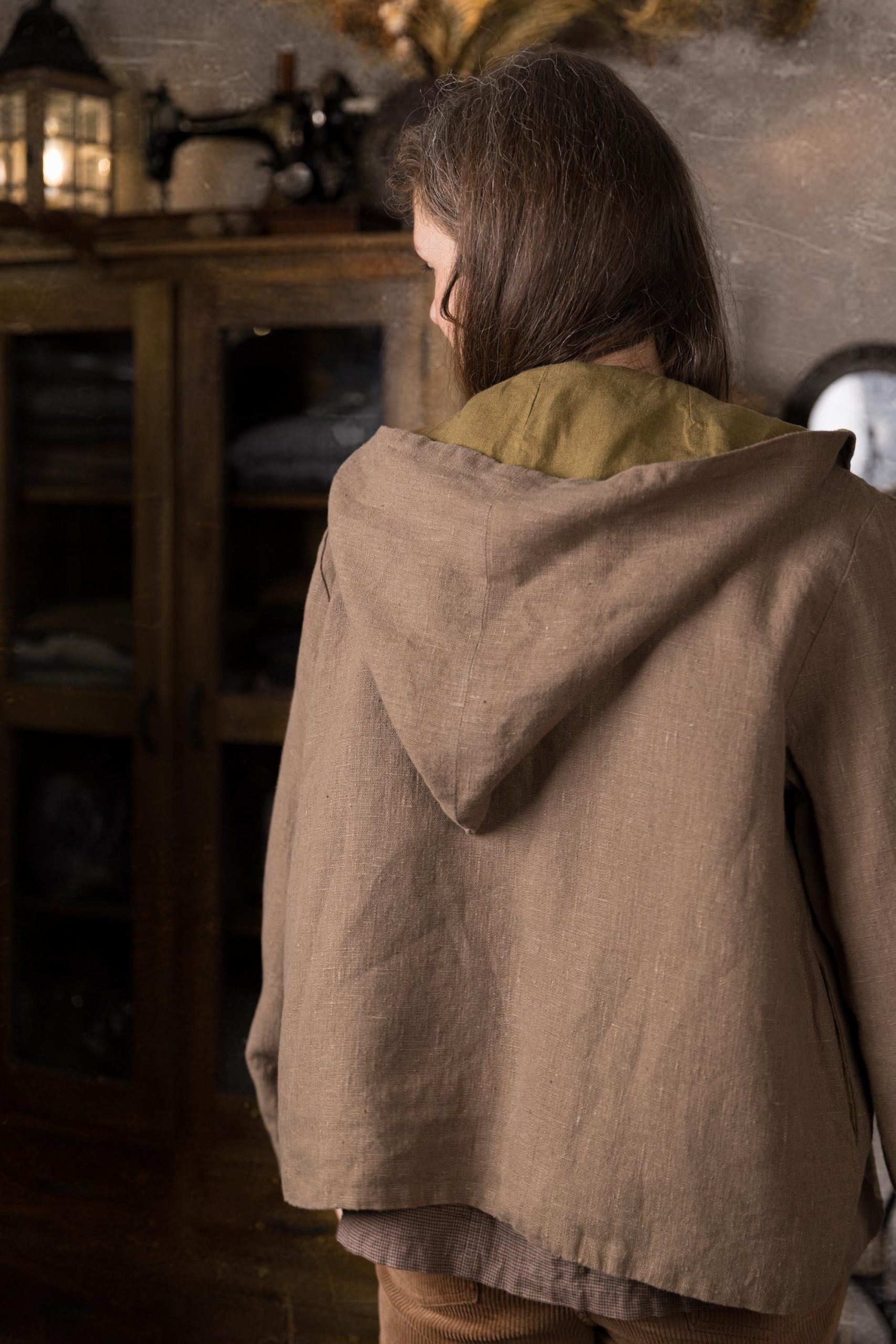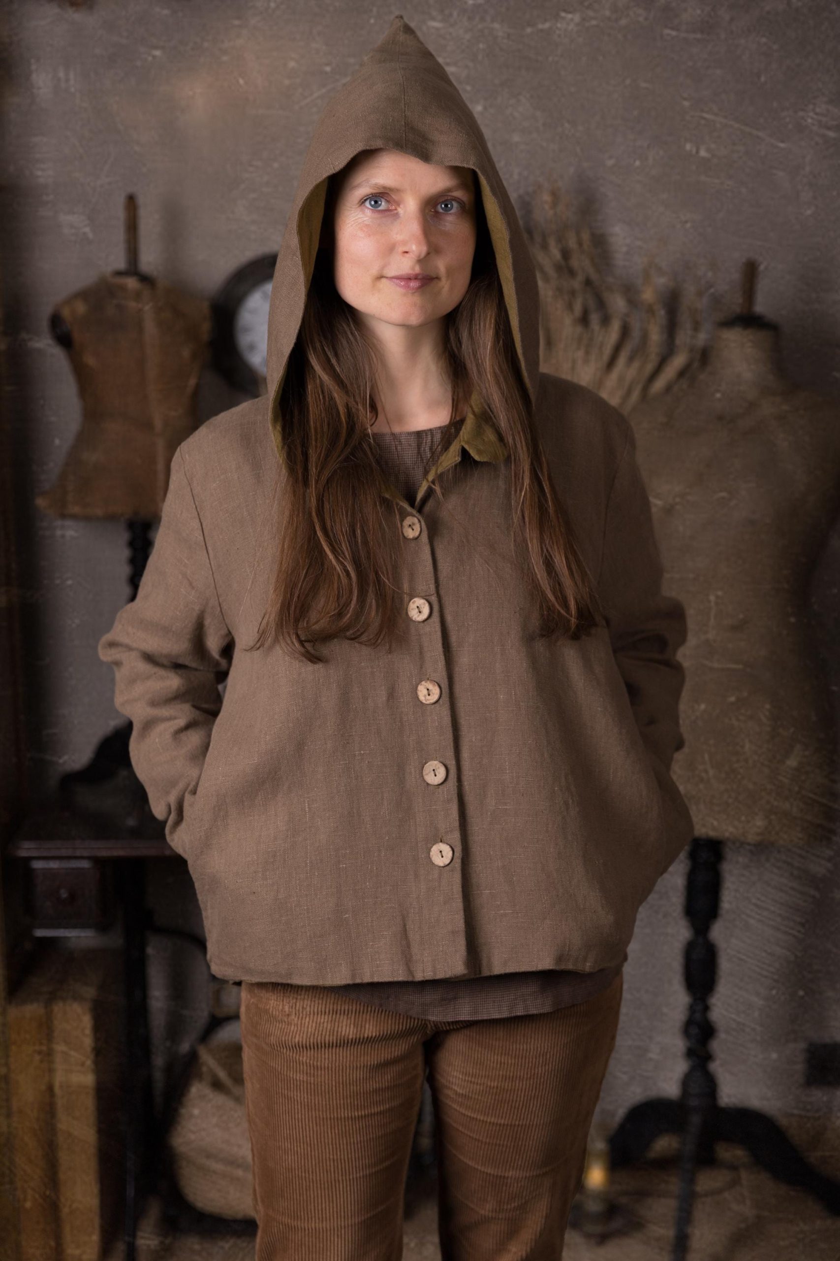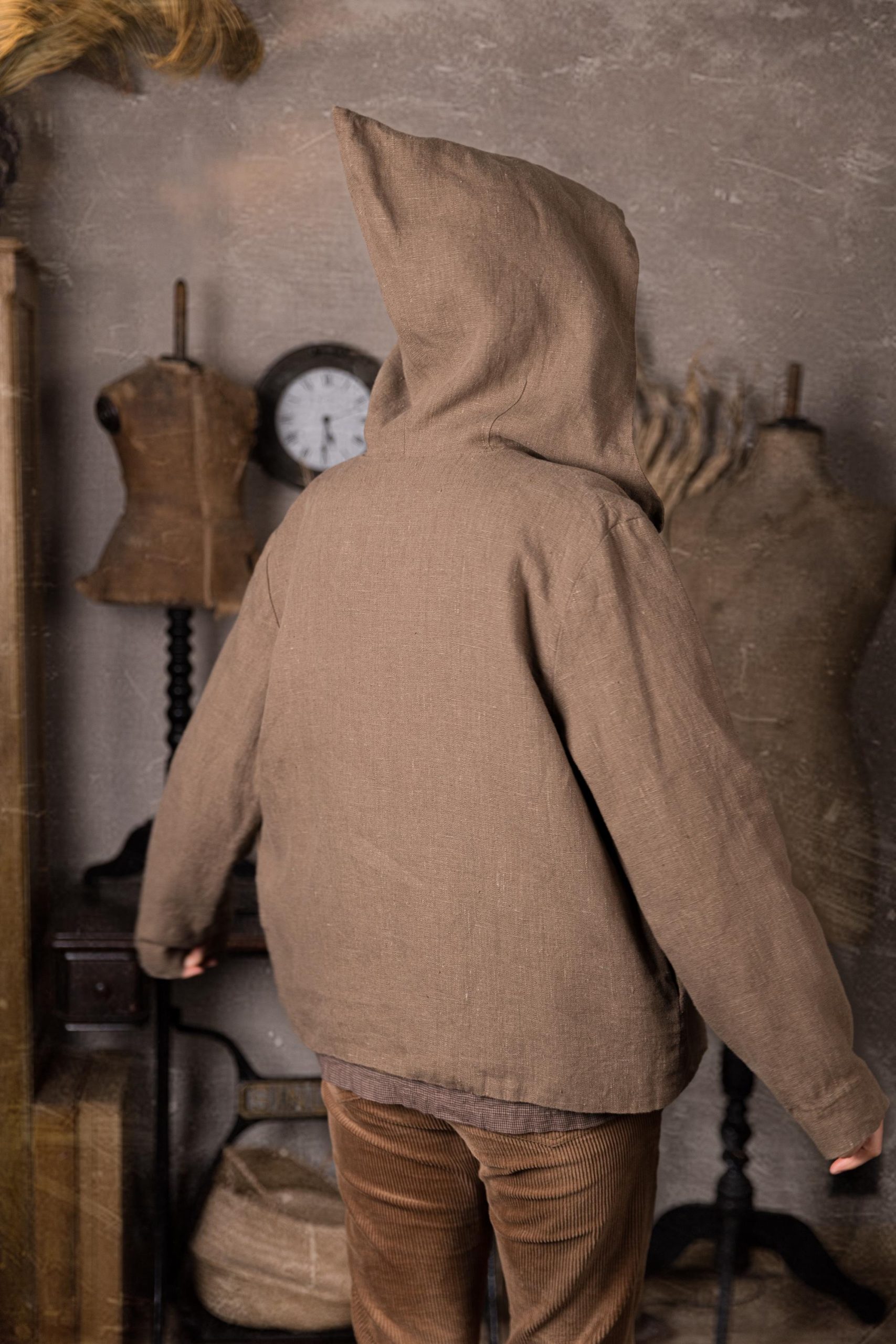 The coat is made from a heavier linen fabric with a beautiful, natural slub texture and is fully lined with medium-weight linen. It features side pockets and a large pixie-style pointed hood to protect you from rain and wind.