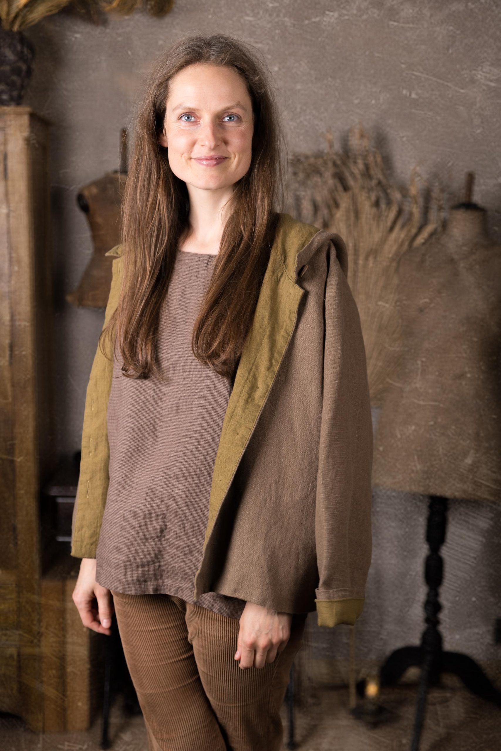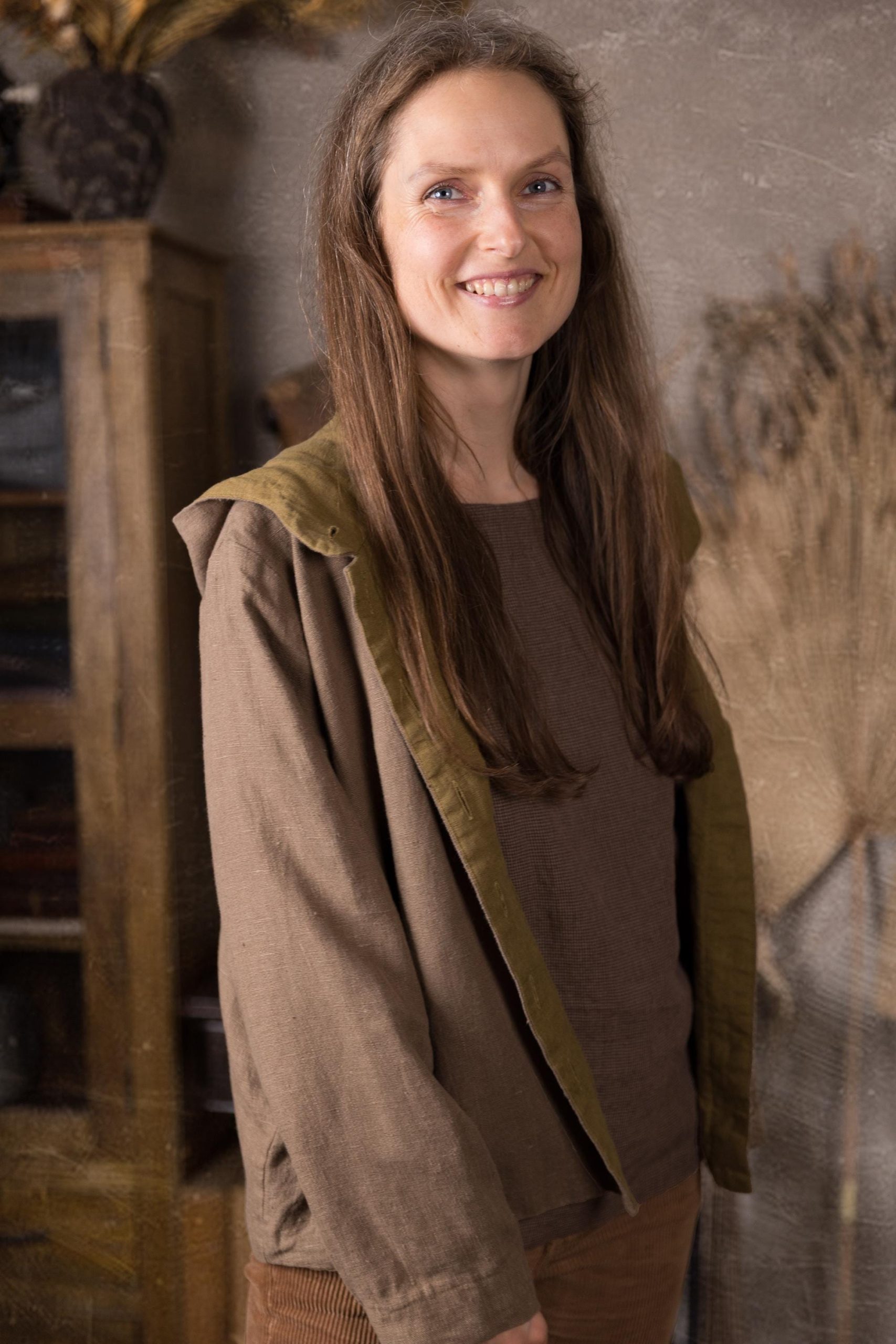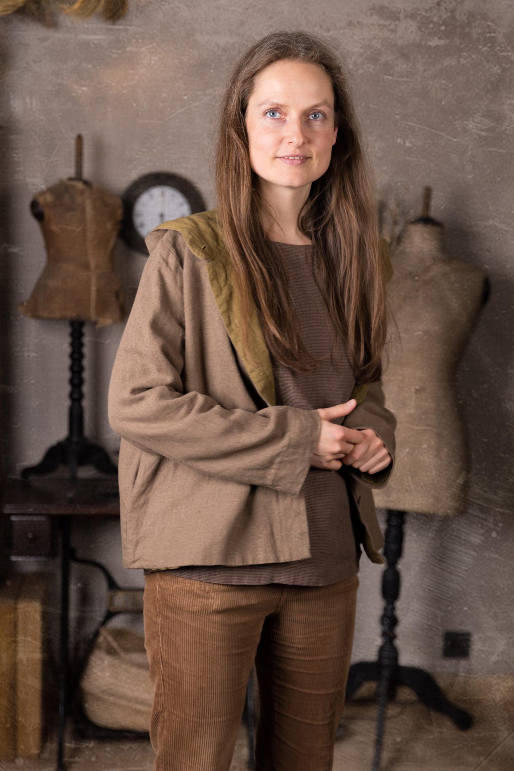 The coat is made from a heavier linen fabric with a beautiful, natural slub texture and is fully lined with medium-weight linen. It features side pockets and a large pixie-style pointed hood to protect you from rain and wind.