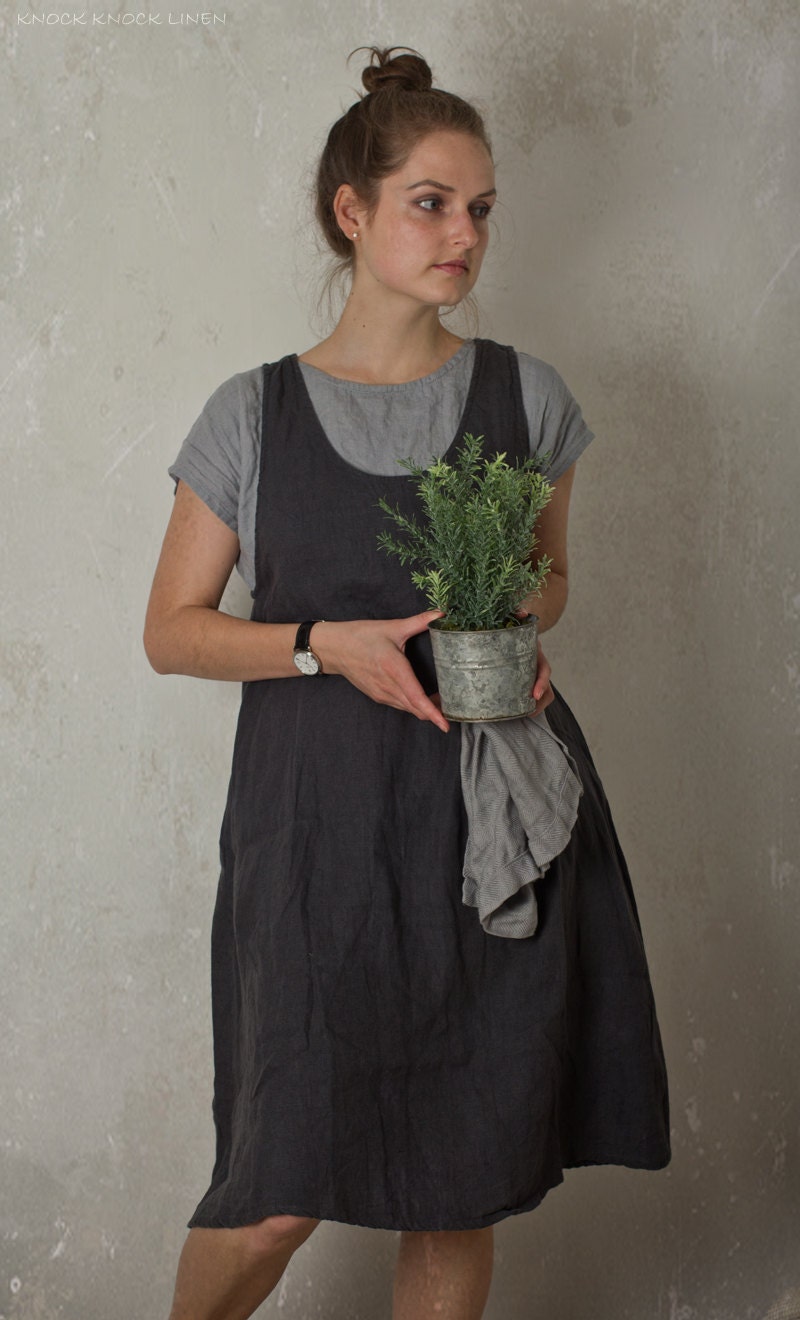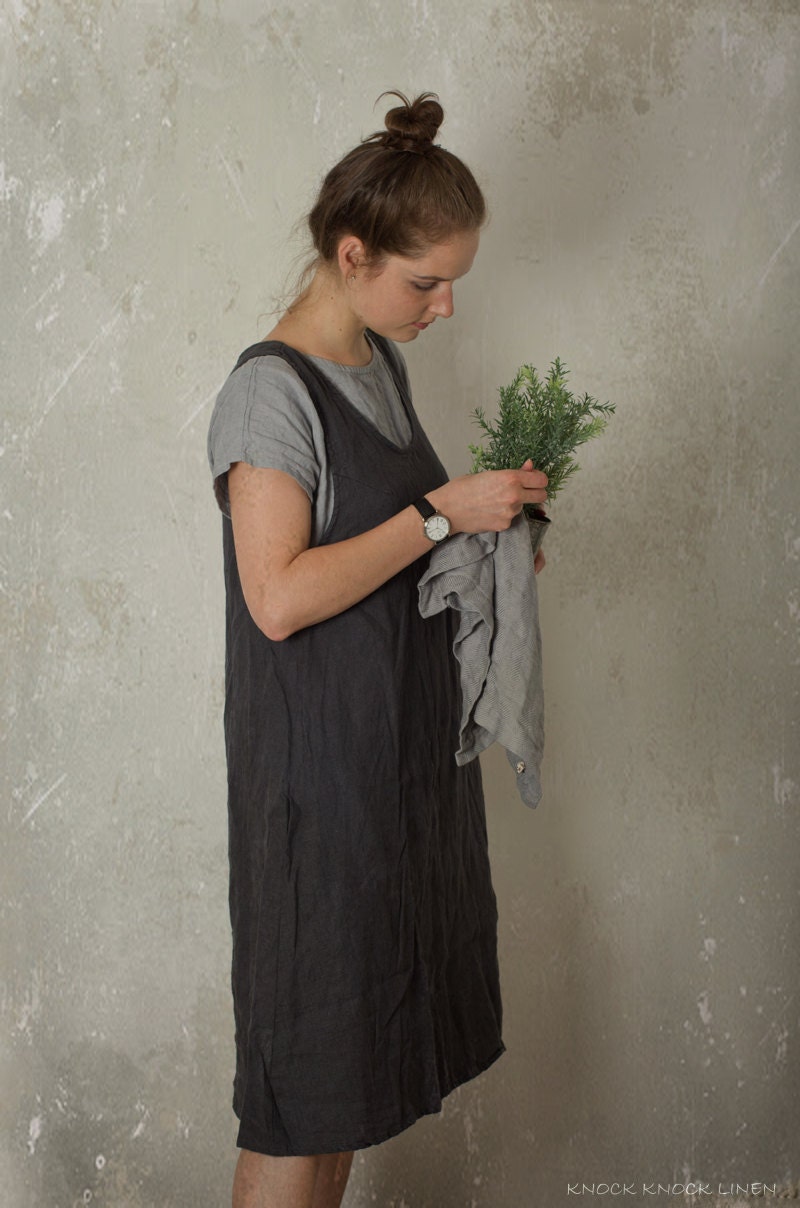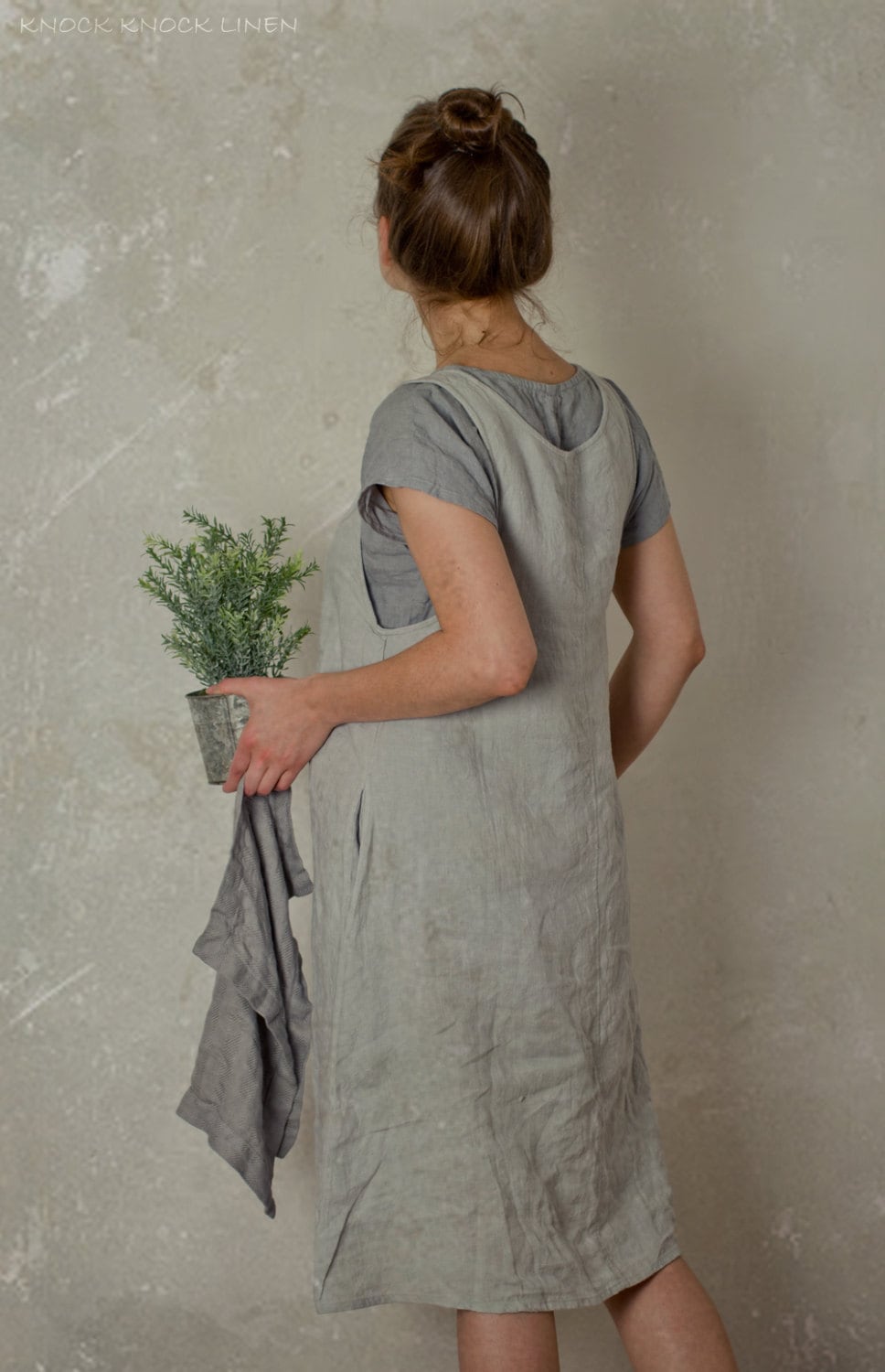 Our linen apron pinafore dress has a scoop neckline, deep armholes, and side seam pockets. It is a very simple yet feminine pinafore dress. it can be your best friend when you are in a kitchen, garden, or even in your art studio, it protects your clothes and looks beautiful at the same time.