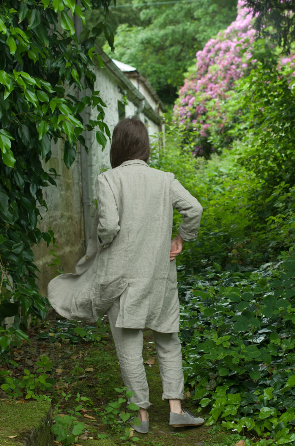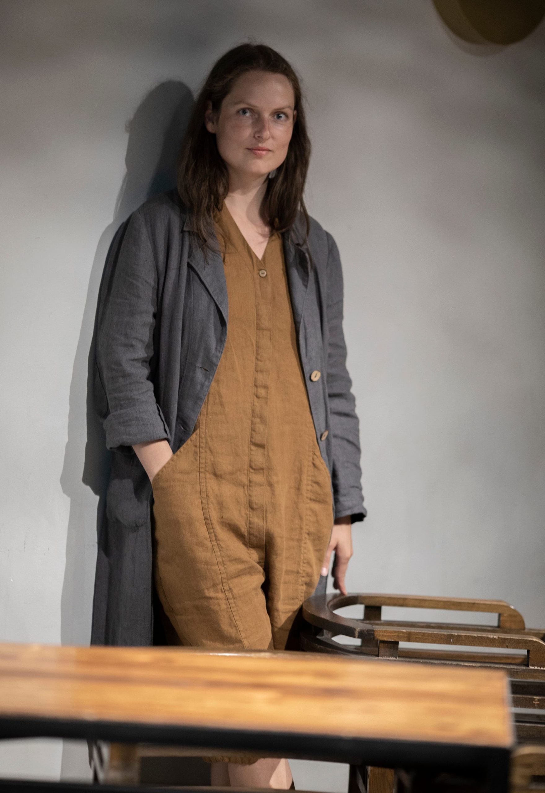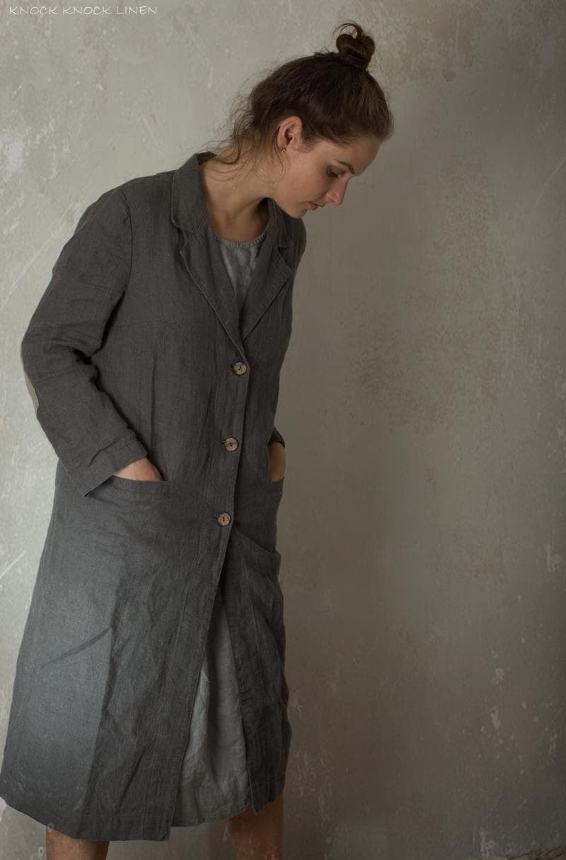 Beautiful high quality linen coat that will go with everything–dresses, skirts, pants. High quality heavy linen in a lovely grey color–expertly tailored for a flattering fit with style–a versatile and useful garment that is reasonably priced for such a beautifully tailored linen coat. Great customer service and communication. I love my linen work coat and am very happy.