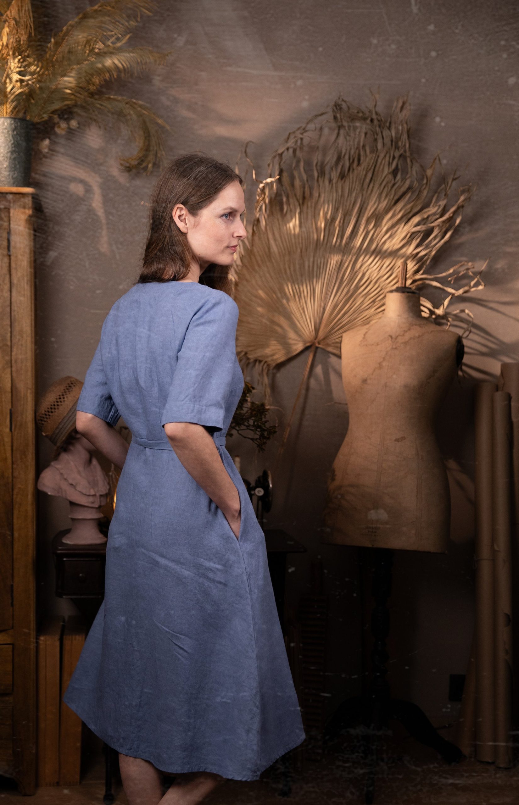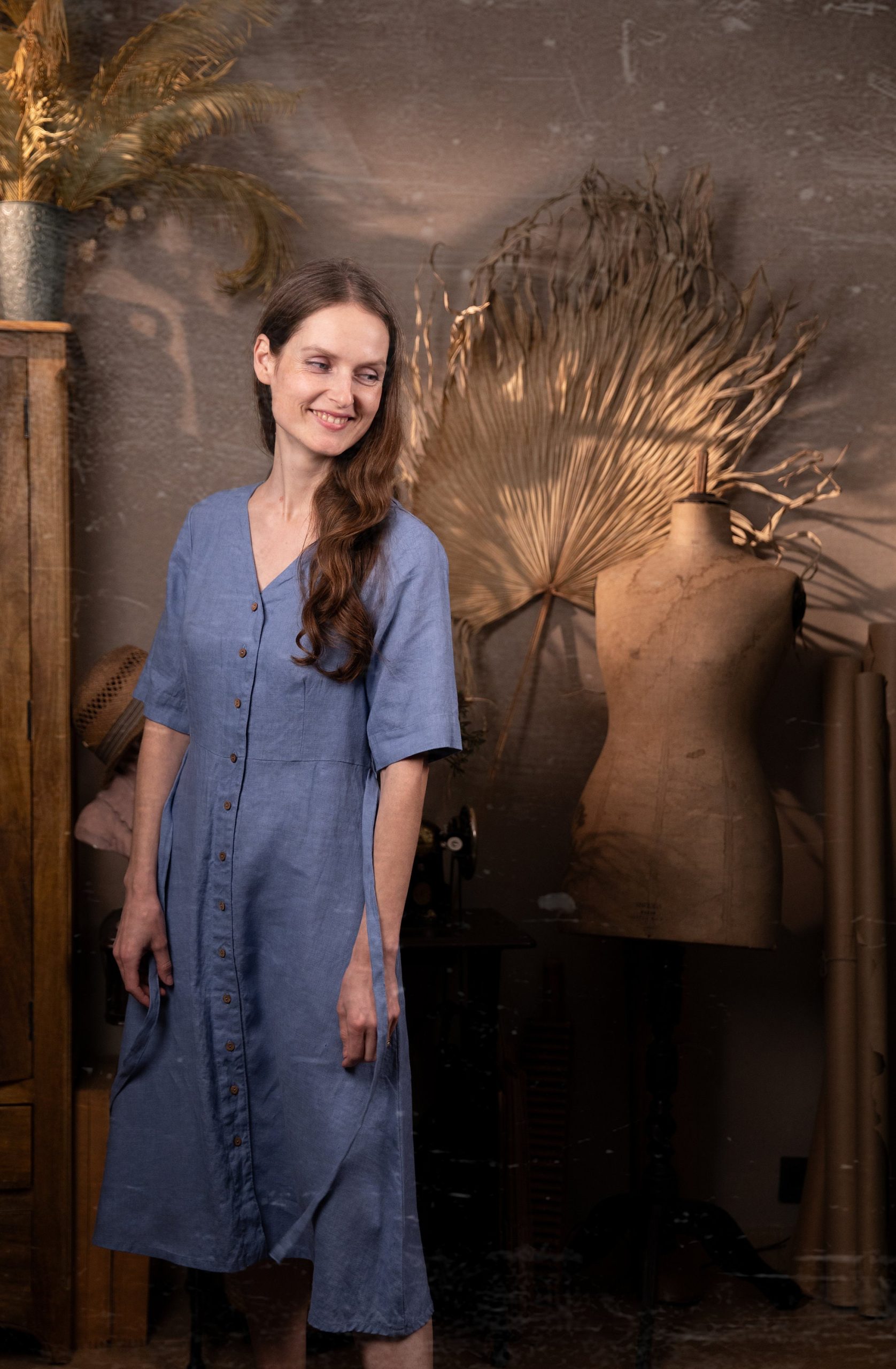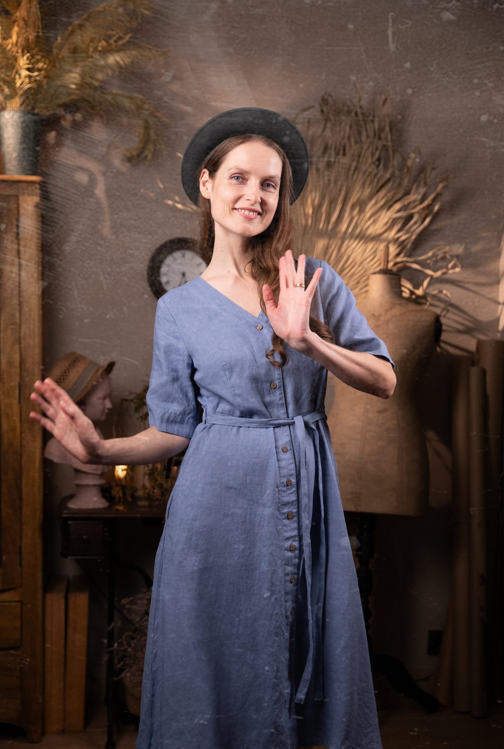 Vintage style inspired dress Amelie is made of pure linen fabric. A fitted bodice with a buttoned front, V-neck, half-length sleeves, side seam pockets for comfort, A-line skirt and detachable tie belt.