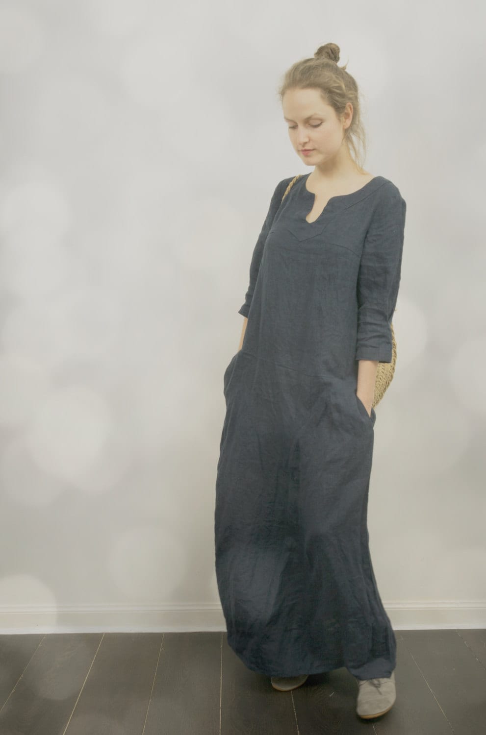 The Desert dress is made of high-quality linen fabric. Maxi length summer dress has a beautiful V-shape Arabian style neckline, 3/4 sleeves, side seam pockets.