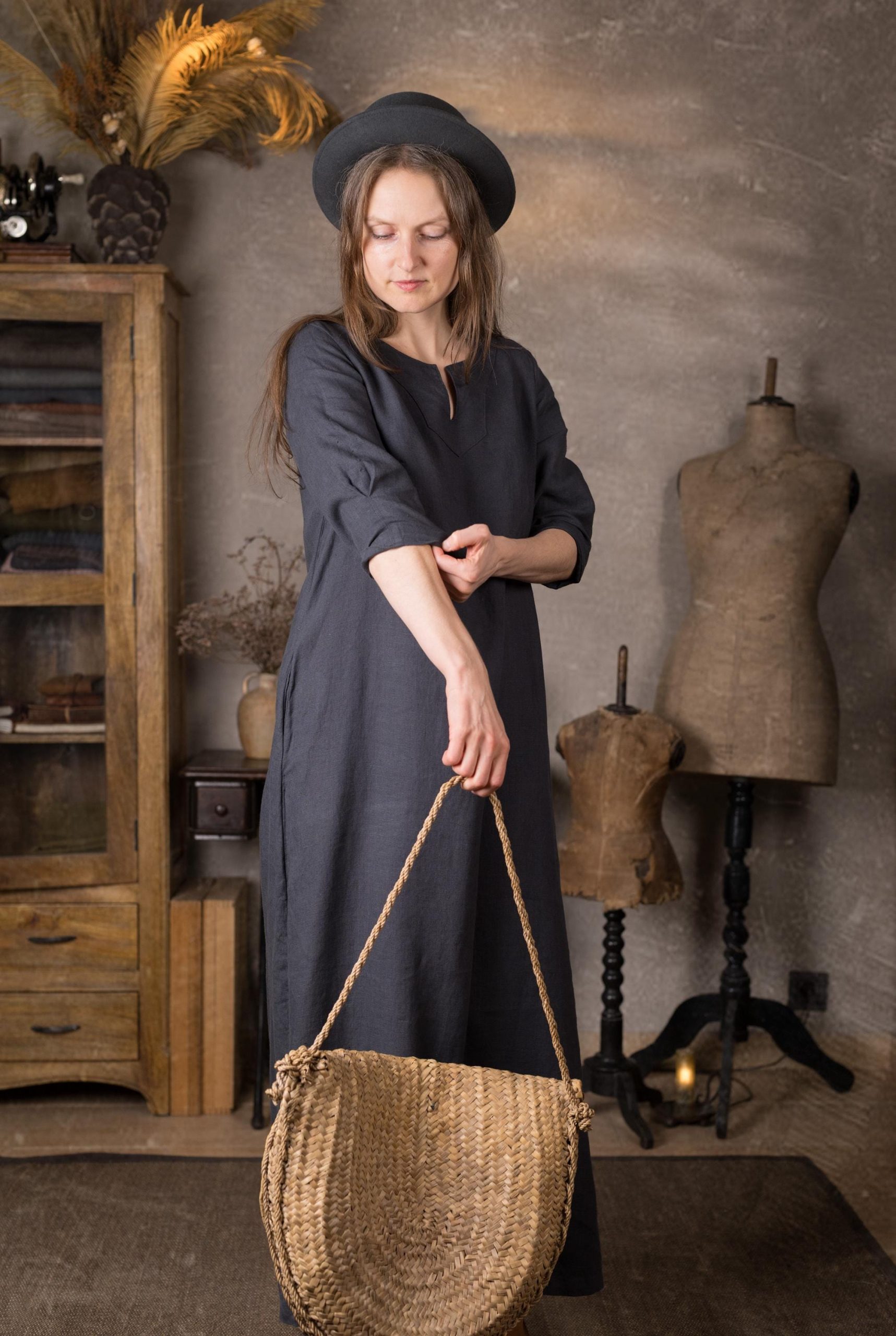 A flowing maxi linen summer kaftan dress with 3/4 sleeves and pockets, handmade for thoughtful women who love loose boho comfort and simple everyday elegance.