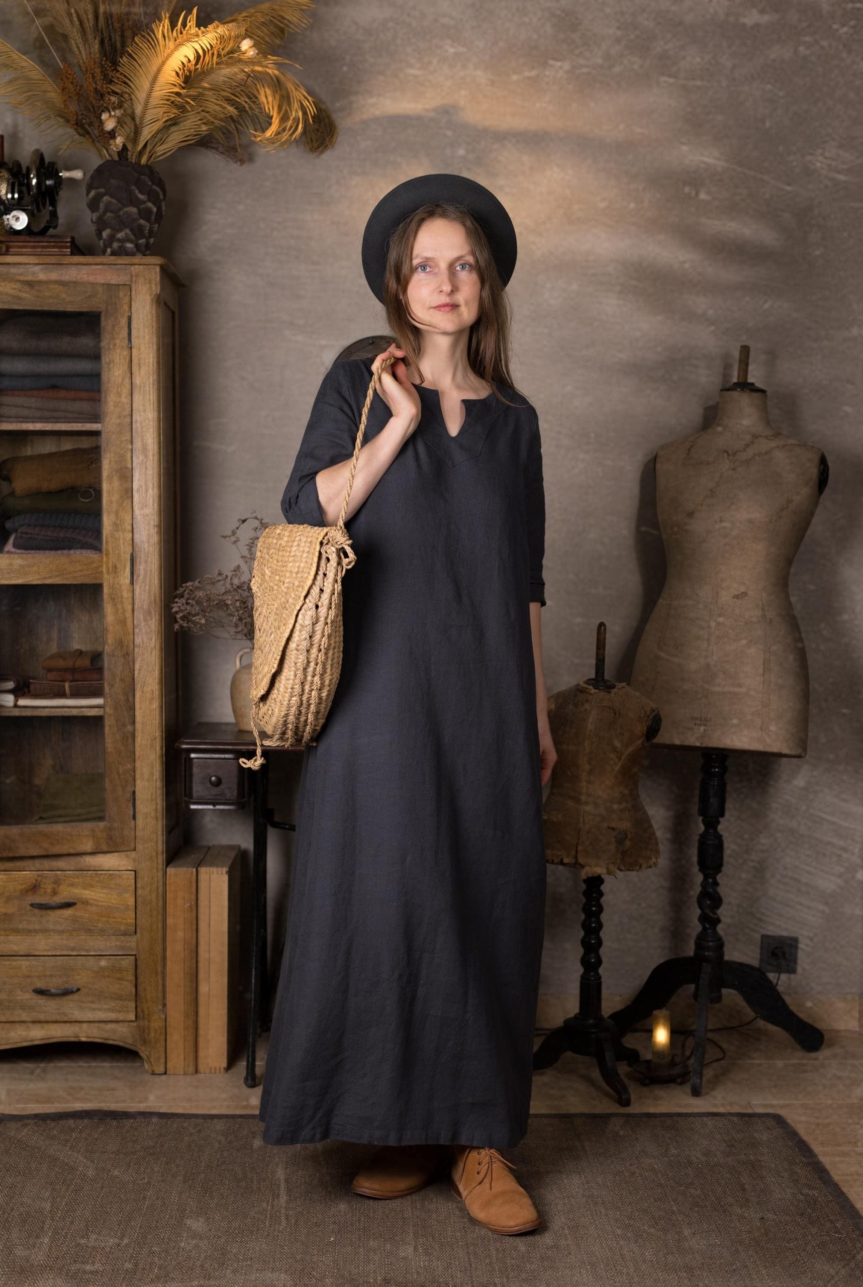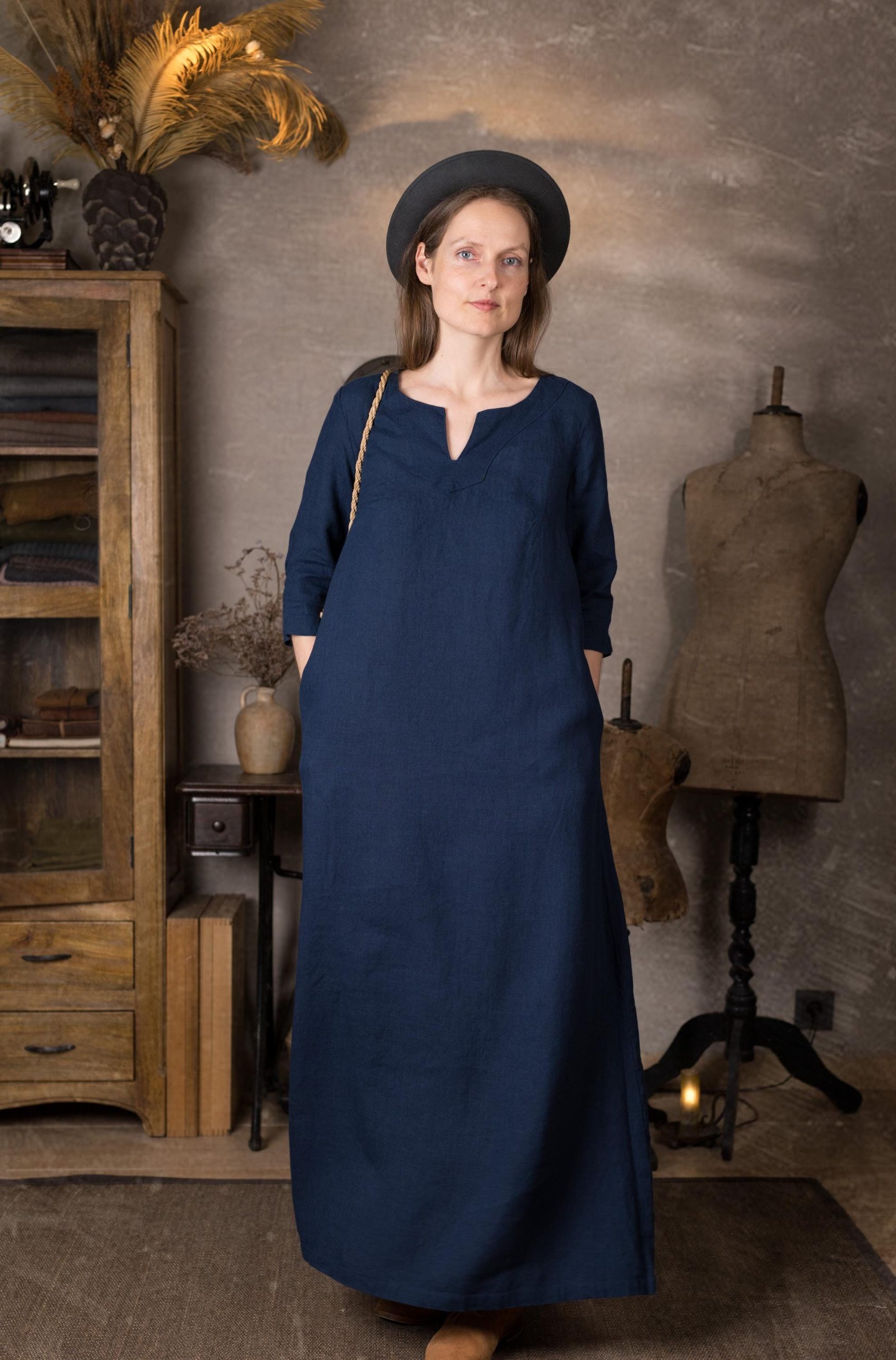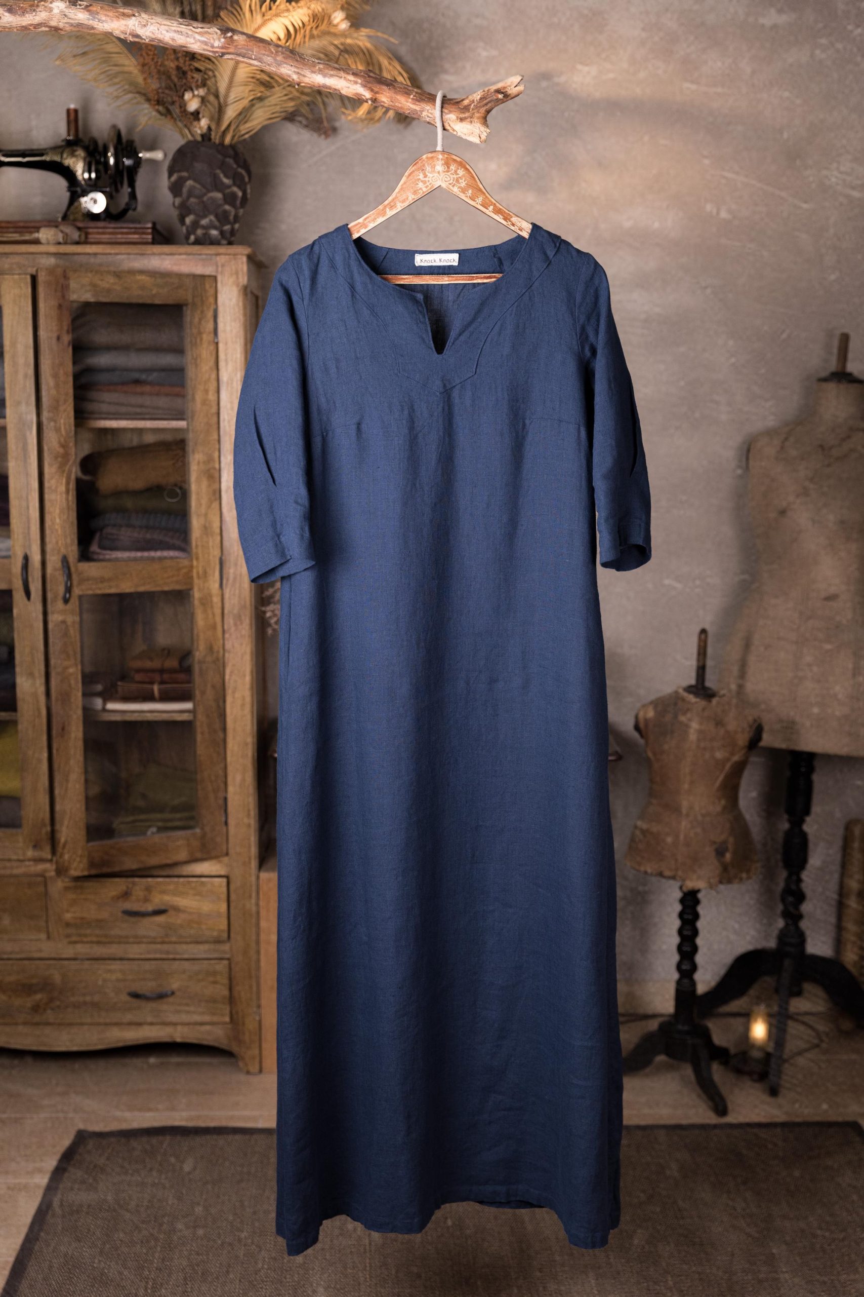 A flowing maxi linen summer kaftan dress with 3/4 sleeves and pockets, handmade for thoughtful women who love loose boho comfort and simple everyday elegance.