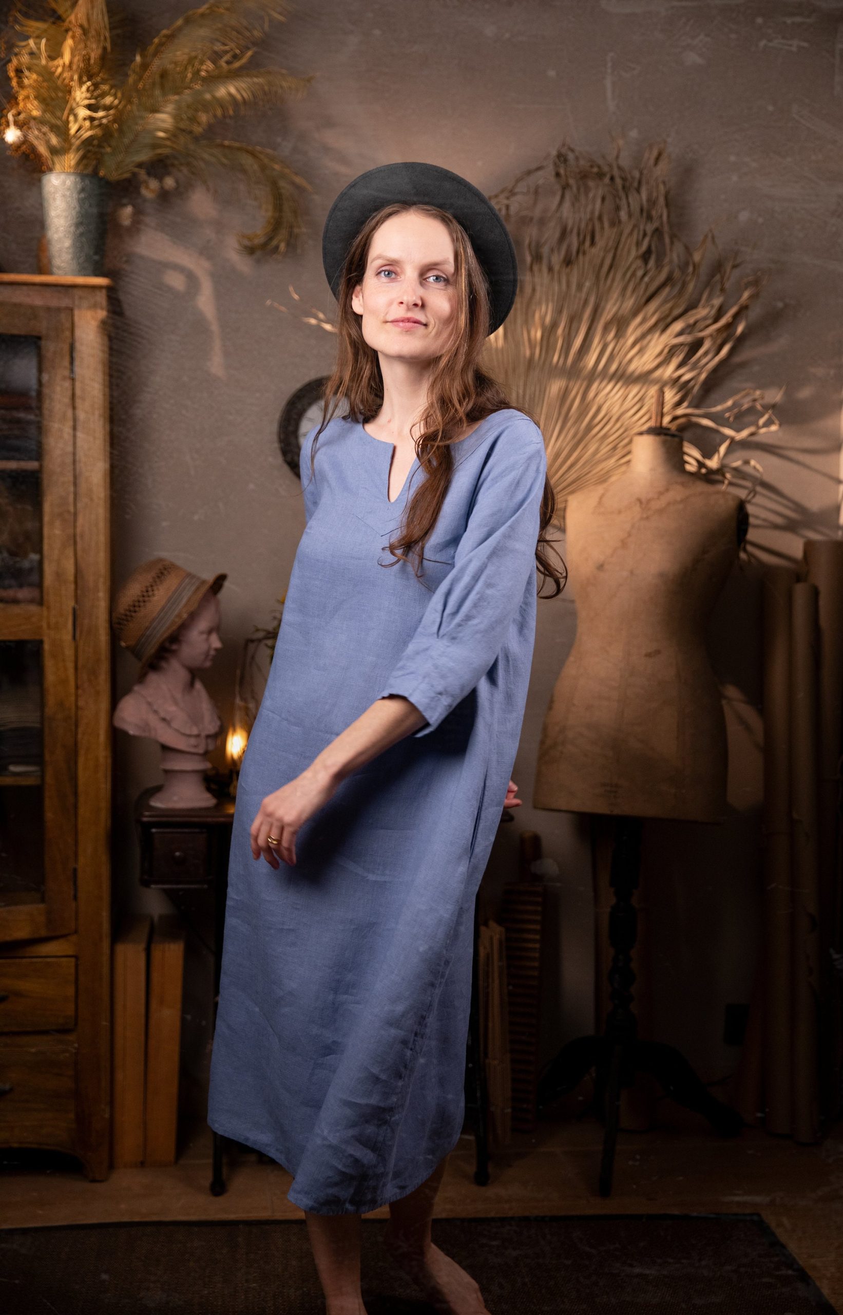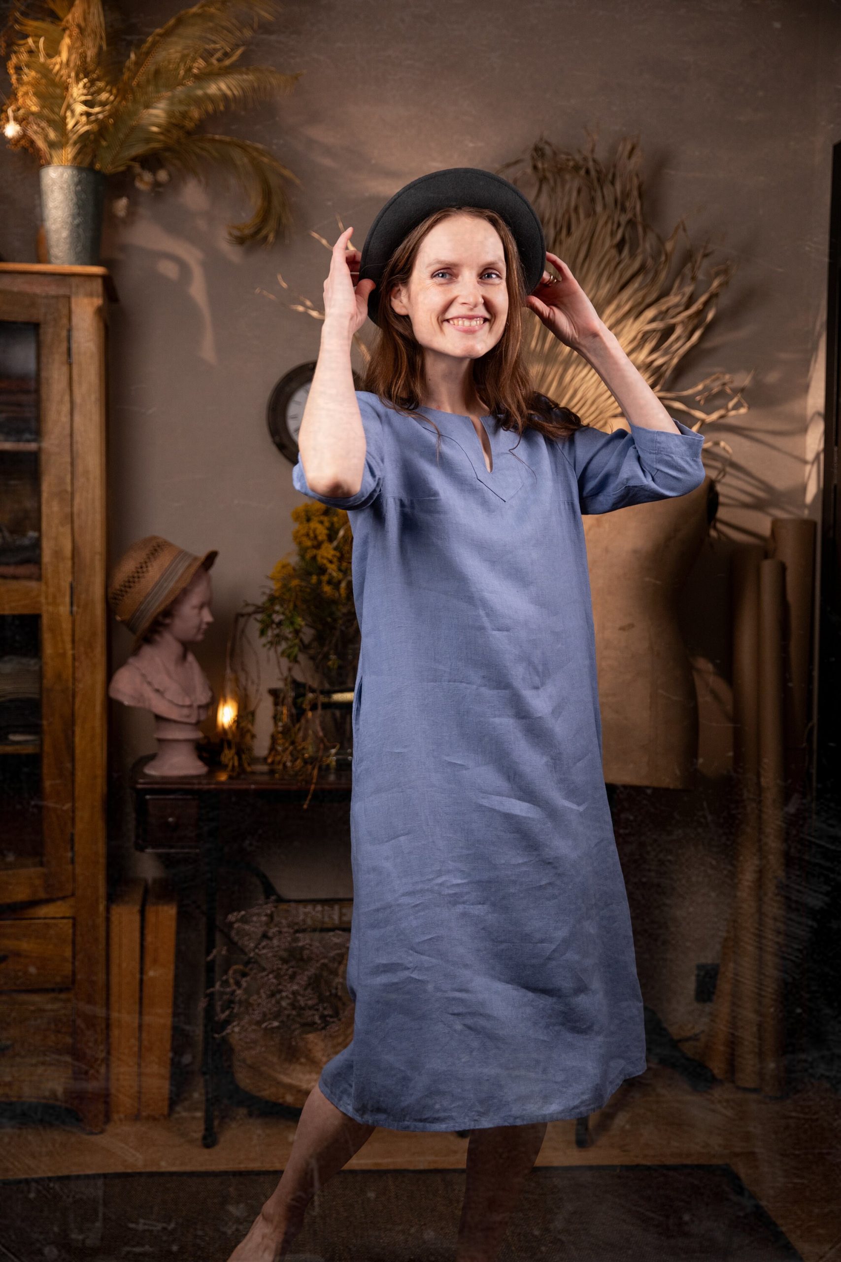 The Dune dress is made of high-quality linen fabric. Midi-length loose summer dress has a beautiful V-shape Arabian style neckline, 3/4 sleeves, side seam pockets.