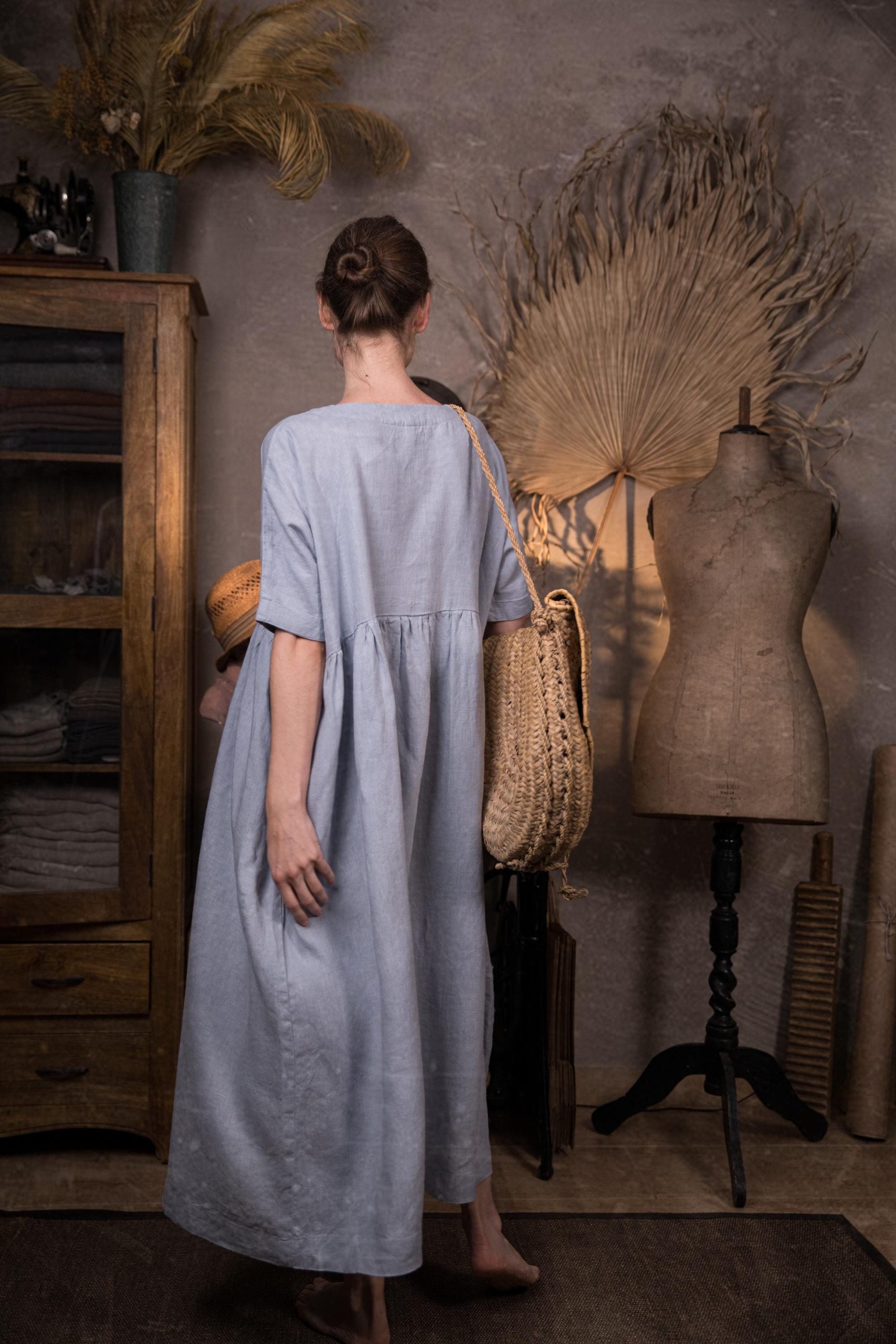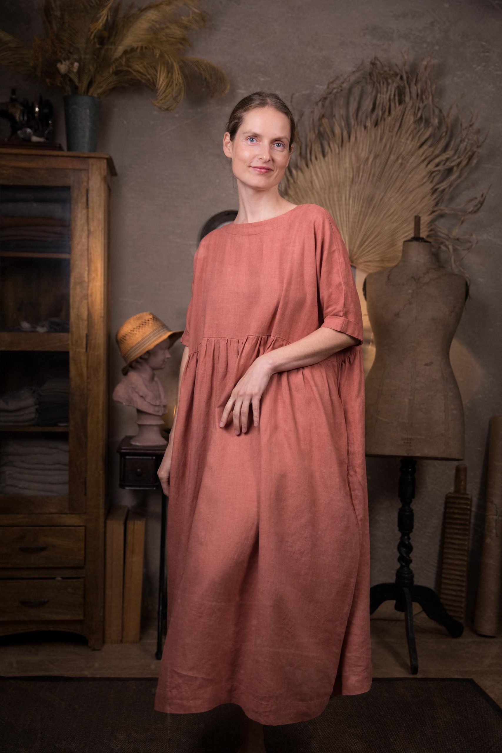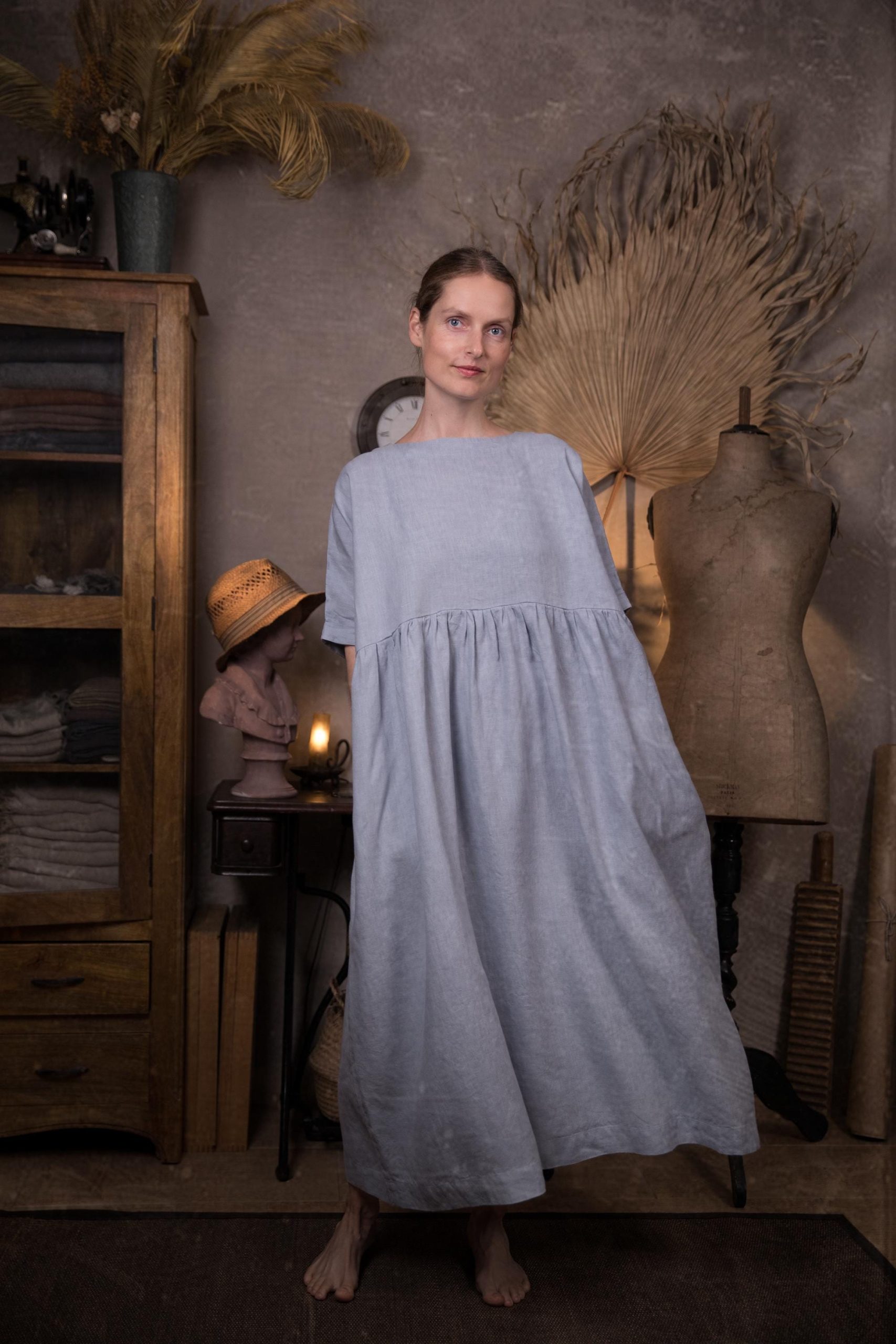 An oversized linen dress with short sleeves, a high waist, and a softly gathered skirt – designed for women who cherish freedom and authenticity. It lives with you through the seasons, gently adapting to your body as it changes. With every wear, it becomes a part of your rhythm – comforting and always feeling like home.