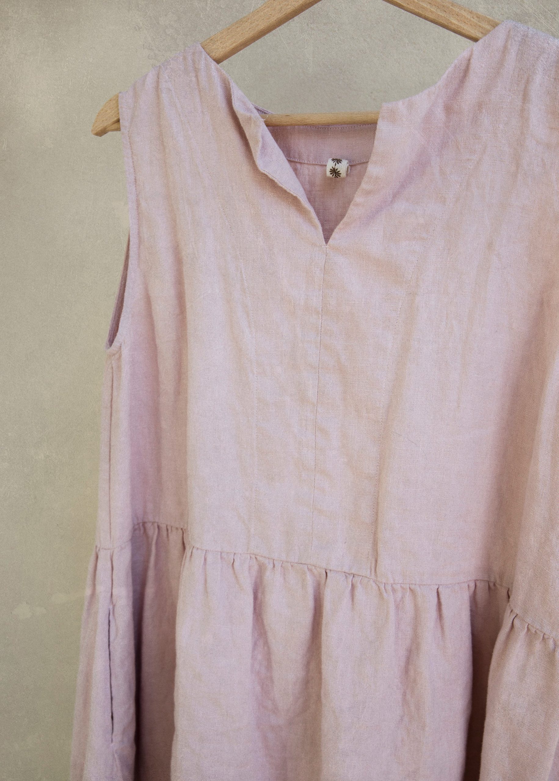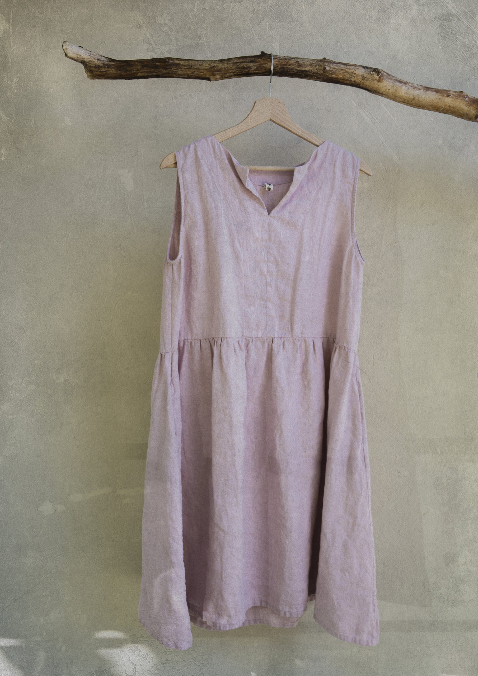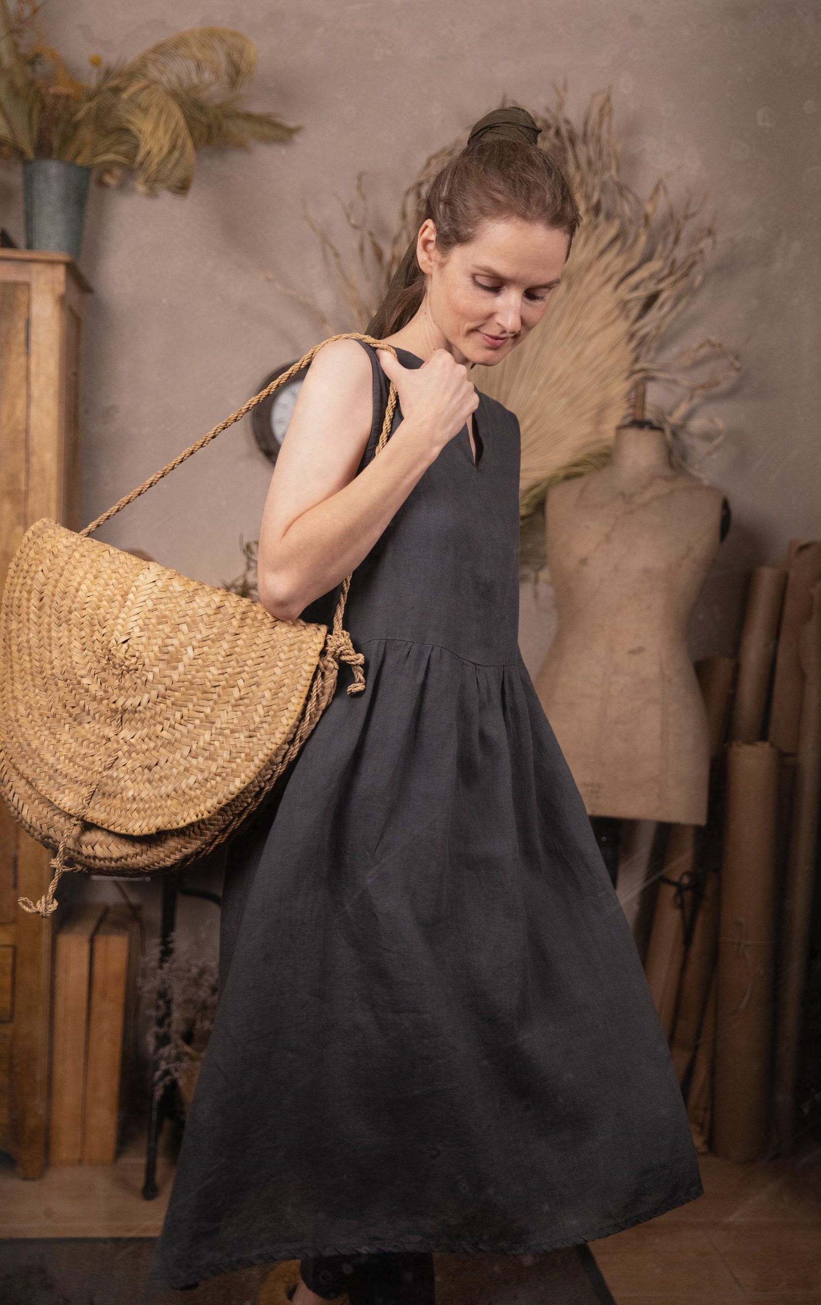 Loose linen summer dress MONET is made of high-quality linen fabric. The sleeveless dress has V-neck, high waist, side seam pockets for comfort, gathered skirt and is below the knee length. The romantic dress is perfect for everyday, gardening or special occasions.