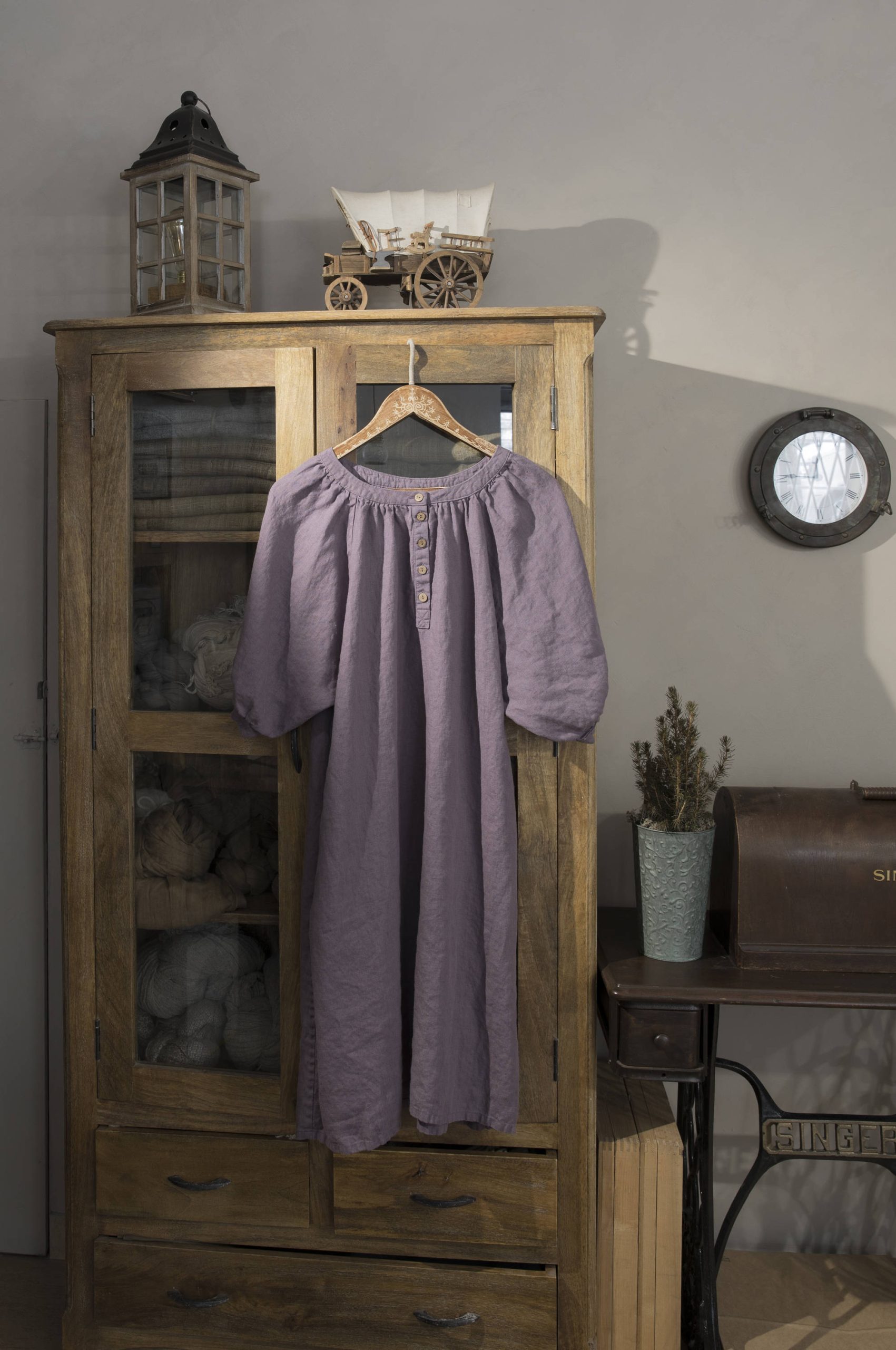 Romantic linen summer dress NOMAD with gently gathered sleeves and neckline. The dress is made of high-quality linen fabric. Loose bodice with a button front, raglan half-length sleeves, side seam pockets for comfort. The romantic bohemian style dress is perfect for everyday or special occasions.