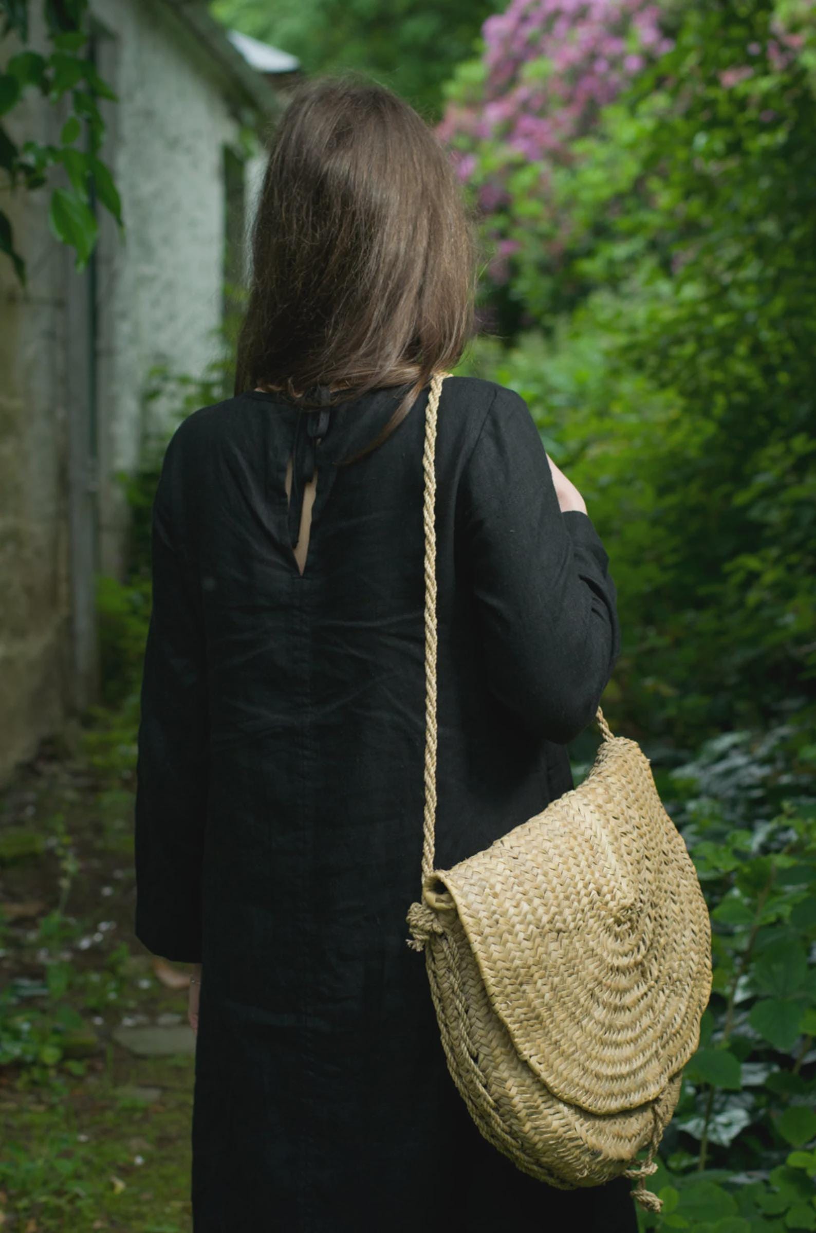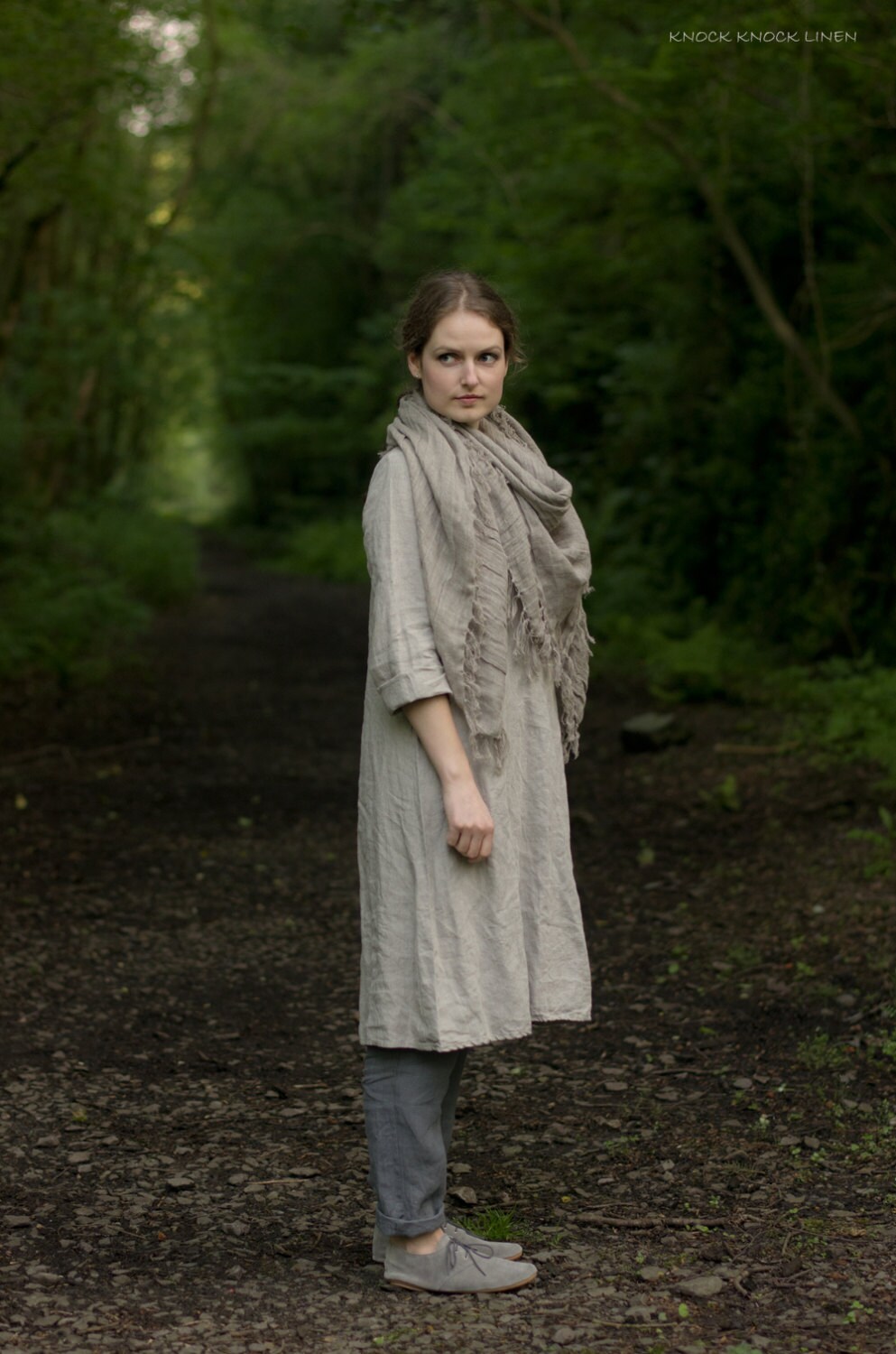 The Trapeze linen dress with long sleeves features a back tie opening and discreet side seam pockets. It can also be made in a custom length.