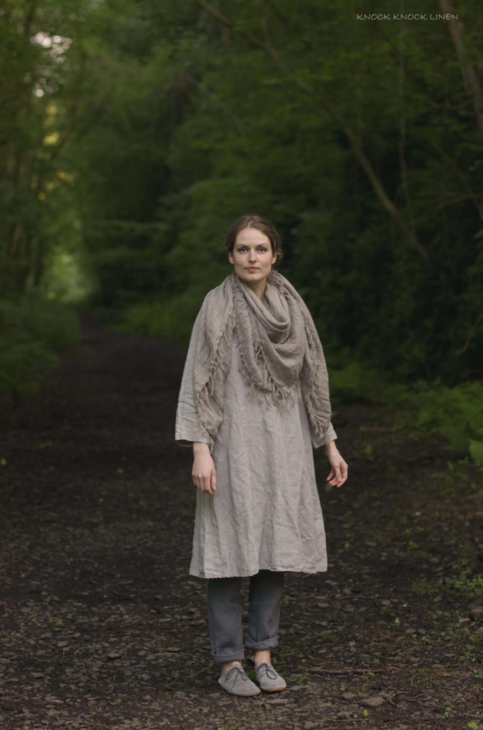 The Trapeze linen dress with long sleeves features a back tie opening and discreet side seam pockets. It can also be made in a custom length.