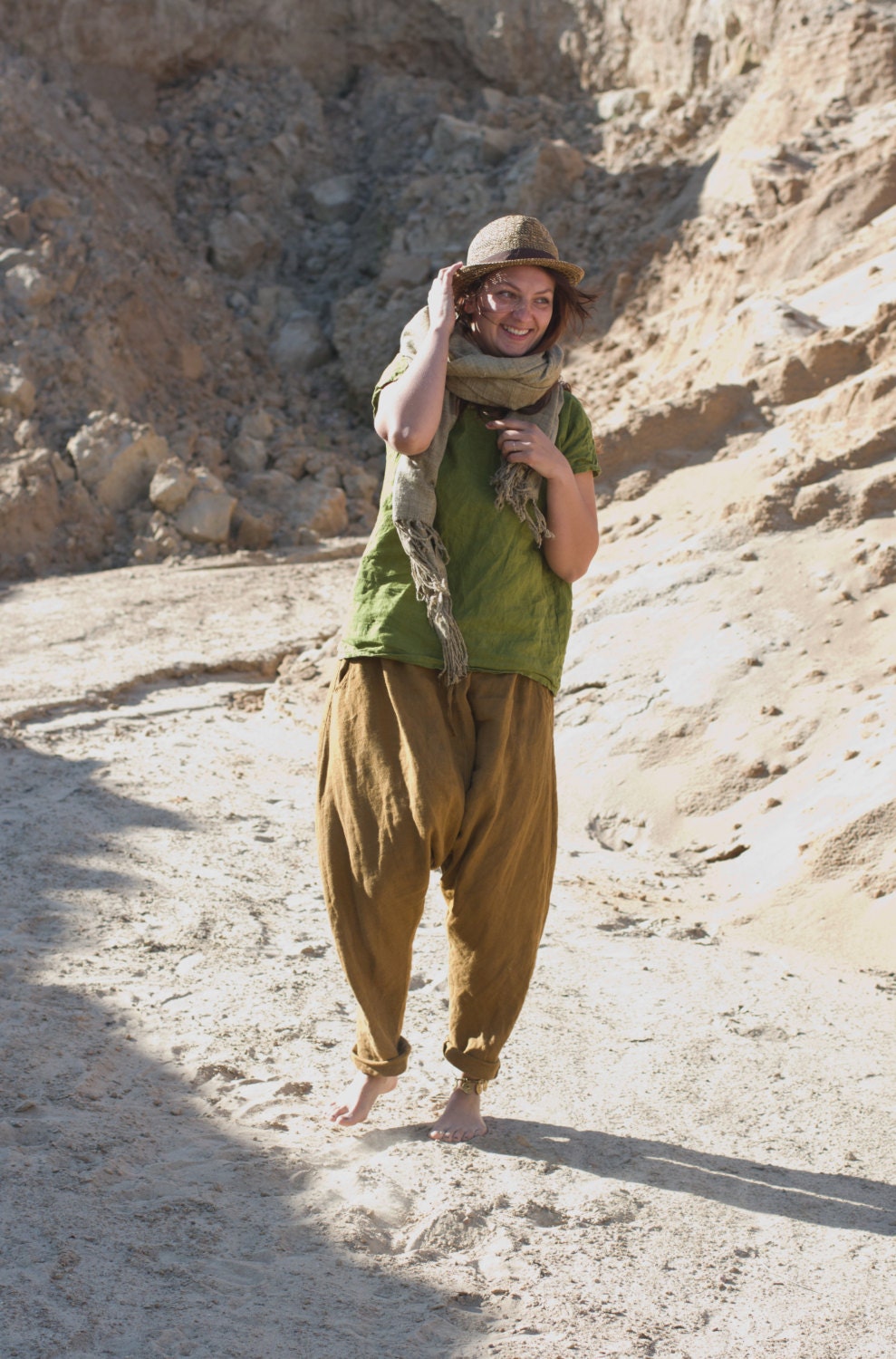 Soft, breathable linen harem pants with a tapered leg, deep pockets, and adjustable waist — ideal for yoga, lounging, or slow living in comfort.