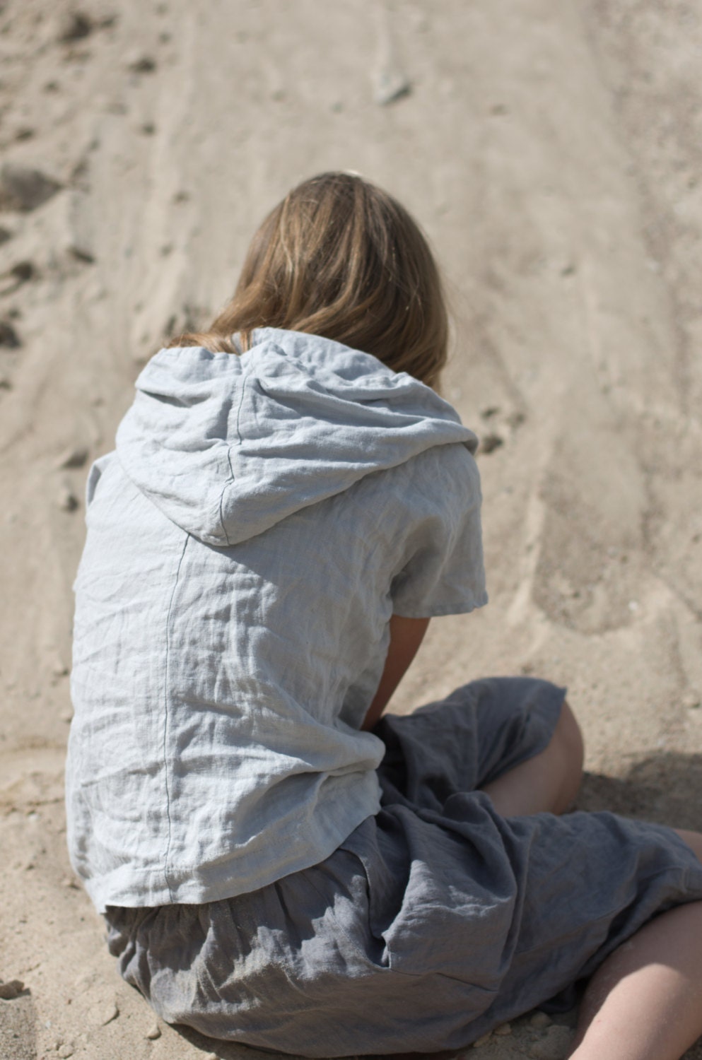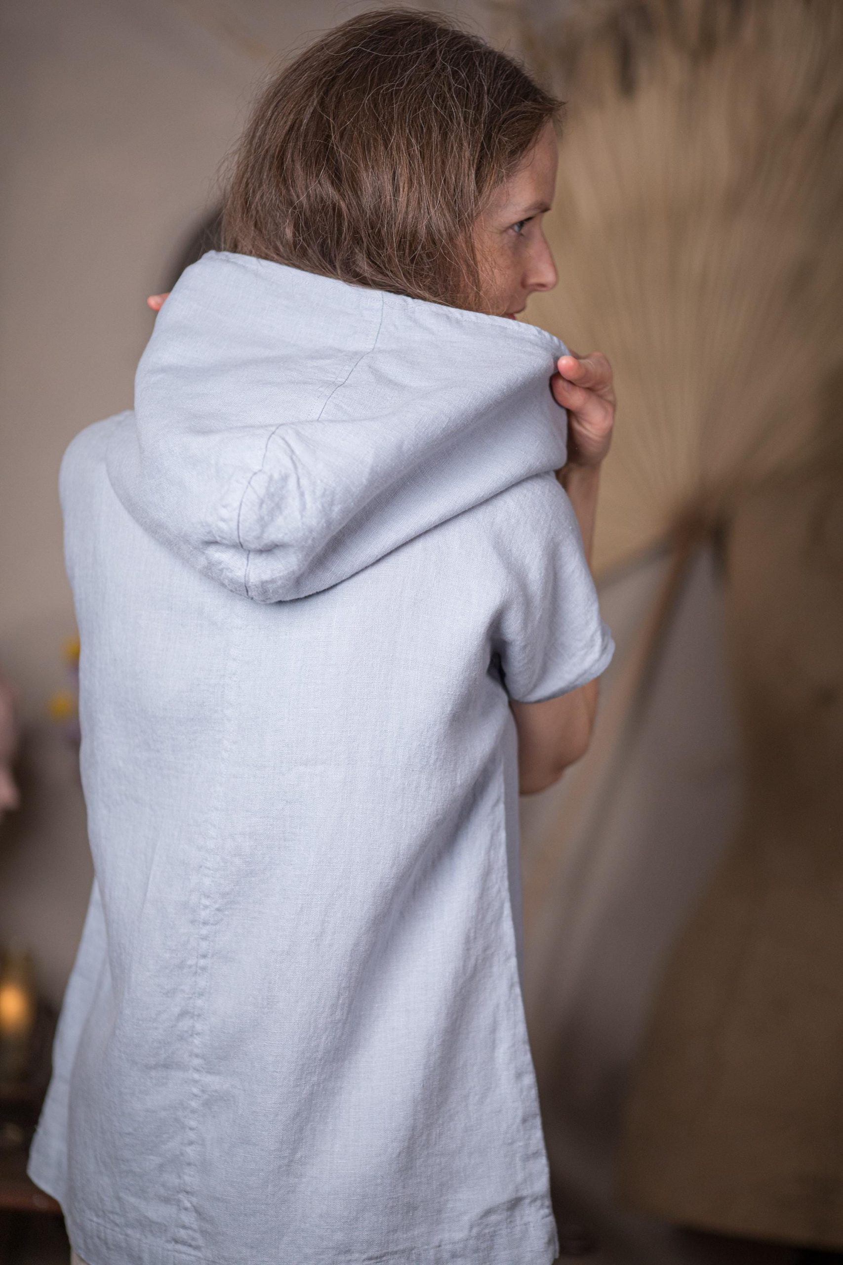 Pullover with a big hoodie made of high-quality linen fabric. It features short kimono-style sleeves and is roomy and comfortable.