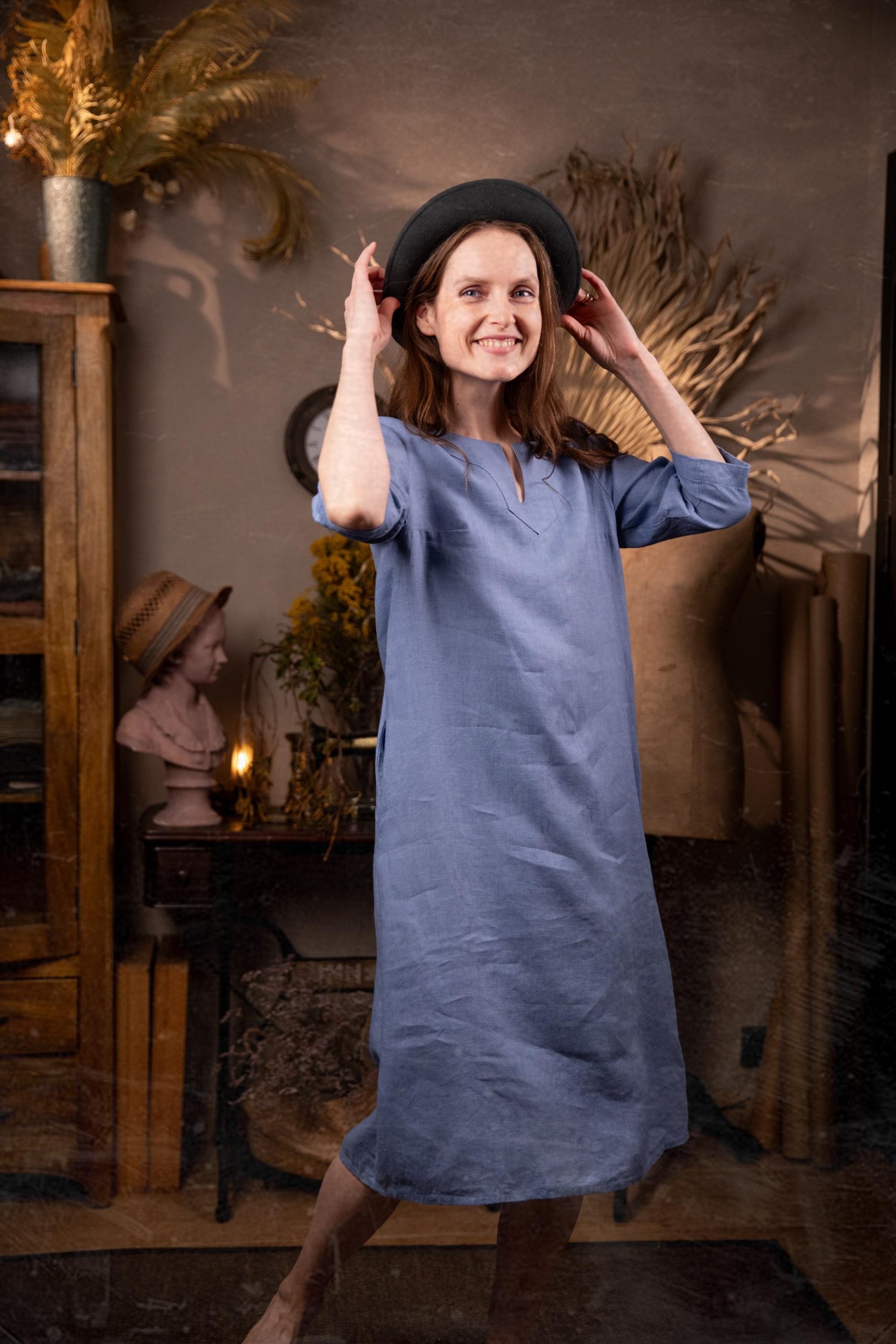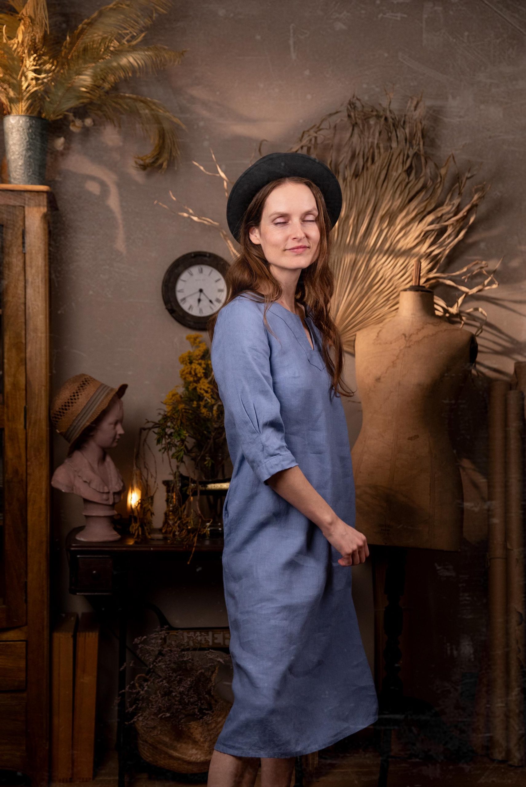The Dune dress is made of high-quality linen fabric. This mid-length loose summer dress has a beautiful V-shaped Arabian-style neckline, 3/4 sleeves, and side seam pockets.