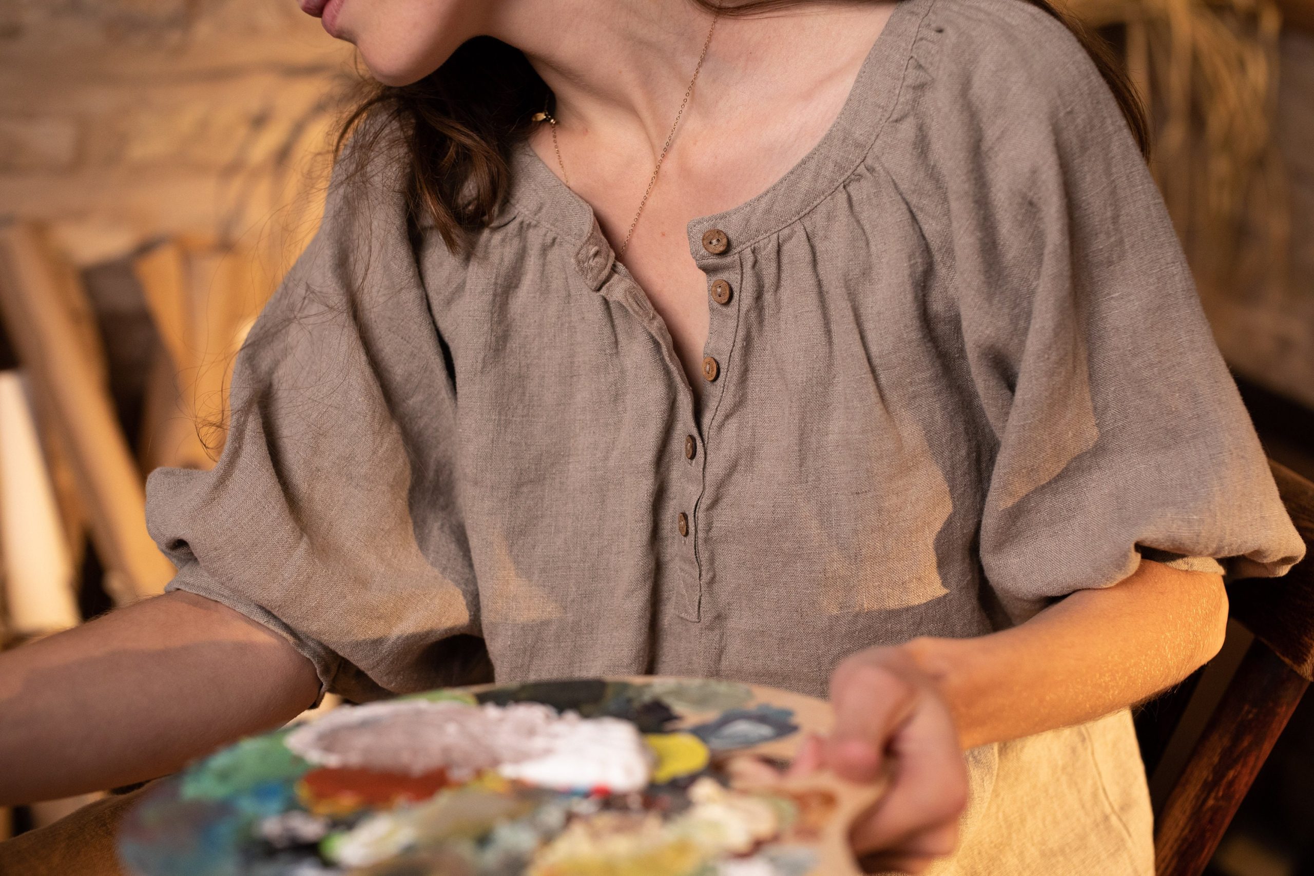 Romantic linen shirt NOMAD with gently gathered sleeves and neckline