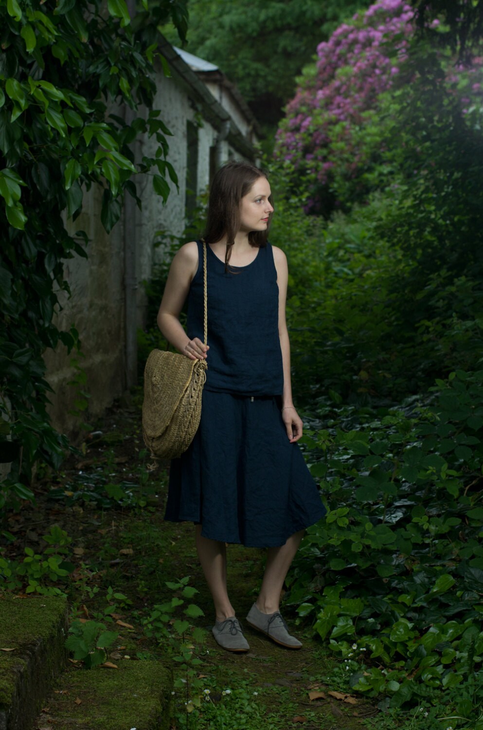 A simple sleeveless linen top Mimosa with a round neck, and an A-line shape. Simple and elegant design.