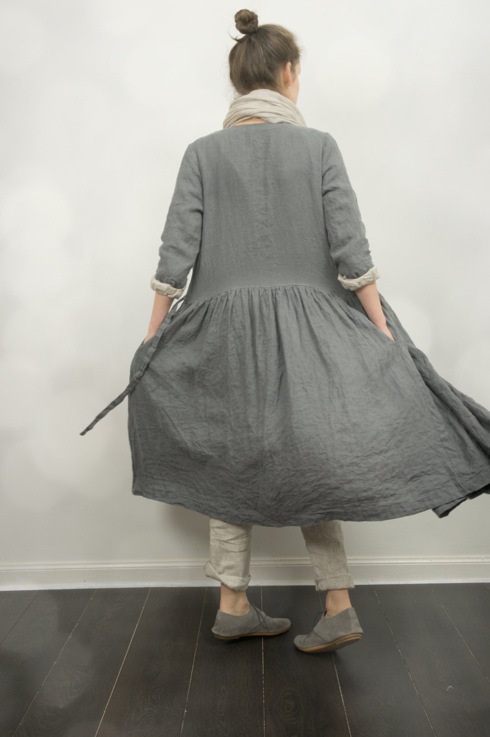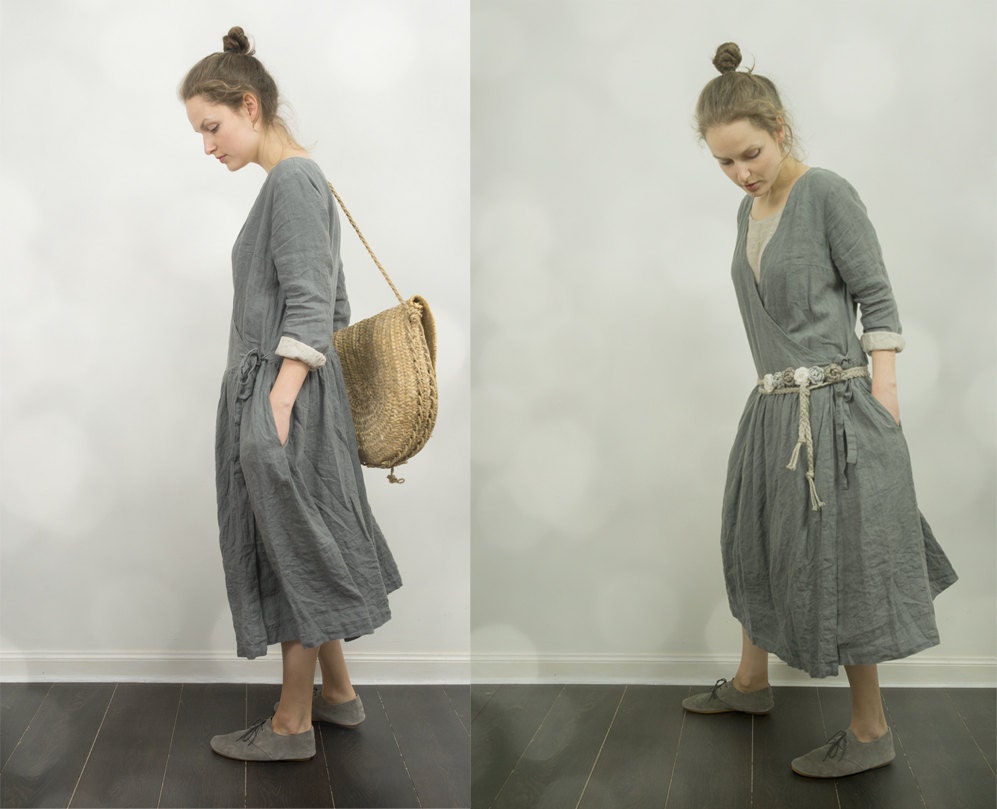 A loose linen wrap dress SEPTEMBER is a very comfortable yet feminine summer dress. It features a low waistline, long, loose sleeves, a gathered skirt, and side seam pockets. You can wear it as a dress or as a duster coat.