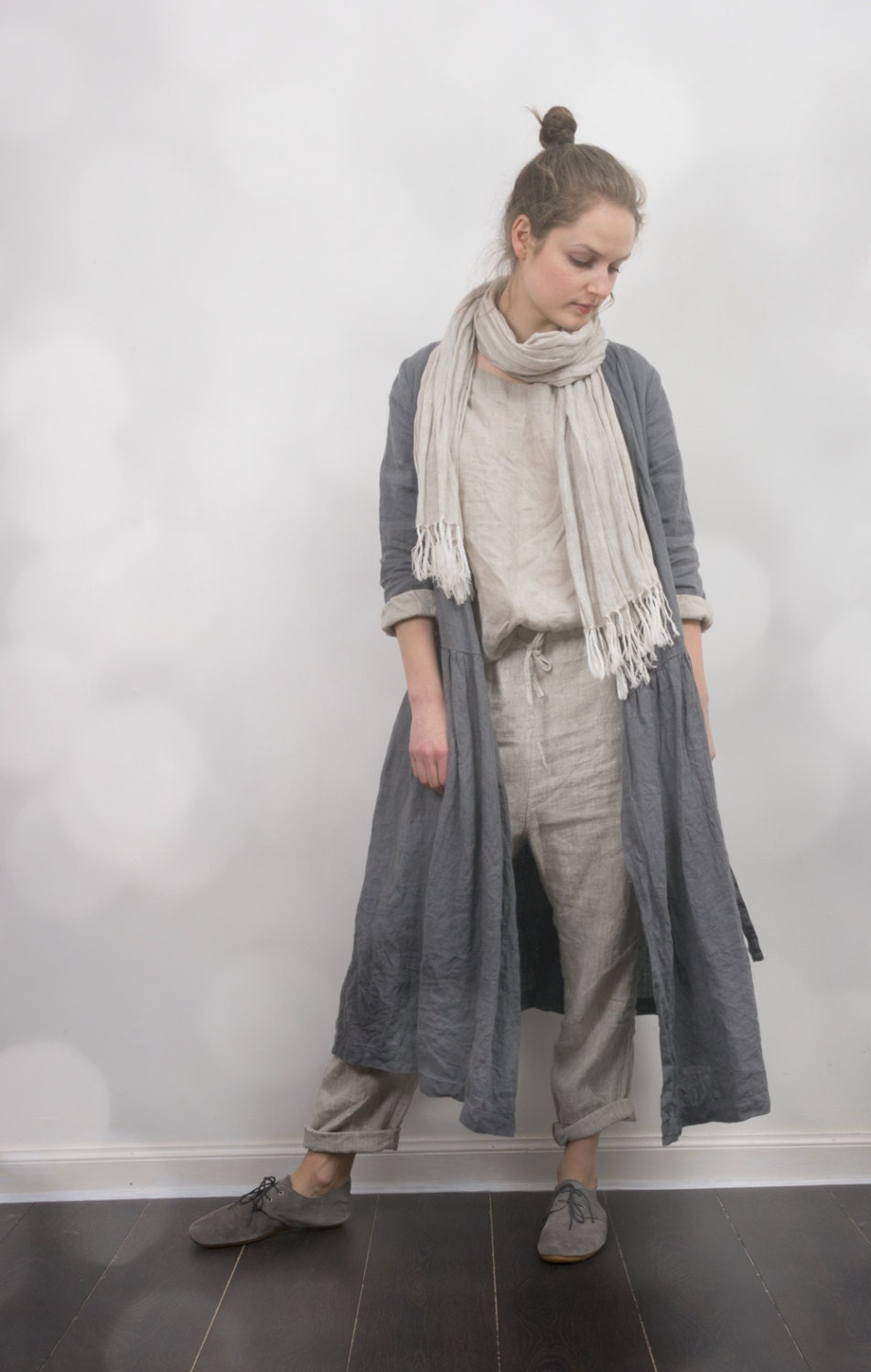 Très belle robe ou manteau en lin épais foggy rain, livrée dans un joli pochon, communication agréable avec Egle qui est de bon conseil