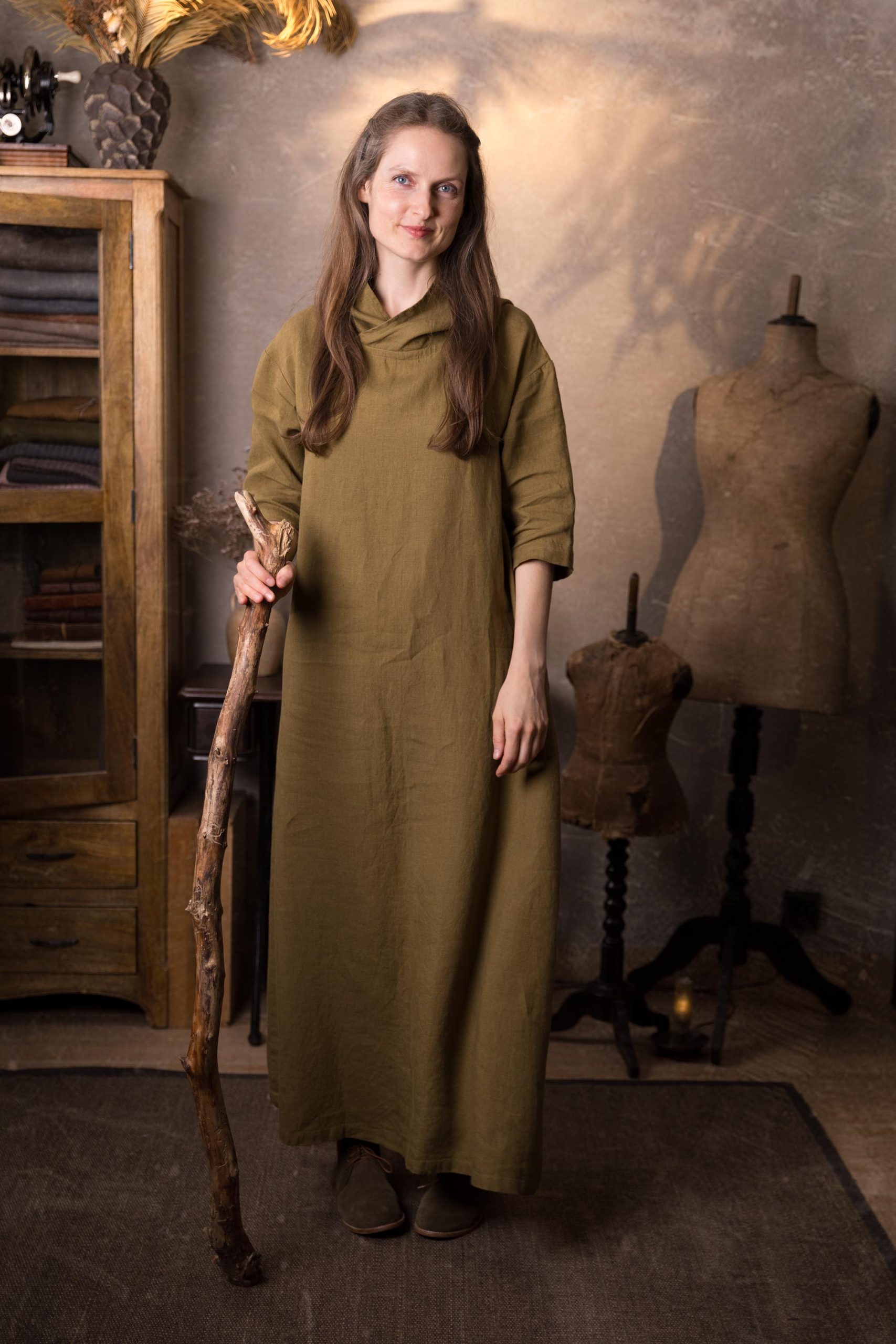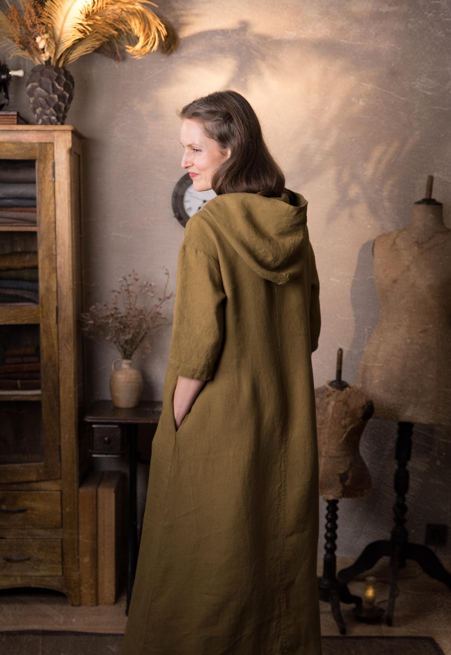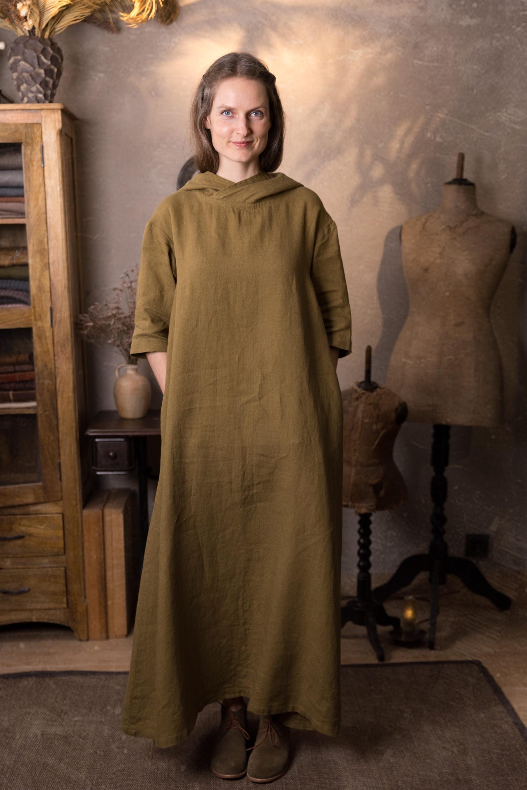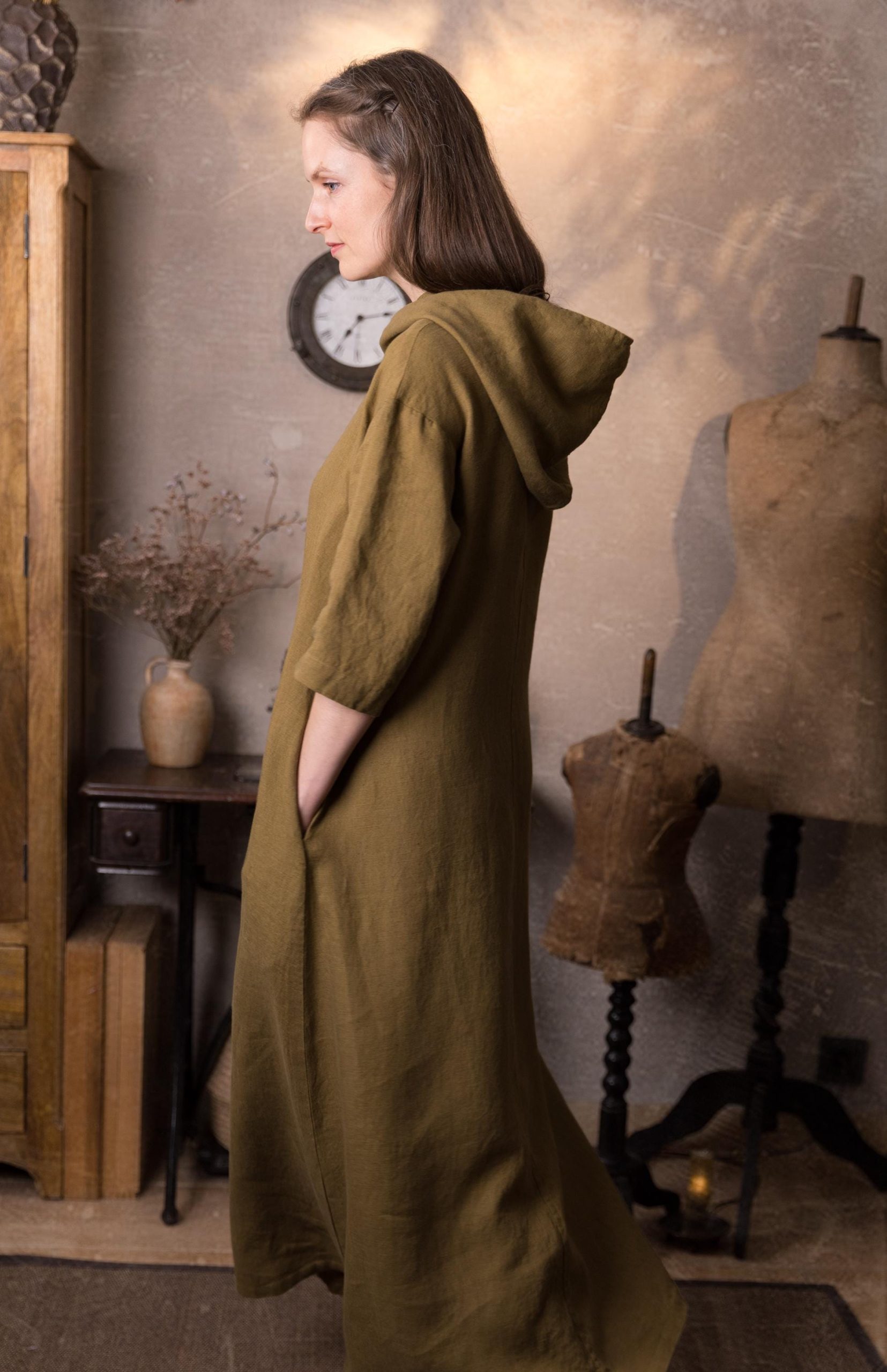 The long linen dress is crafted in a flowing silhouette. The dress features 3/4 sleeves, a dropped shoulder line, a large hood that adds a touch of mystery, and practical side-seam pockets for comfort and ease.