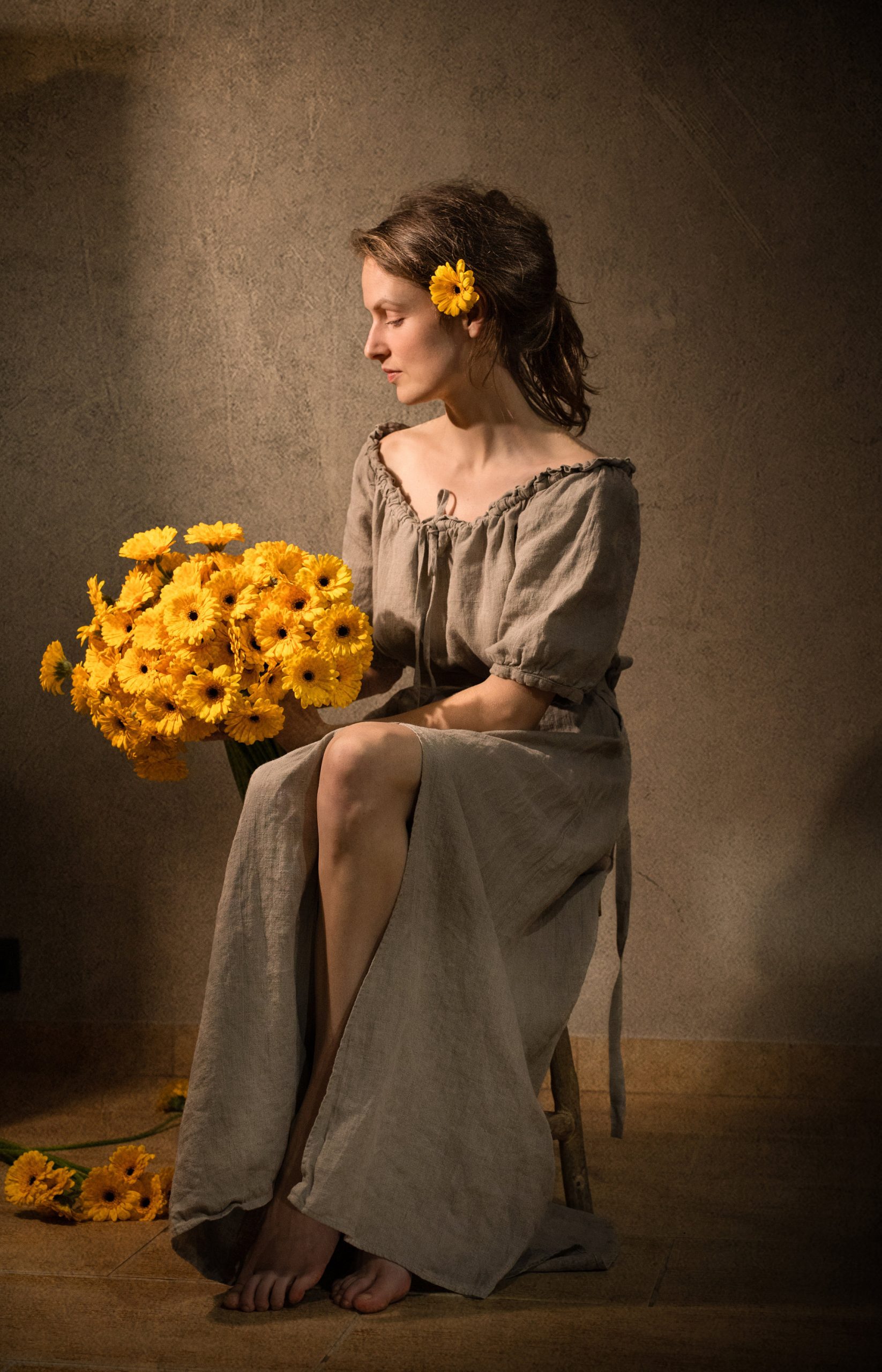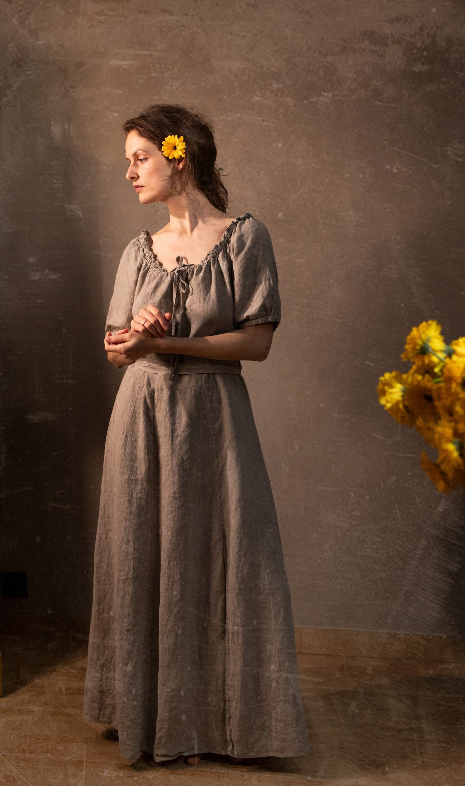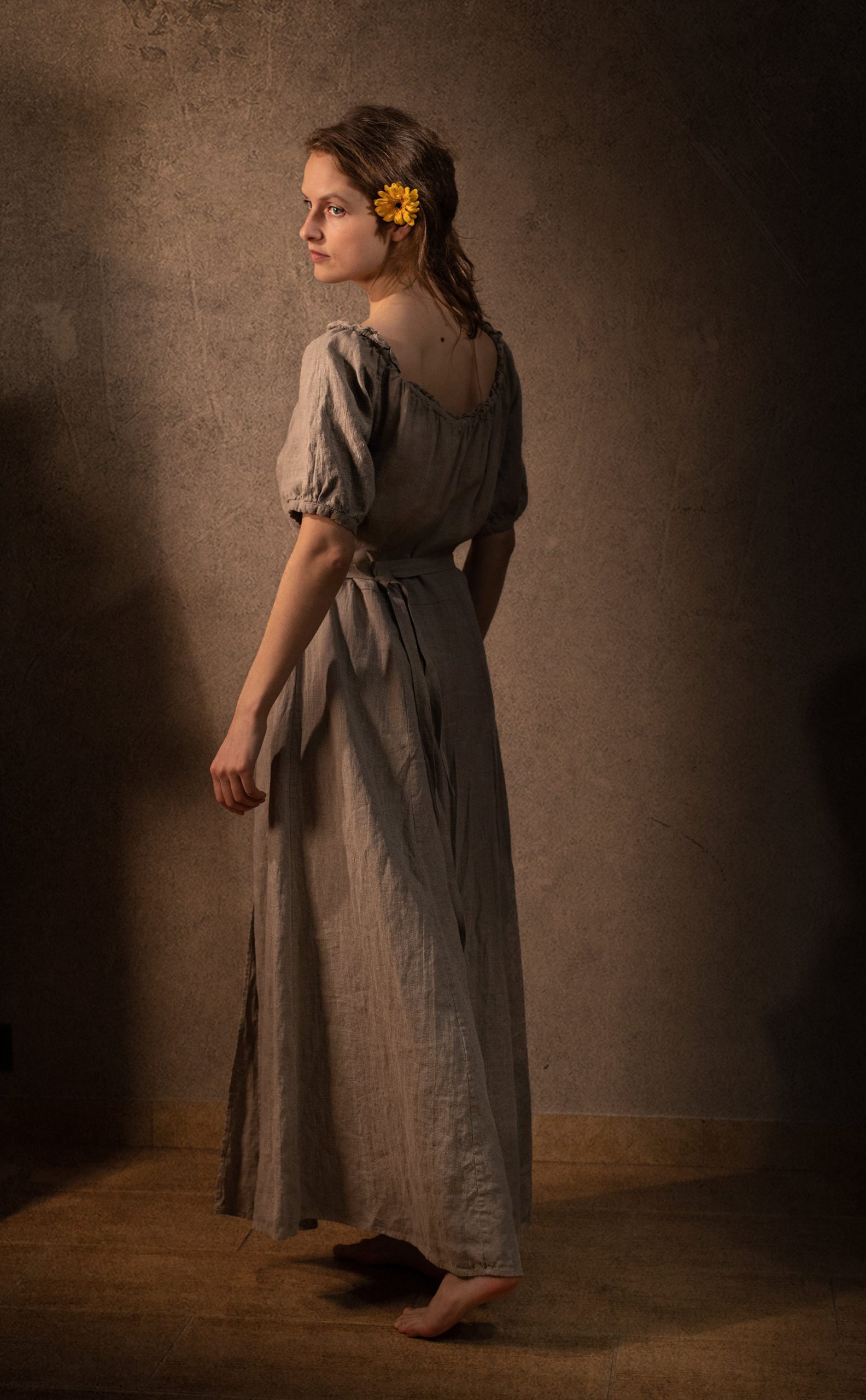 The Flora maxi dress is a romantic’s dream. This timeless and eternally elegant dress reflects my passion for historical costumes and natural textiles, adapted to everyday modern life. Made from 100% linen fabric, it features gathered short sleeves, an adjustable scoop neckline, a detachable belt, and a front slit (the dress can be made without the slit as well).