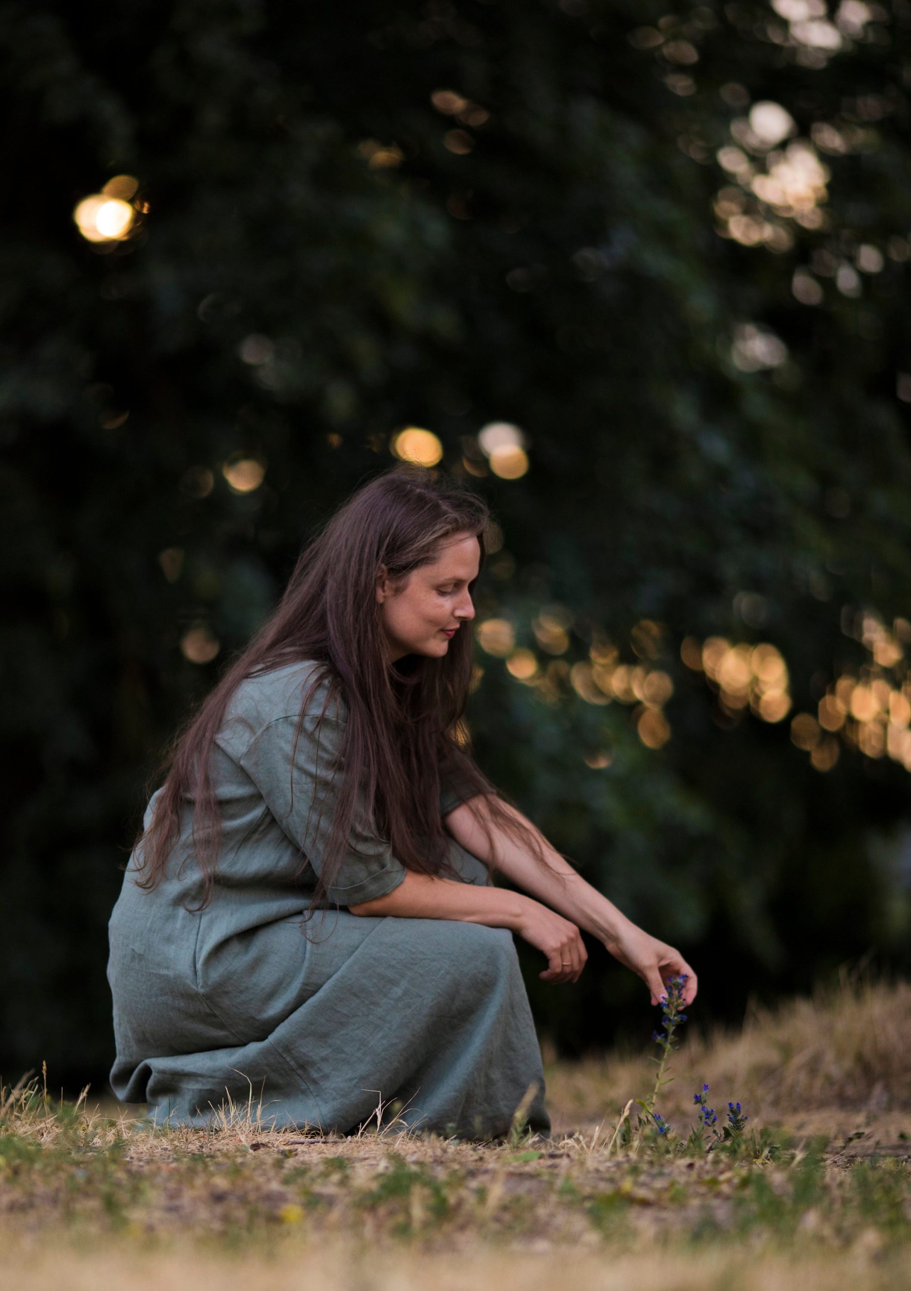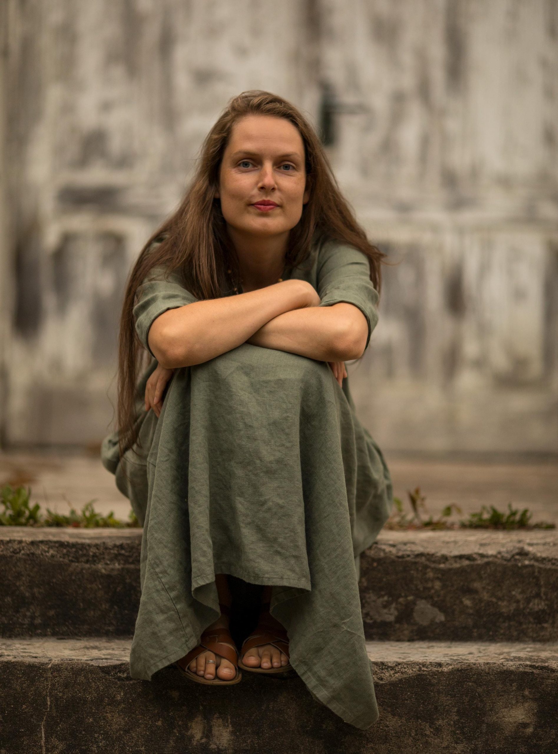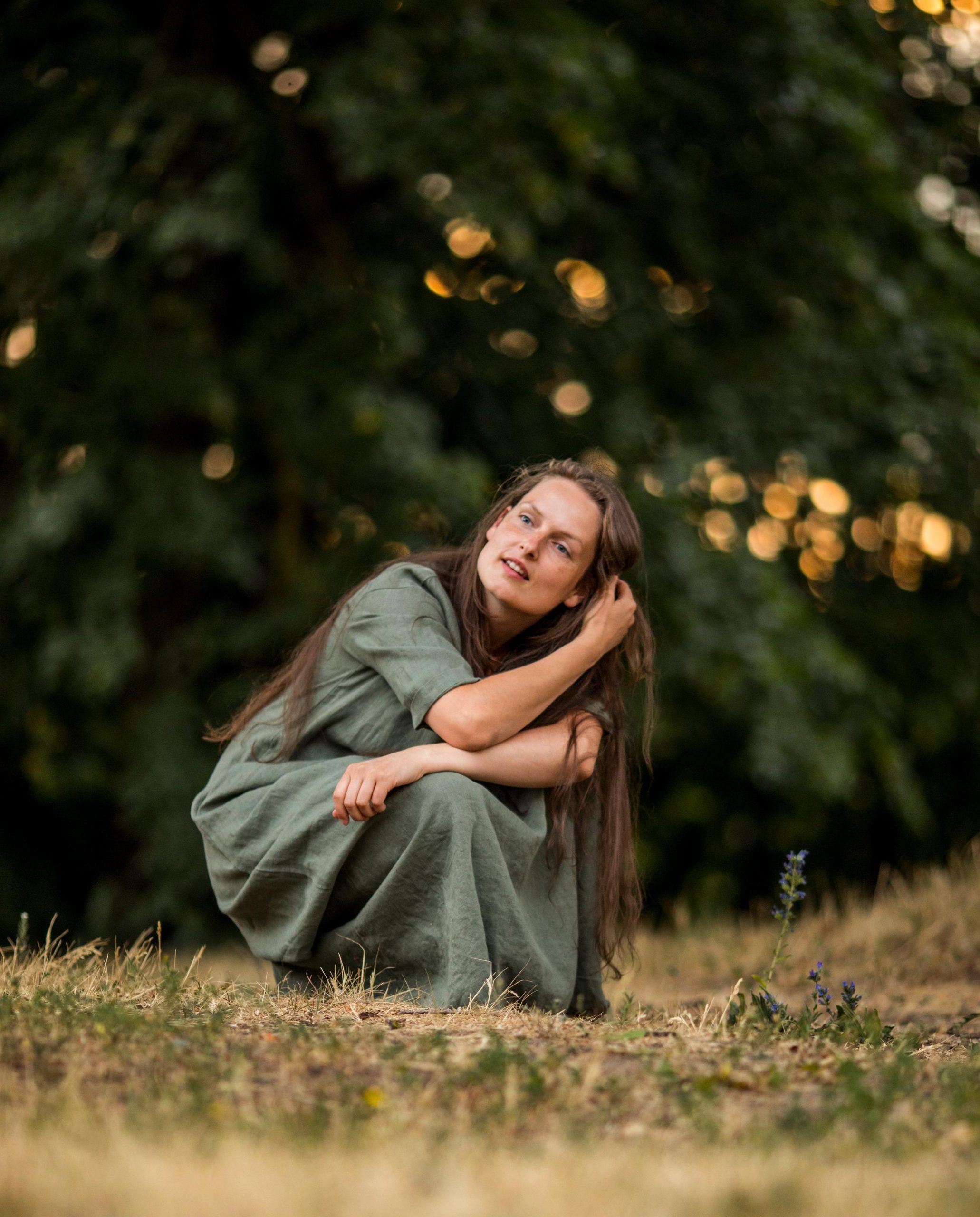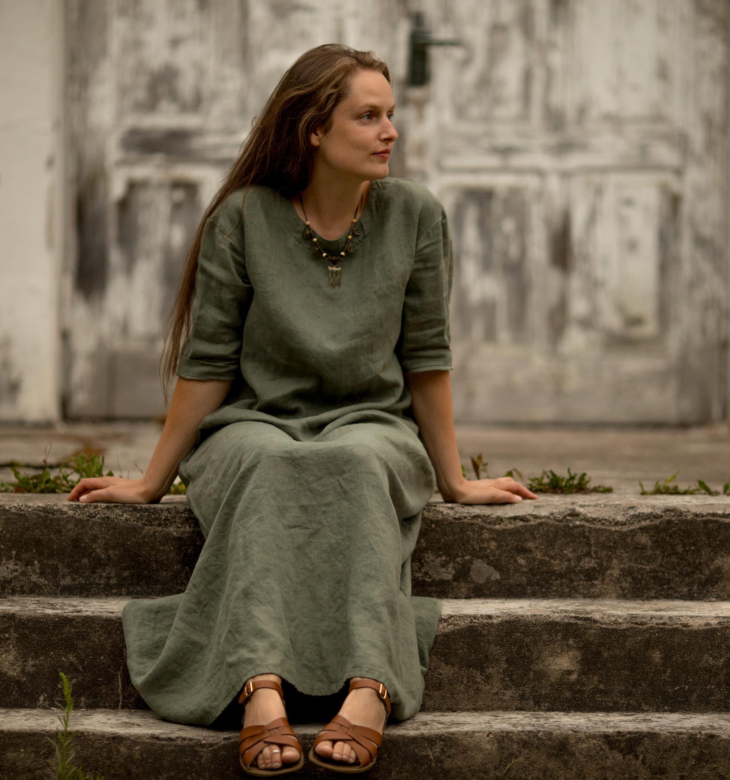 I’m wearing size S, custom length: 103cm (in Natural Flax) and 144cm (in Sage)