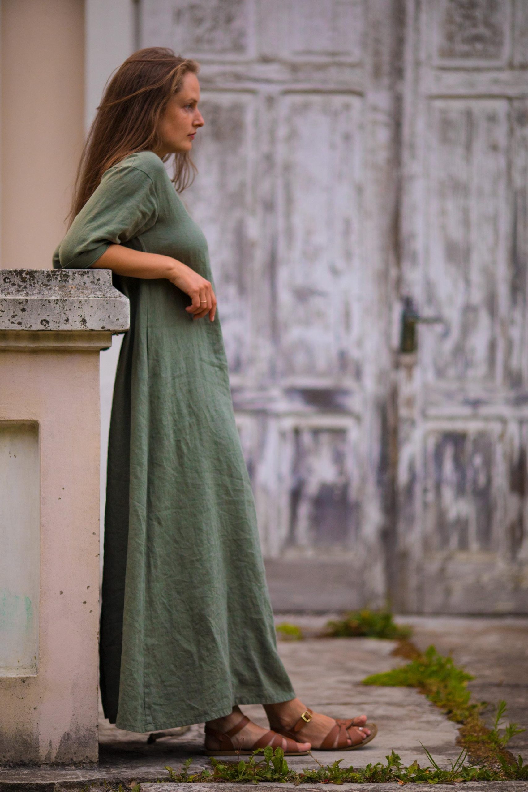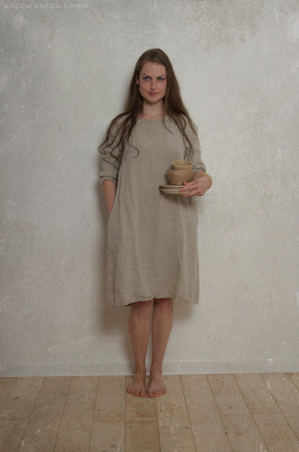 Loose linen dress with dropped shoulders, boat neckline, 3/4 sleeves, and side seam pockets.