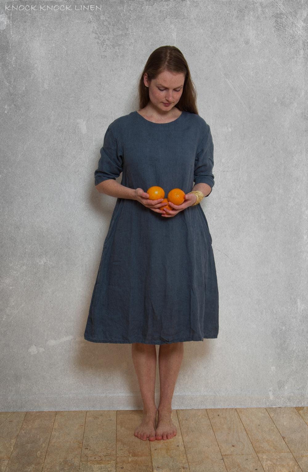 E questo è il fantastico vestito Creek, look comodo ma molto , molto femminile. Ho chiesto le maniche allungate per indossarlo nella stagione invernale. Il lino è pesante color foggy rain , dalla foto non si vede ma è un bellissimo mix di colori blu, marrone , grigio .