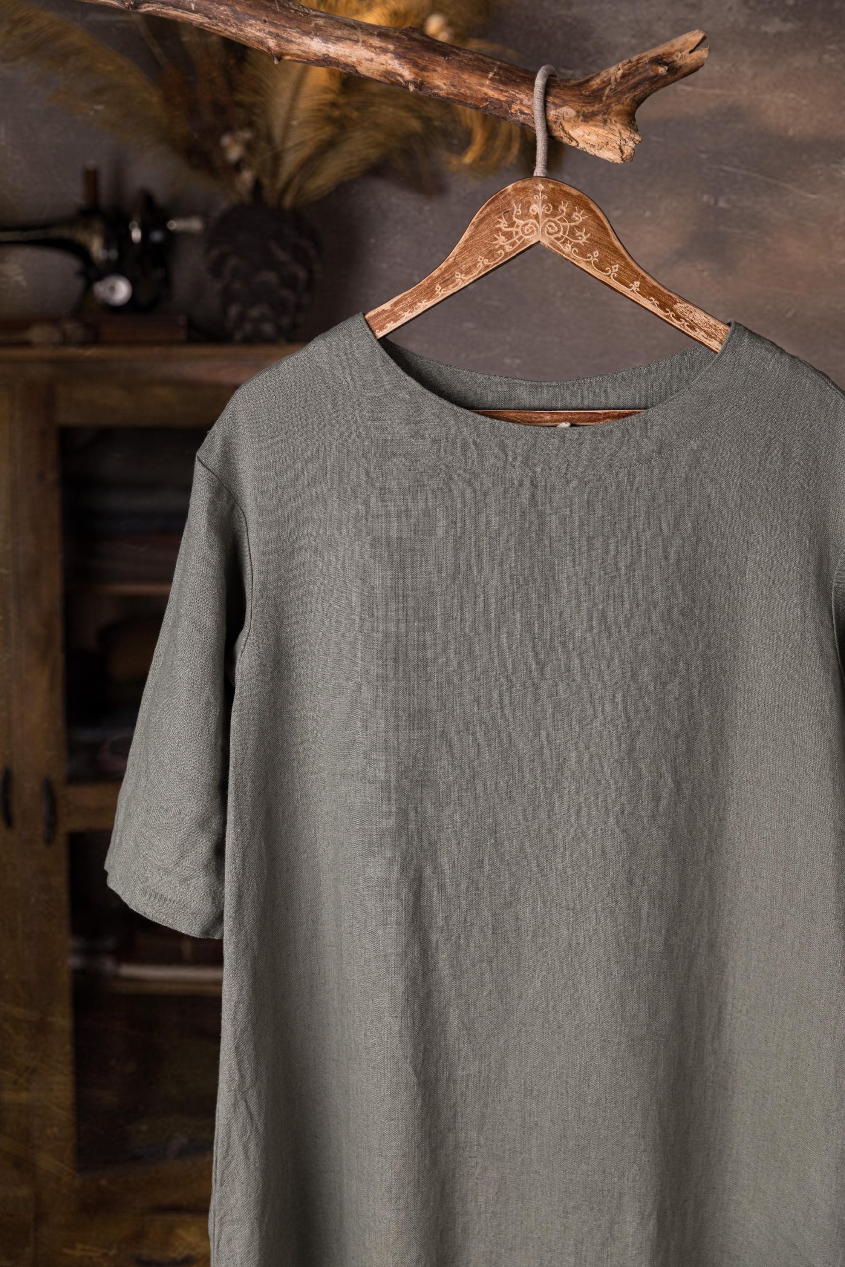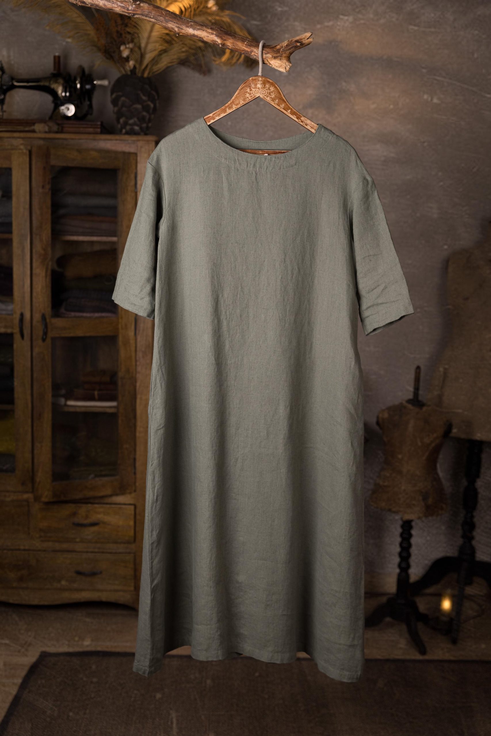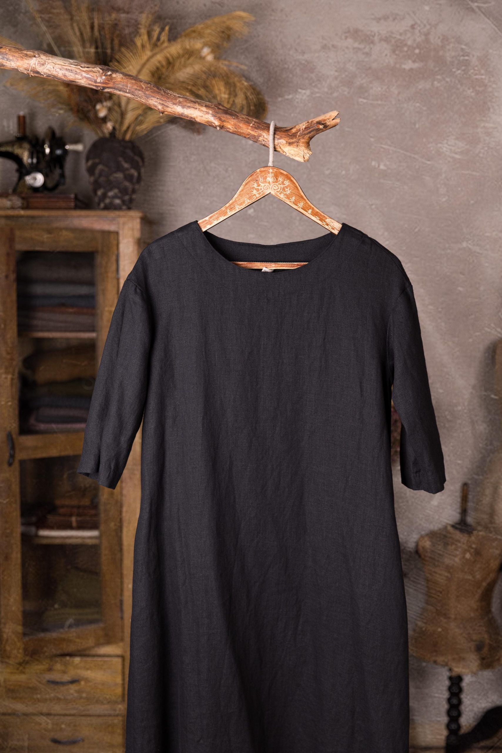 Loose linen dress with dropped shoulders, boat neckline, 3/4 sleeves, and side seam pockets.