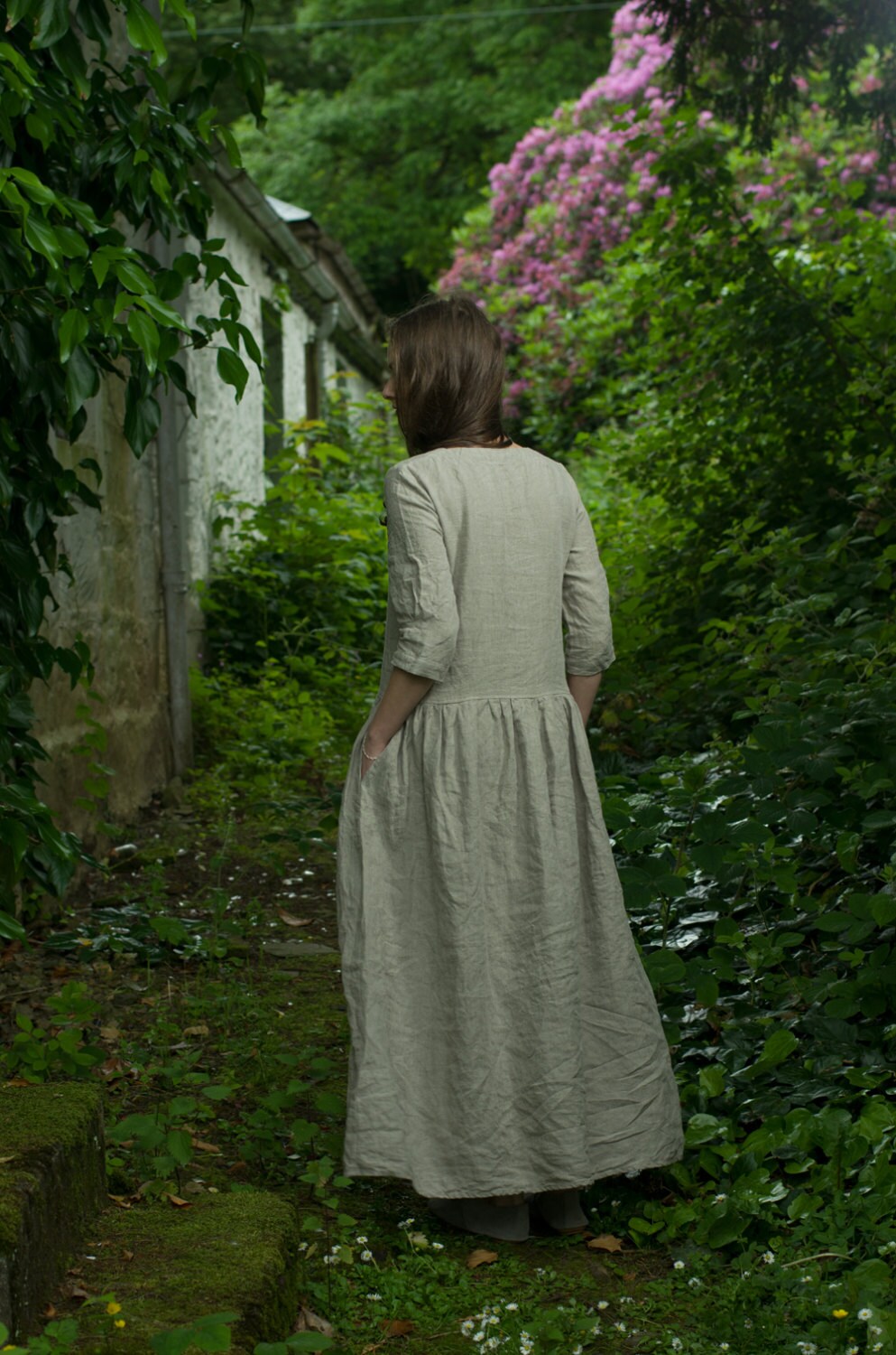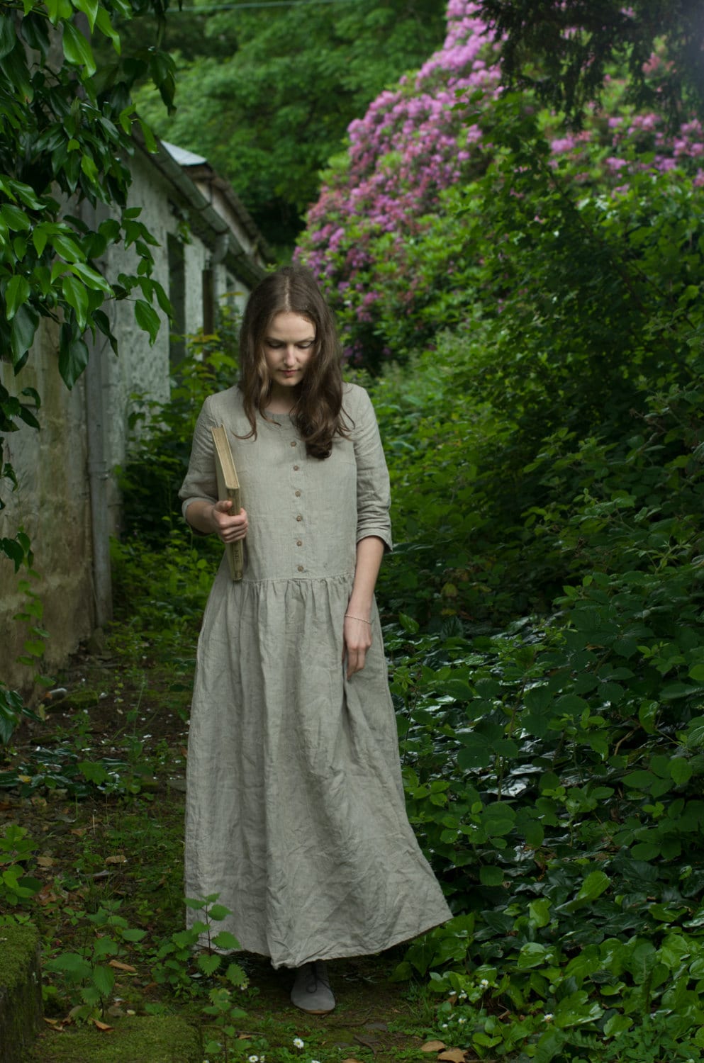 The Nostalgia dress is flattering and not form-fitting. The loose and flowy dress features a boat neckline, button-front closure, 3/4-length sleeves, side-seam pockets, and a gathered long skirt. It appears to be an antique linen dress. You can order the dress in heavyweight linen for winter or in medium and lightweight for warm weather.