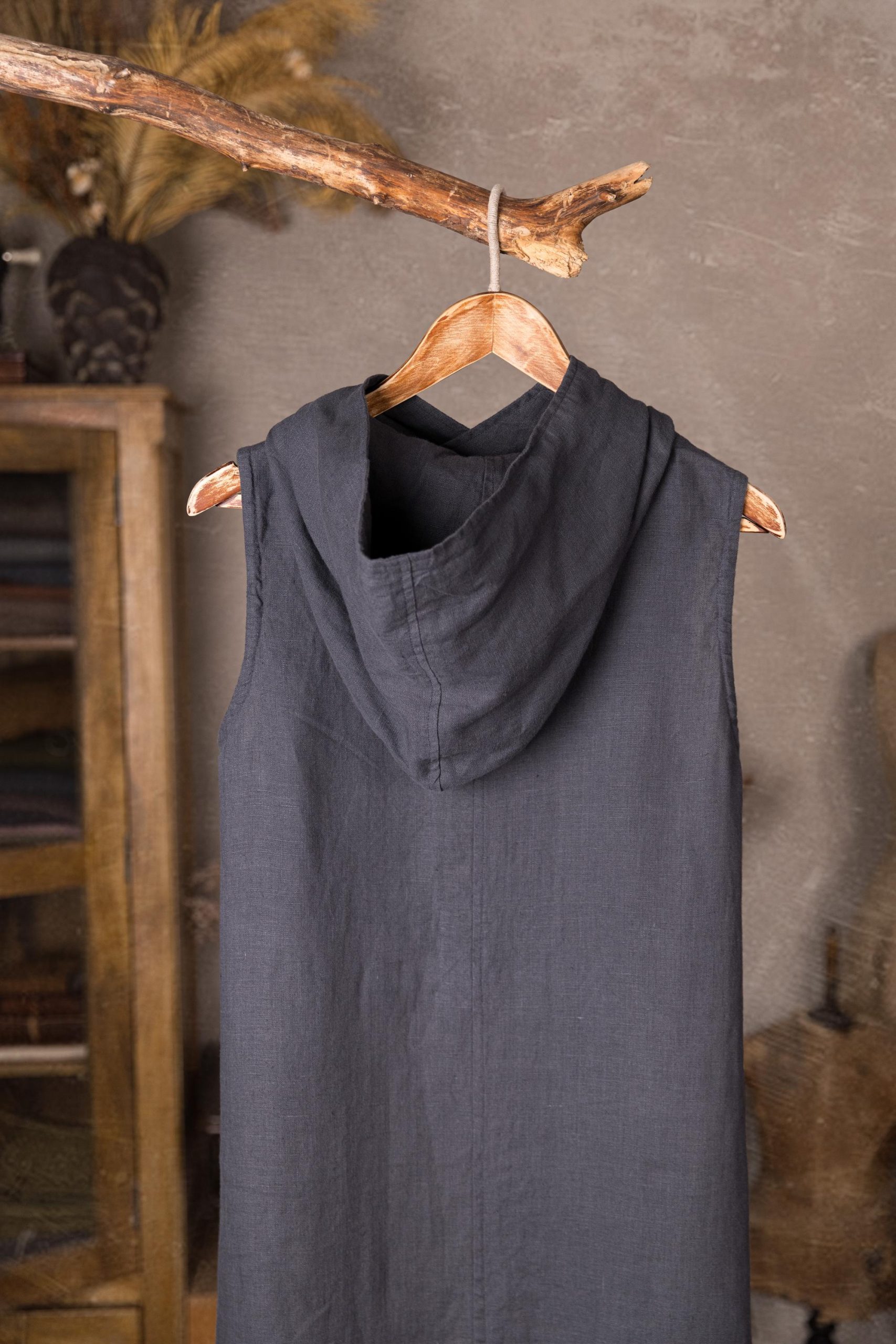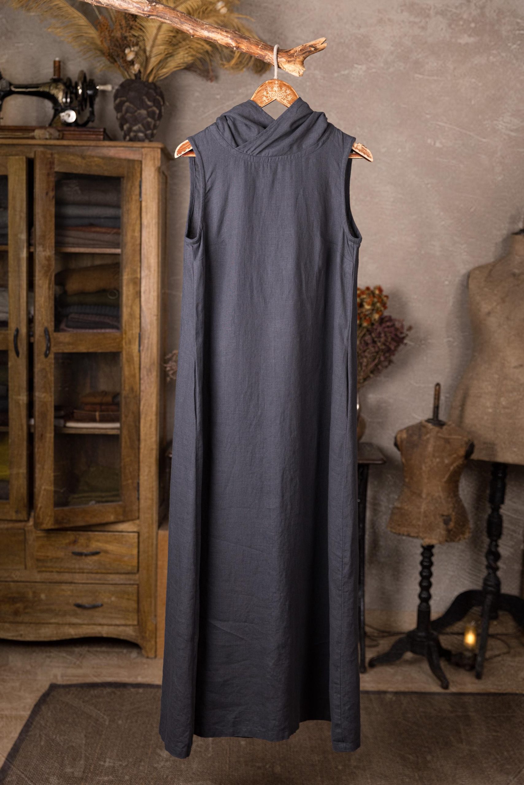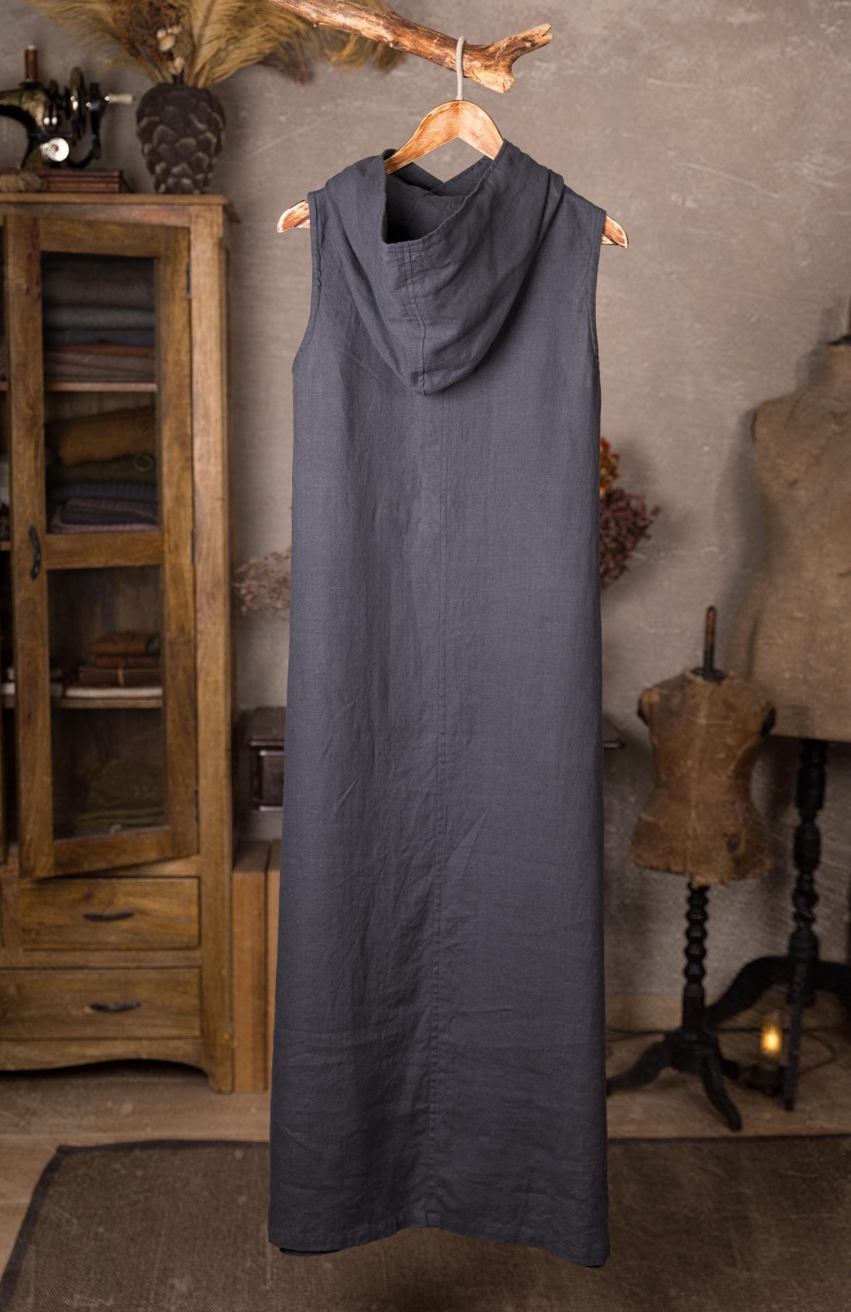 The long linen dress is crafted in a flowing, sleeveless silhouette. It features deep armholes, a large hood that adds a touch of mystery, and practical side-seam pockets for comfort and ease.