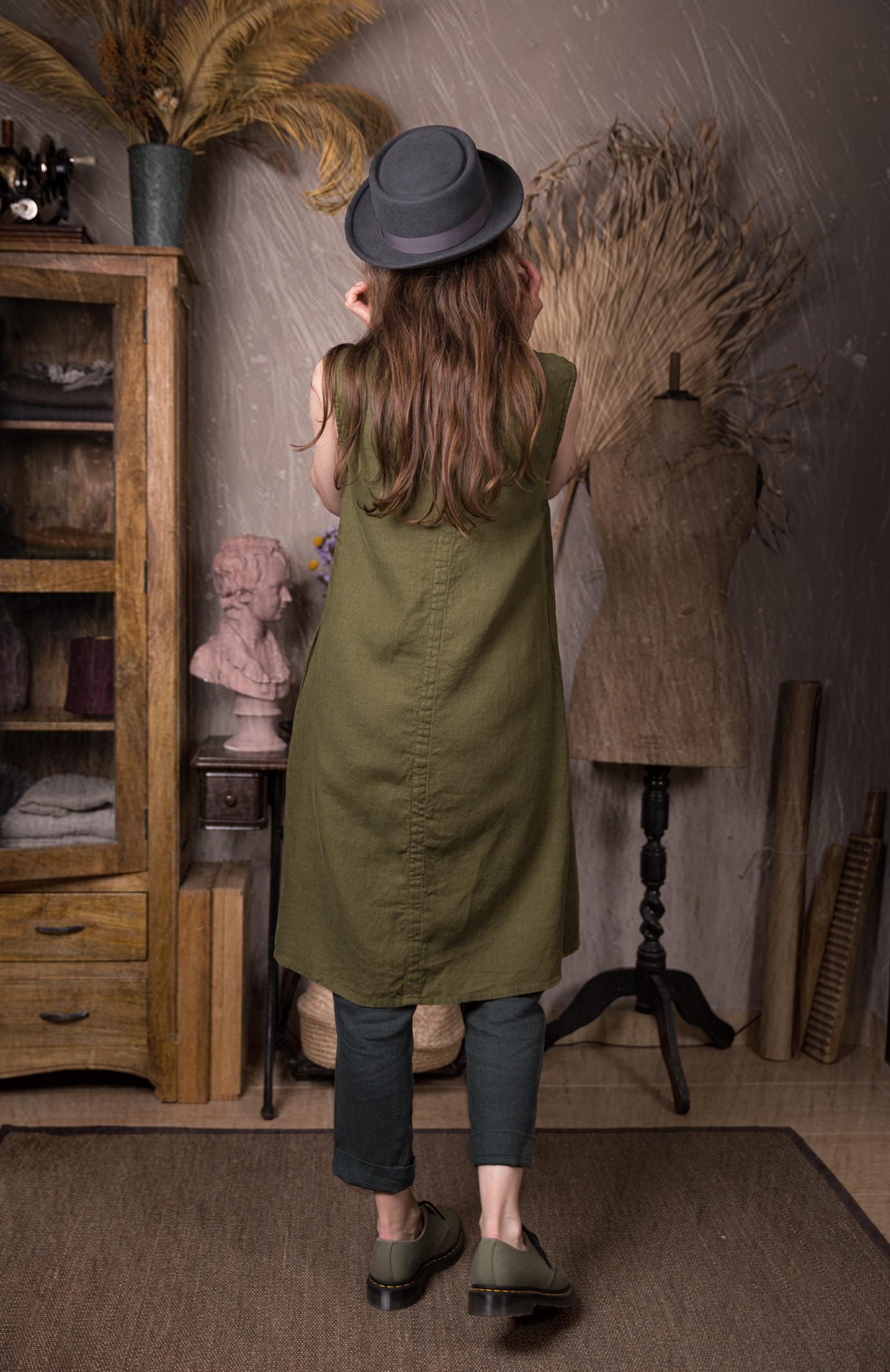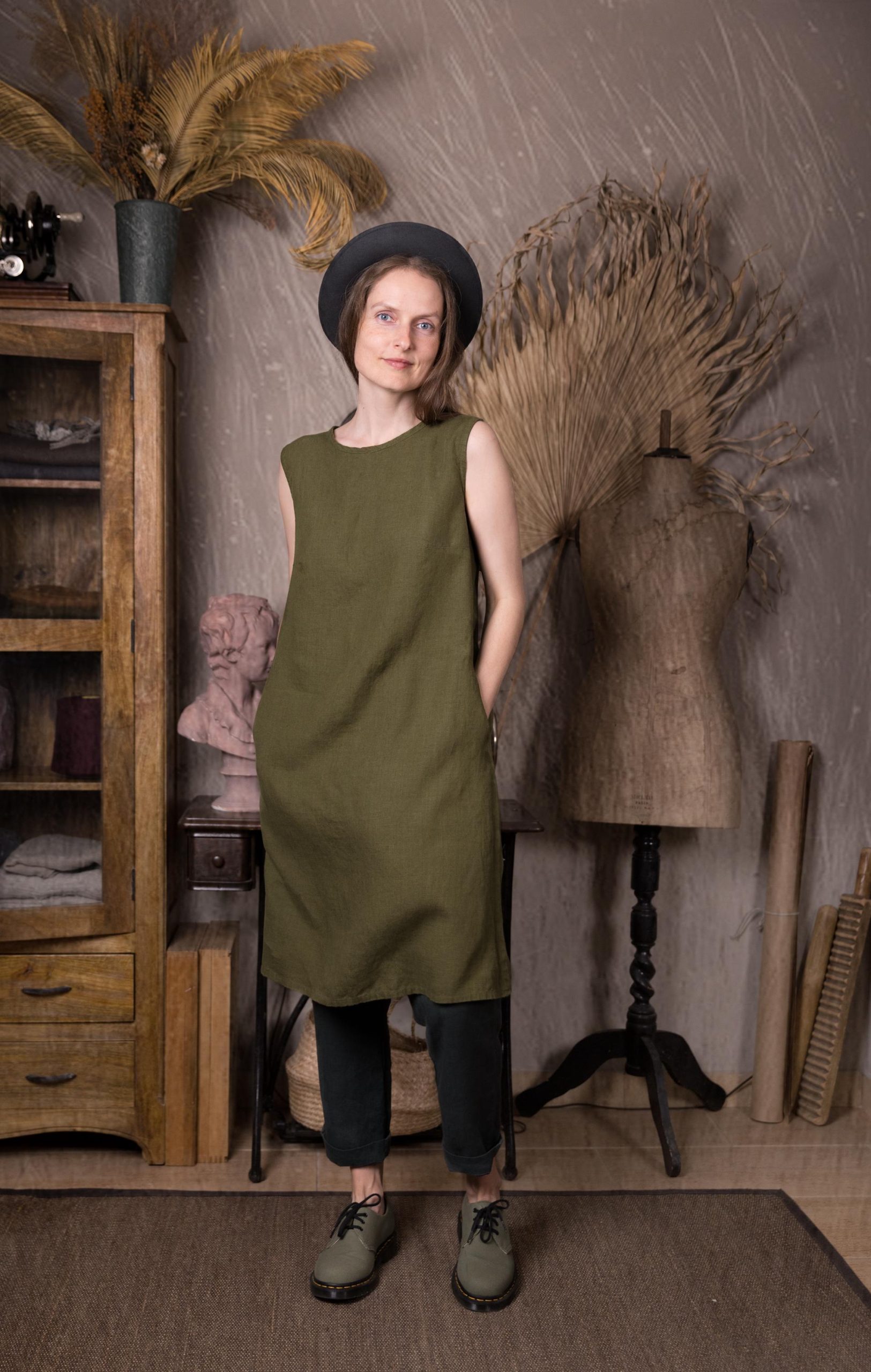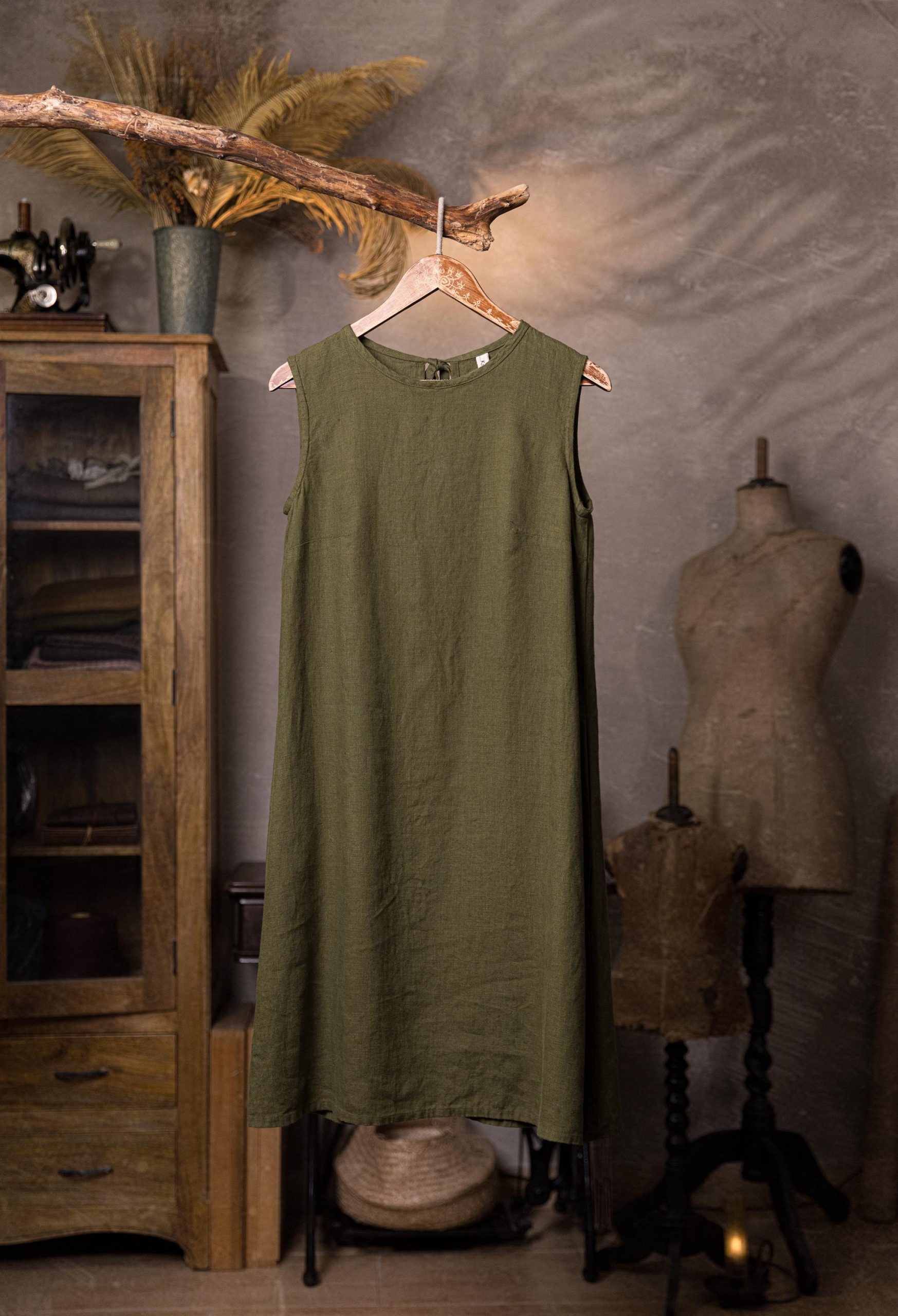 Linen sleeveless dress with an A-line silhouette. Noteworthy for its back tie opening and discreet inseam side pockets, this dress is a chameleon: adorn it with accessories for an artistic flair, or wear it as is for a minimal and elegantly chic look. This versatile piece effortlessly adapts to your style, making it a wardrobe essential for any occasion.