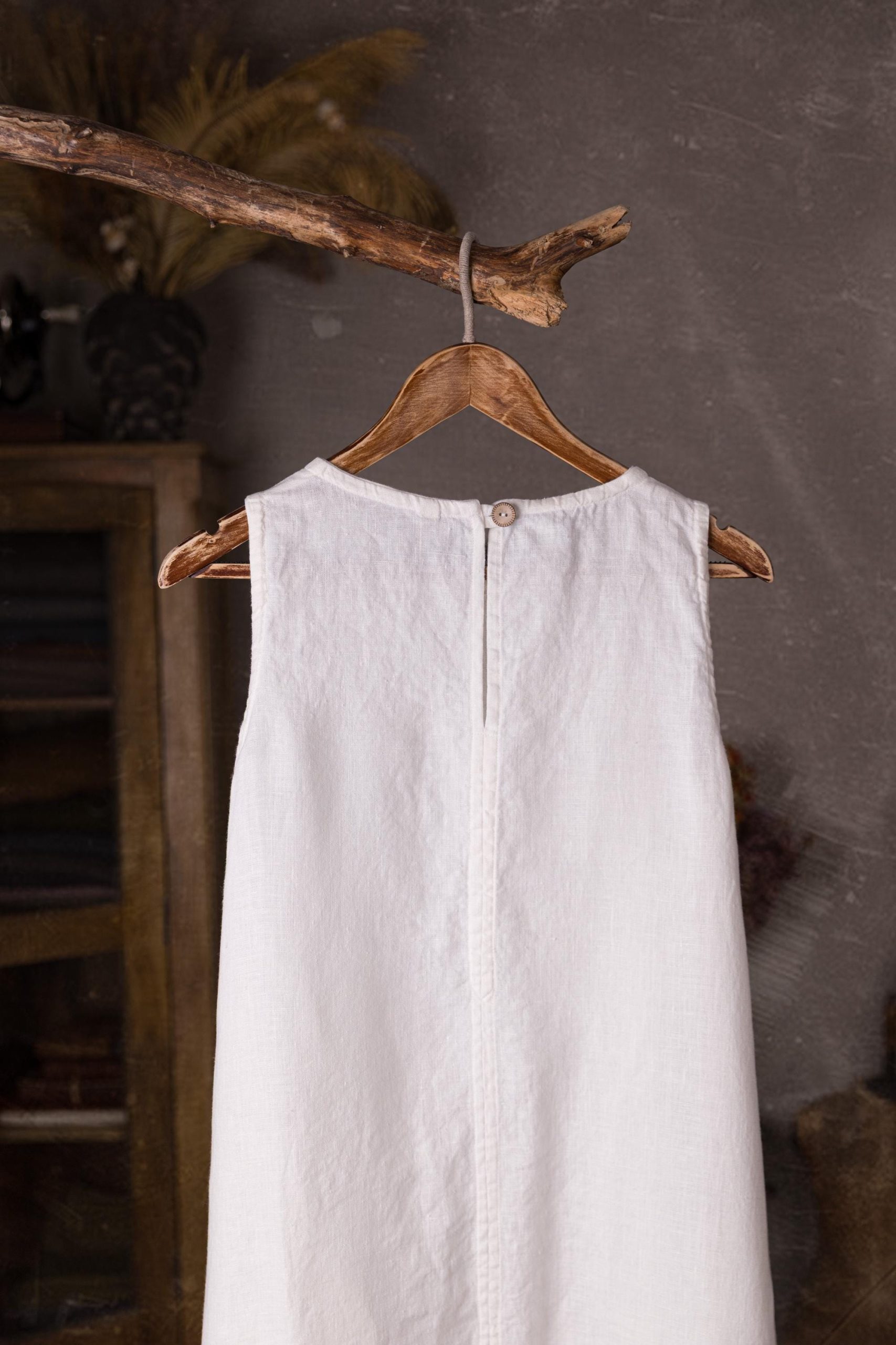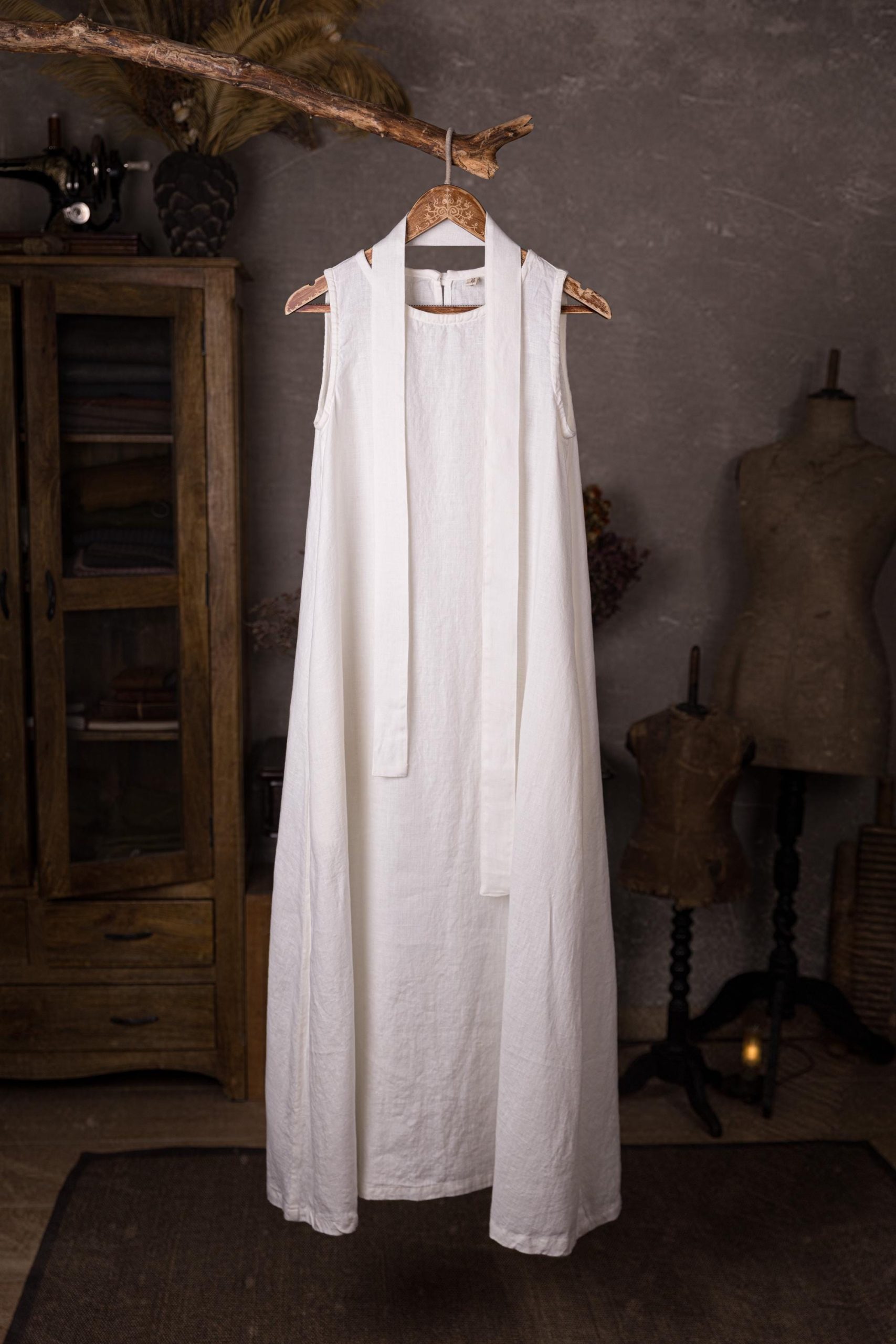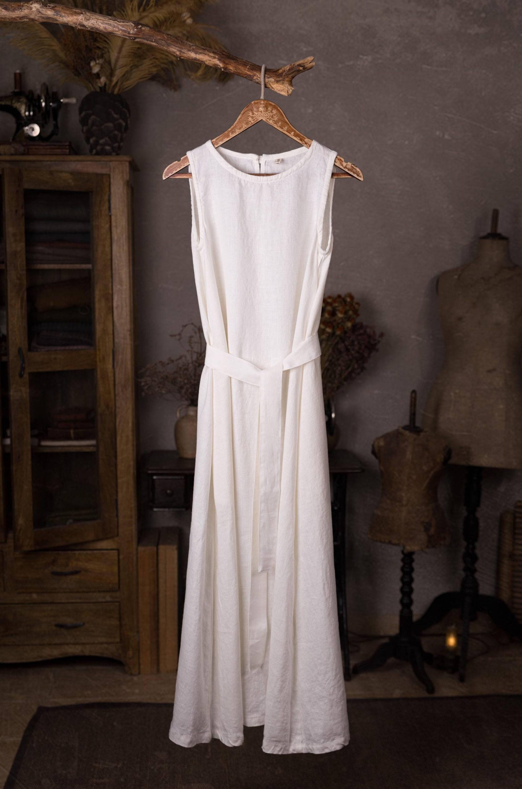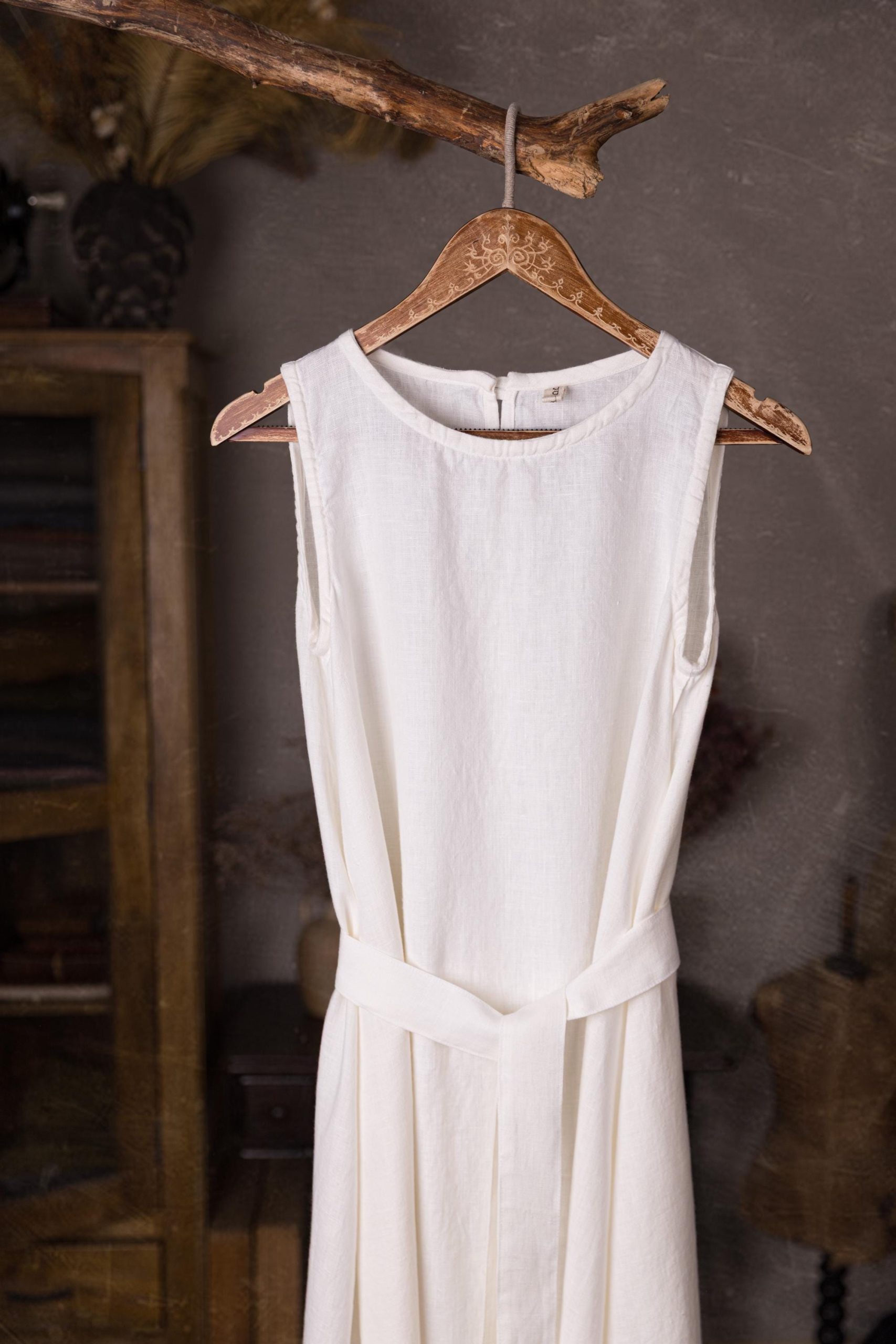 The Monk dress is made of pure linen fabric. A loose, trapeze silhouette in maxi length, boat neckline, one button closure on the back, sleeveless, tie belt, and side seam pockets for comfort.