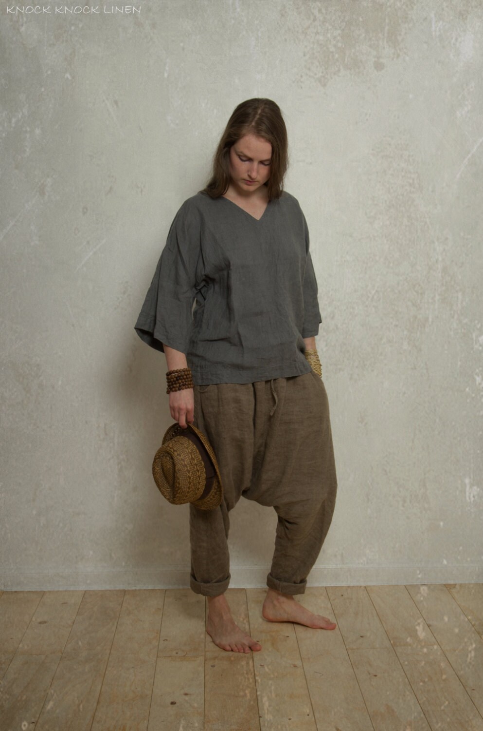 Very comfortable, extra roomy linen blouse with V-neck made of high-quality linen fabric. It can be worn as a simple and minimal summer top. Also, you can create a boho style using accessories and a straw bag.