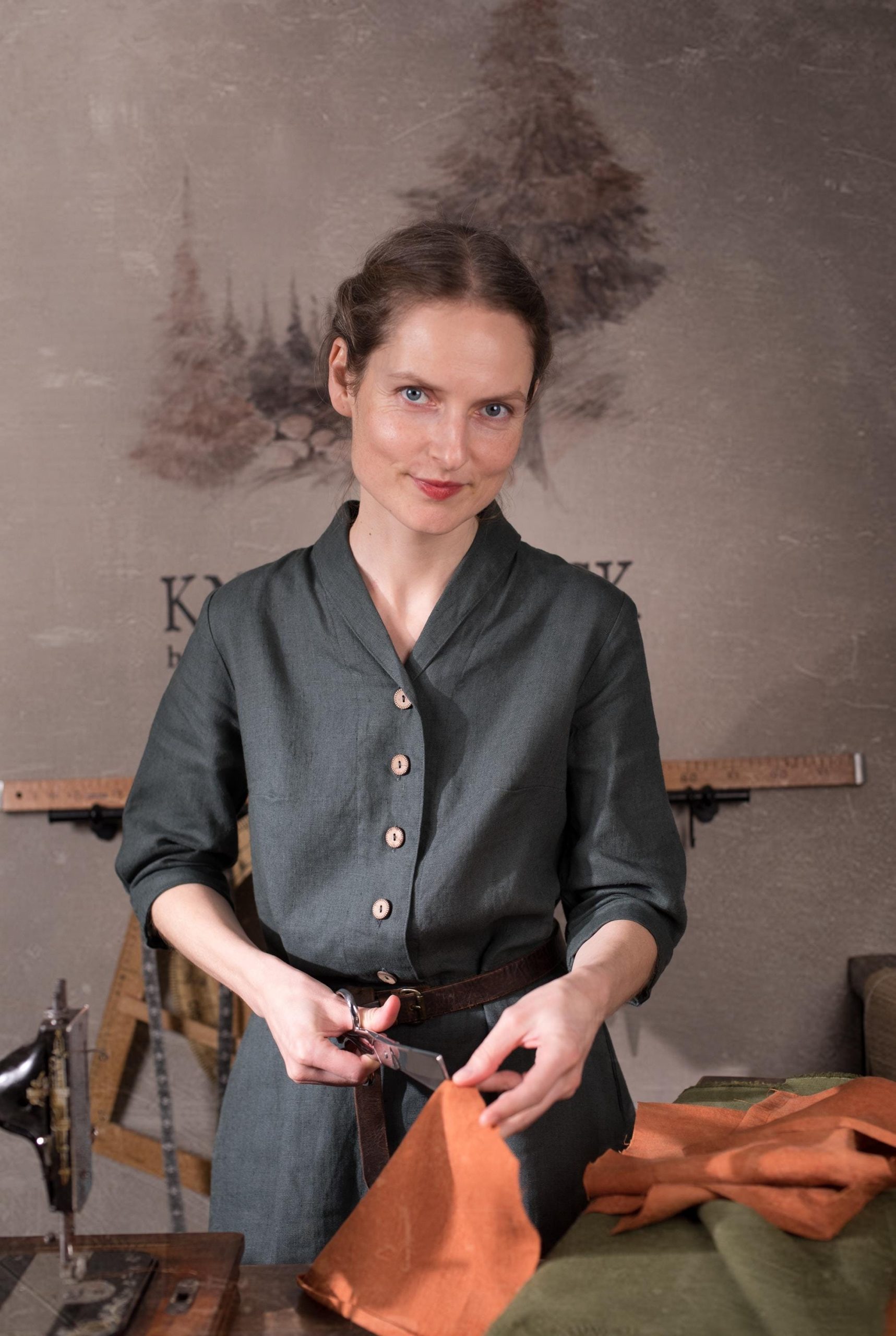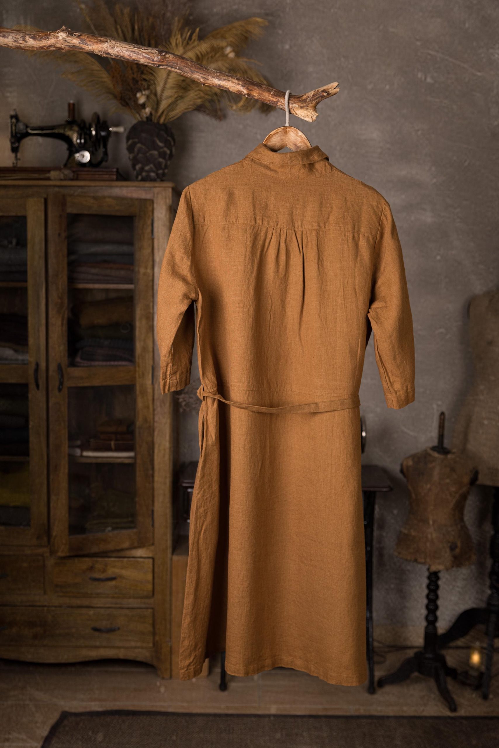 The retro linen dress Studio is a timeless and iconic piece from the 1930s-1940s. This classic dress has a simple yet flattering shape and features a buttoned bodice, V-neck with a shawl collar, 3/4-length sleeves, side seam pockets for comfort, a tie belt, and a below-the-knee length, but it can also be made in a custom length.