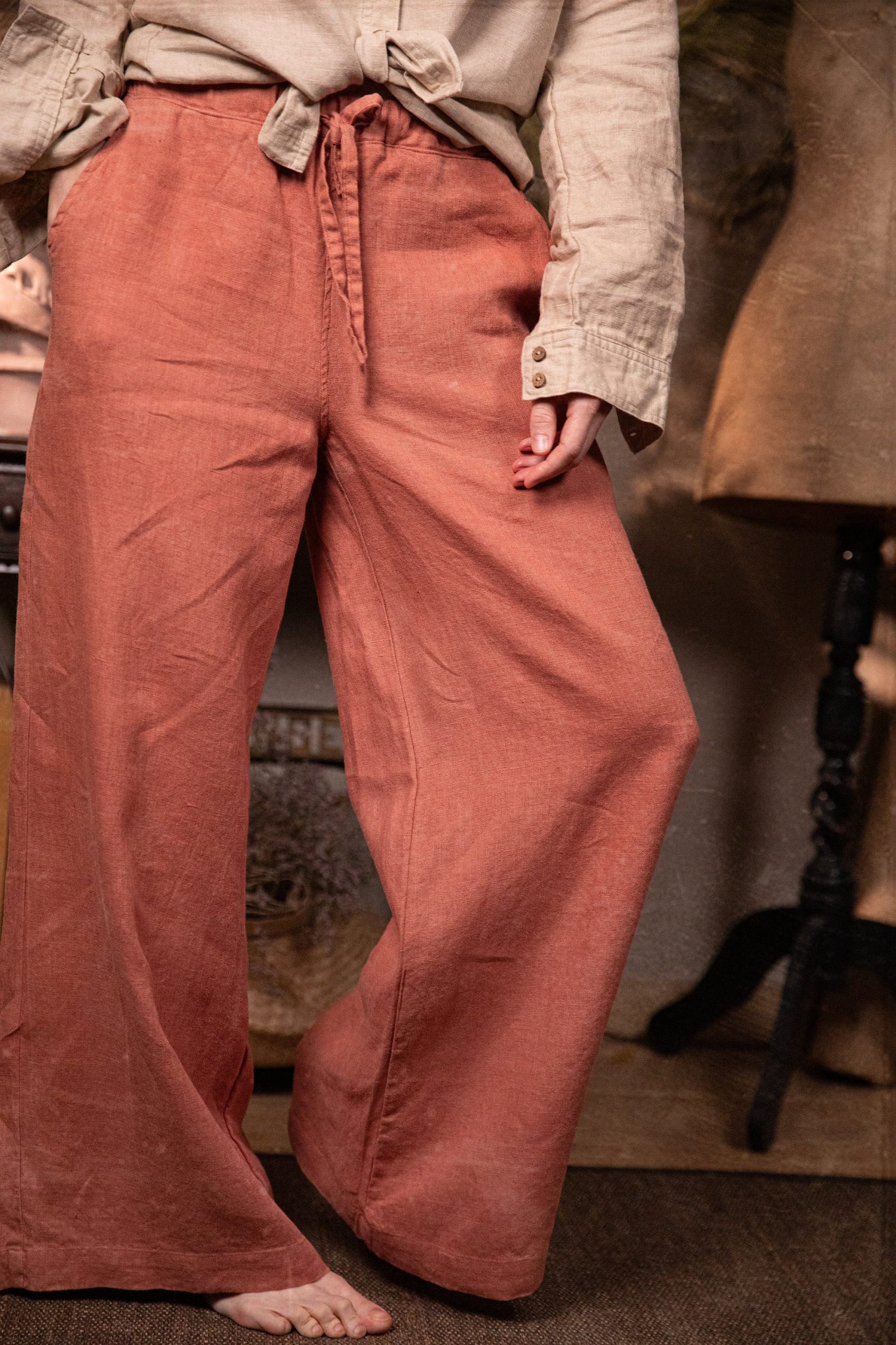 A pair of palazzo trousers featuring an elastic drawstring waist and side pockets, crafted from certified European flax.