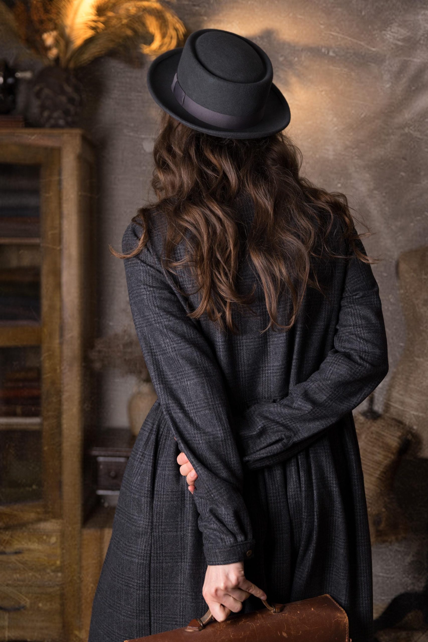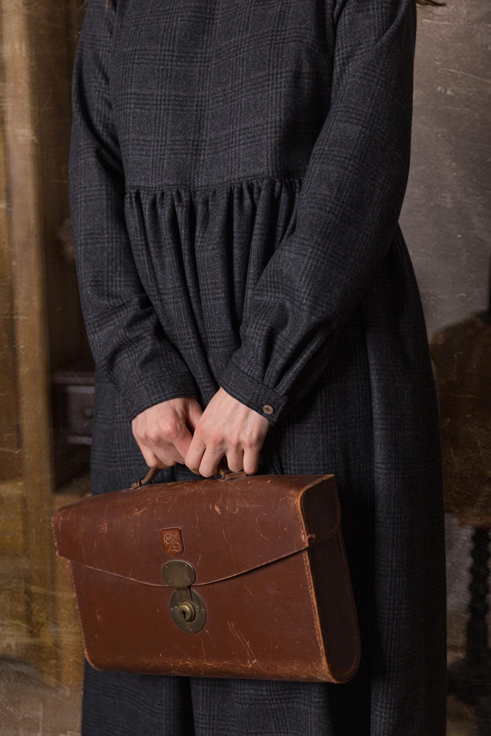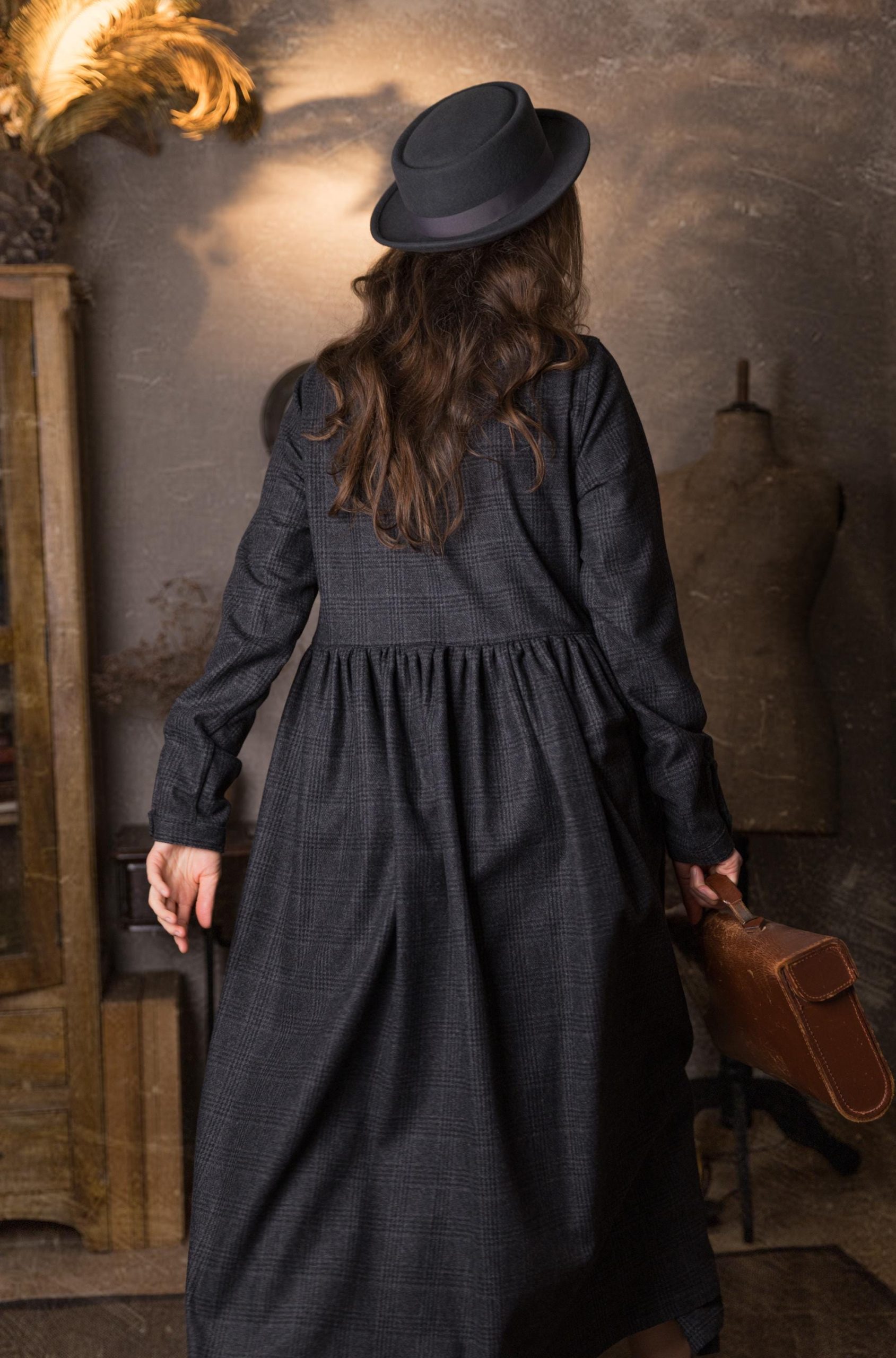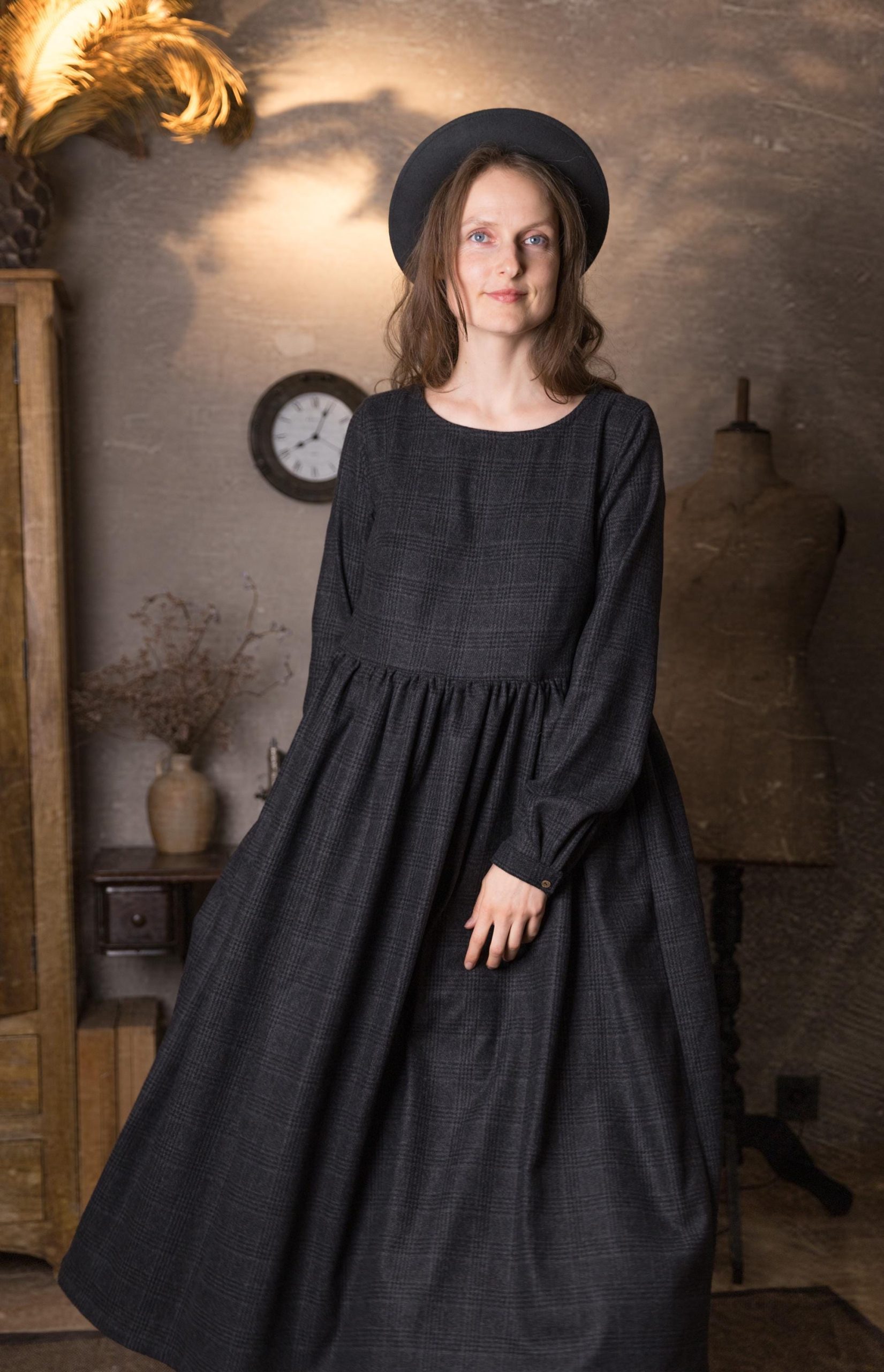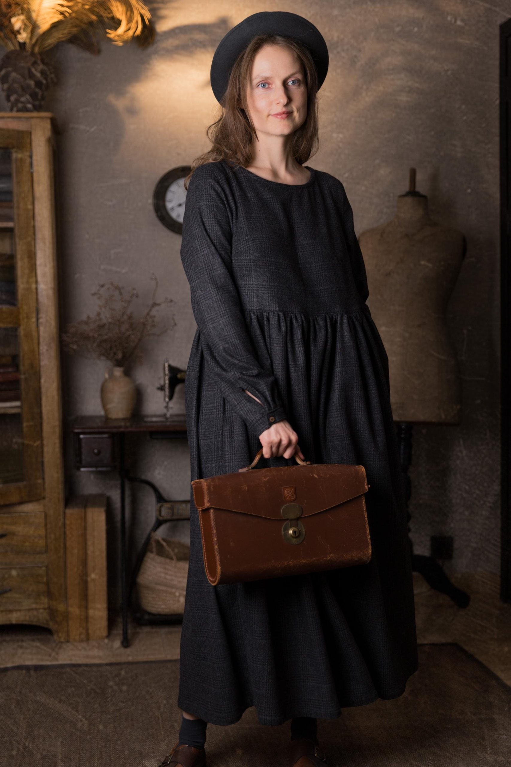 This long sleeve woolen dress is a comfortable yet feminine dress, crafted from wool/cotton blend fabric. It features a graceful boat neckline, a high waistline with a gathered skirt, and practical side seam pockets. The long, loose sleeves are finished with a delicate coconut button. Available in custom length.